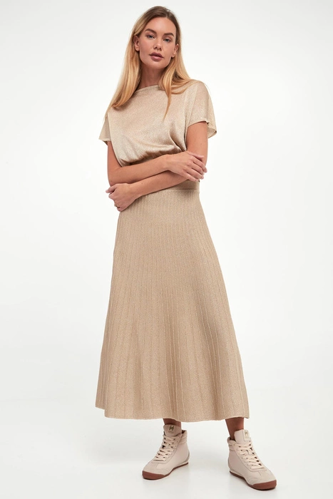 Plisowana spódnica Marella w typie solejki daje dużą swobodę ruchu i wygląda szalenie kobieco. Model ETERE został wykonany z wielobarwnej tkaniny i przeszyty połyskującą nicią. Pasuje zarówno do sportowych sneakersów, jak i bardziej eleganckich butów.