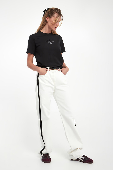 Flare jeans Versace wyróżniają się szalenie modnymi, szerokimi nogawkami w stylu retro. Mają wyglądać tak, jak gdyby były kilka rozmiarów za duże. Topowi projektanci zestawiają tego typu fasony jeansów z butami na wysokich platformach i wzorzystymi koszulami z wiązaniem pod szyją. Kolejny model jeansów od Versace, choć również czarny, wyróżnia się dopasowanymi nogawkami i złotym printem, w charakterystycznym dla tej marki barokowym stylu.