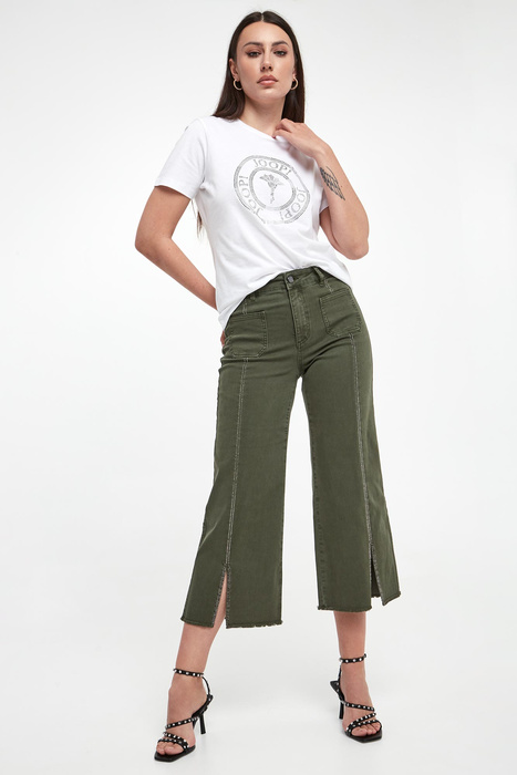 Na pewno masz w swojej szafie niejedną ulubioną parę jeansów, ale wciąż - tak jak każda z nas - oglądasz się za wyjątkowymi modelami. Właśnie takie spodnie jeansowe damskie znajdziesz w ofercie Velpa.pl. Chcesz się wyróżnić i przemierzać miasto w najmodniejszej parze? Zapomnij o rurkach. Postaw na czarne jeansy flare z kolekcji Versace Jeans Couture, z kieszeniami z przodu, zdobionymi złotymi klamrami.
