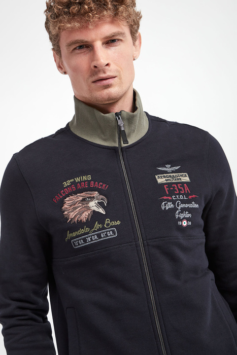 Bluzy rozpinane AERONAUTICA MILITARE - czarne, szare czy granatowe - wykończone są stójką, dzięki czemu świetnie podkreślają męską sylwetkę i pasują do spodni dresowych w tym samym kolorze. Aplikacje i hafty z logo marki nadają im unikatowego charakteru w niepowtarzalnym stylu AERONAUTICA MILITARE.