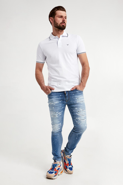 Wygodna w codziennym noszeniu koszulka polo, w wersji sportowej lub bardziej eleganckiej, jest niezastąpiona o każdej porze roku. Koszulki polo Emporio Armani wykonane z wysokiej jakości bawełny z domieszką elastanu. Powoduje to, że są miękkie w dotyku, wygodne i lekko elastyczne. Ich rękawy wykończone są ściągaczem. Wygodna i interesująco zaprojektowana koszulka polo z aplikacją z logo marki sprawi, że poczujesz się w niej jak w drugiej skórze! Świetnie prezentuje się sama, jak i w towarzystwie marynarki. Koszulkę możesz uzupełnić designerskimi spodniami oraz butami. Jeśli dodasz do tego nietuzinkową torbę lub plecak, będziesz perfekcyjnie się prezentował.