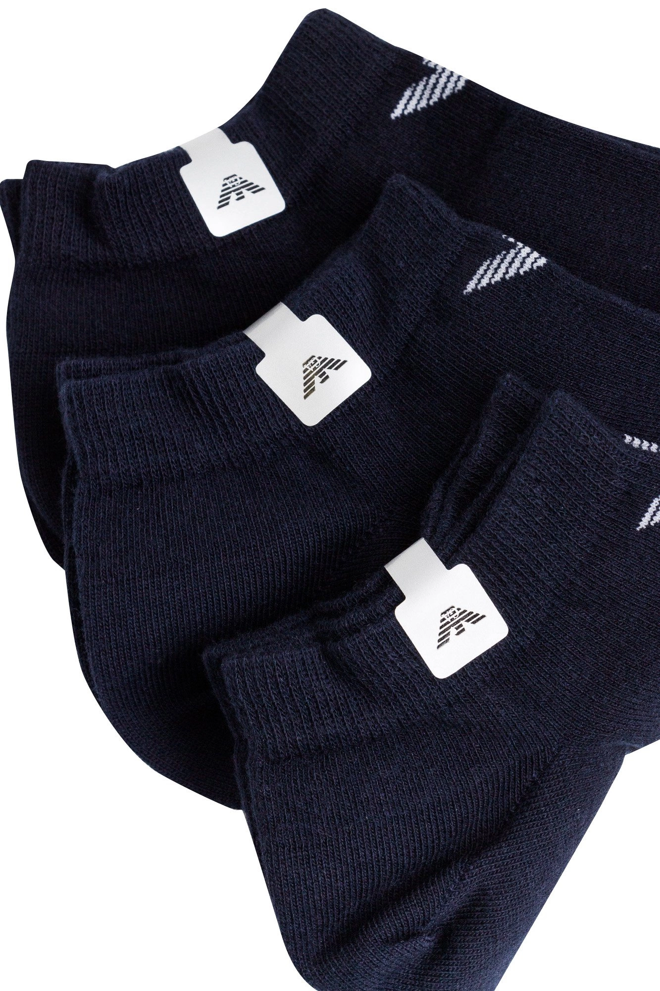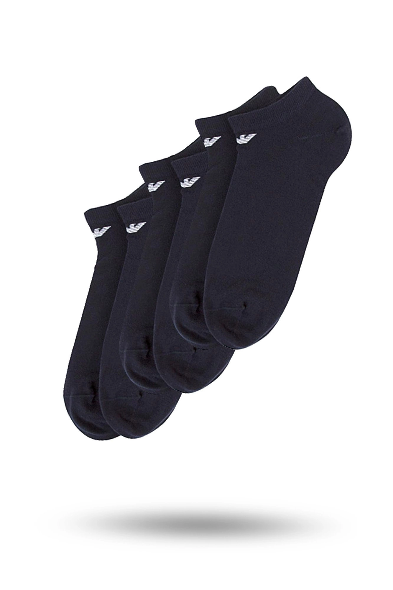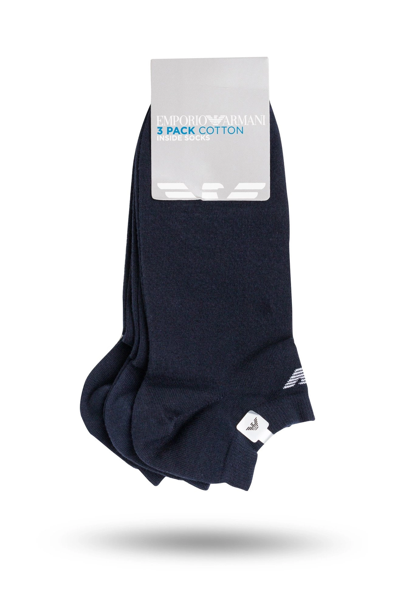 Krótkie skarpety w kolorze granatowym. W opakowaniu trzy pary. Wykonane z bawełny z domieszką elastanu. Zakończone delikatnym ściągaczem, poniżej którego znajduję się wyszyte logo marki w kolorze białym.