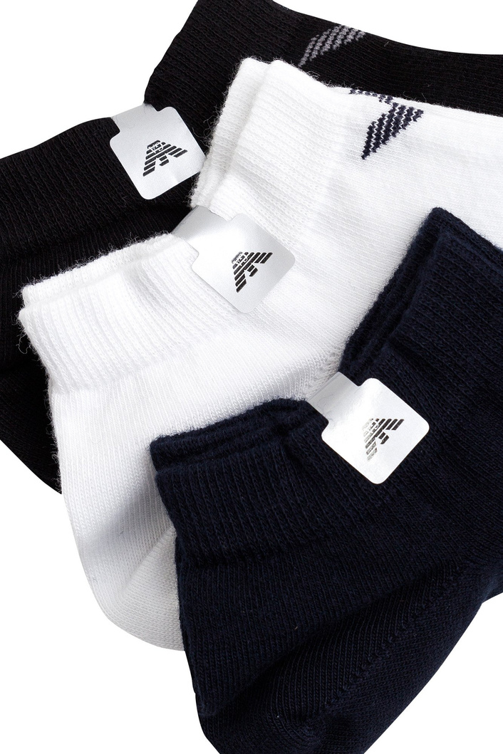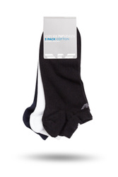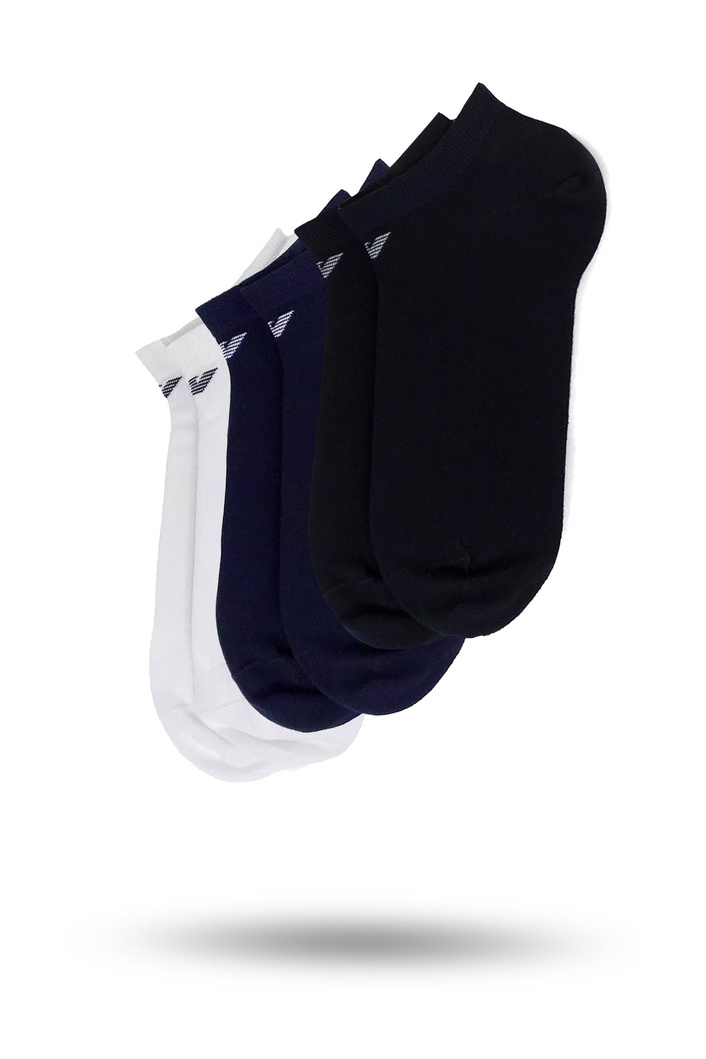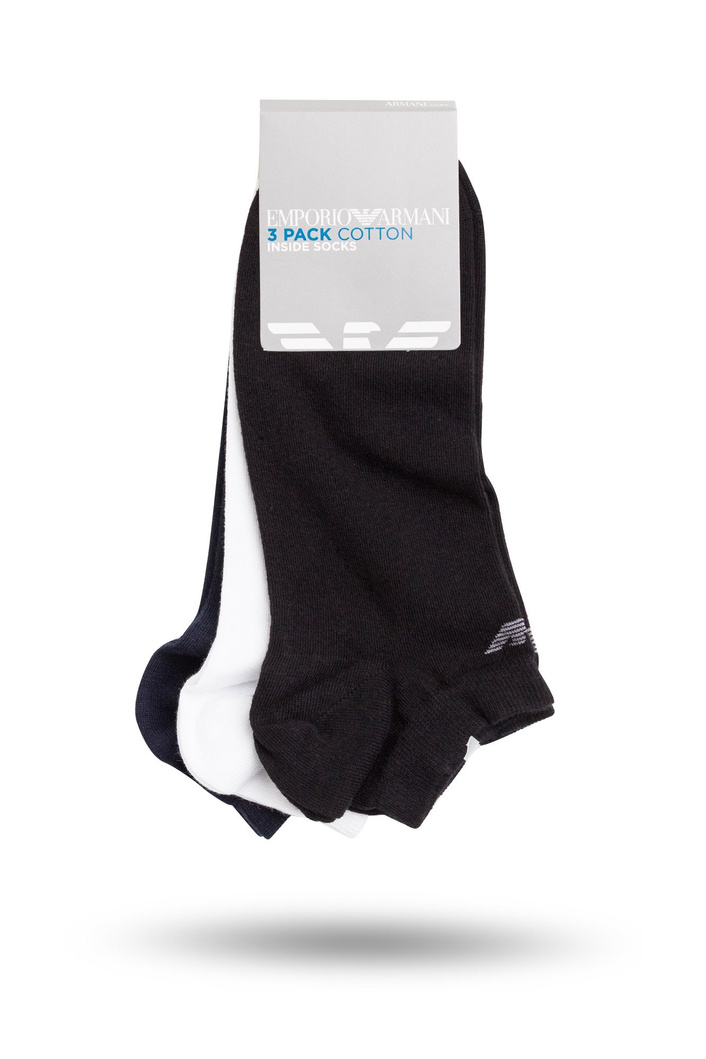Krótkie skarpety w kolorach: czarnym, granatowym oraz białym. W opakowaniu trzy pary. Wykonane z bawełny z domieszką elastanu. Zakończone delikatnym ściągaczem, poniżej którego znajduję się wyszyte logo marki.
