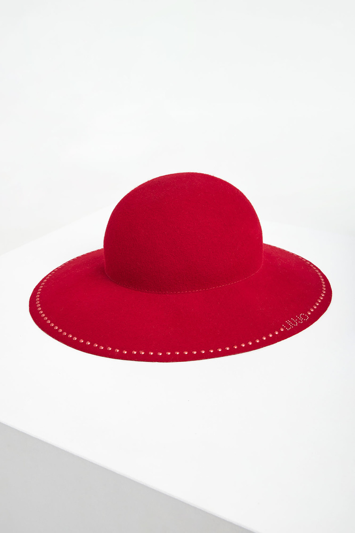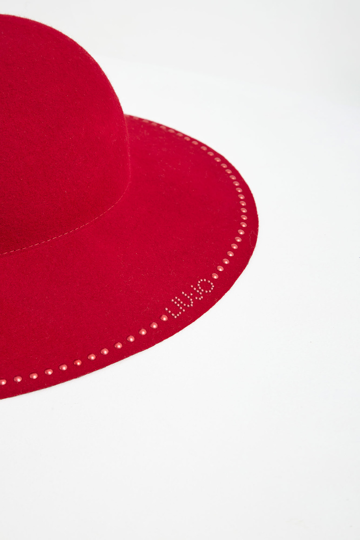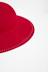 Kapelusz marki Liu Jo w czerwonym kolorze. Wykonany ze stuprocentowej wełny. Okrągła korona. Szerokie rondo z dżetami i nazwą marki wzdłuż brzegu. Wnętrze wykończone wszytą taśmą.
