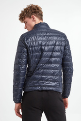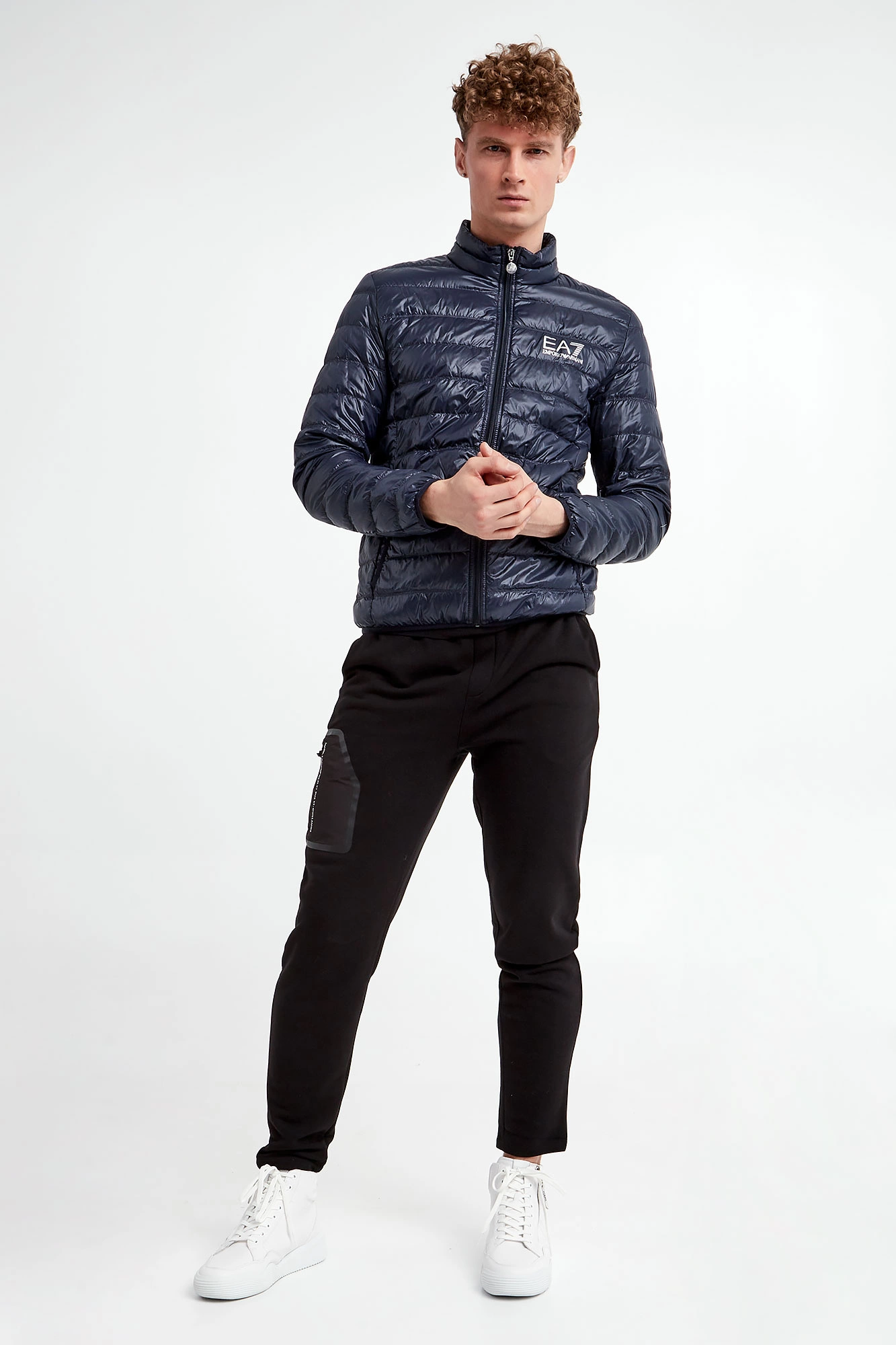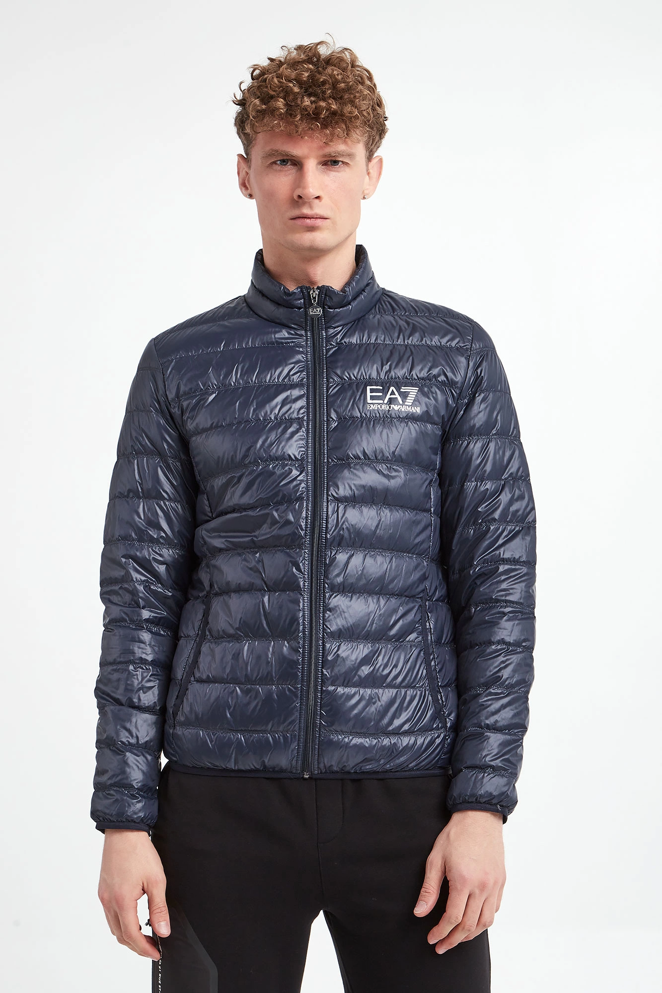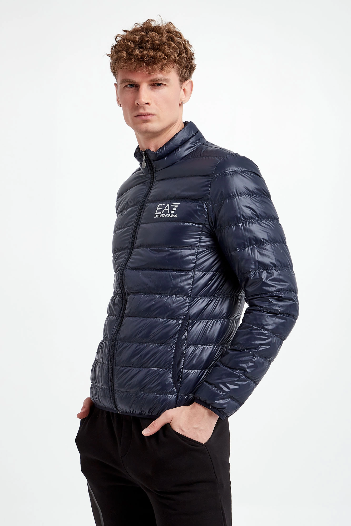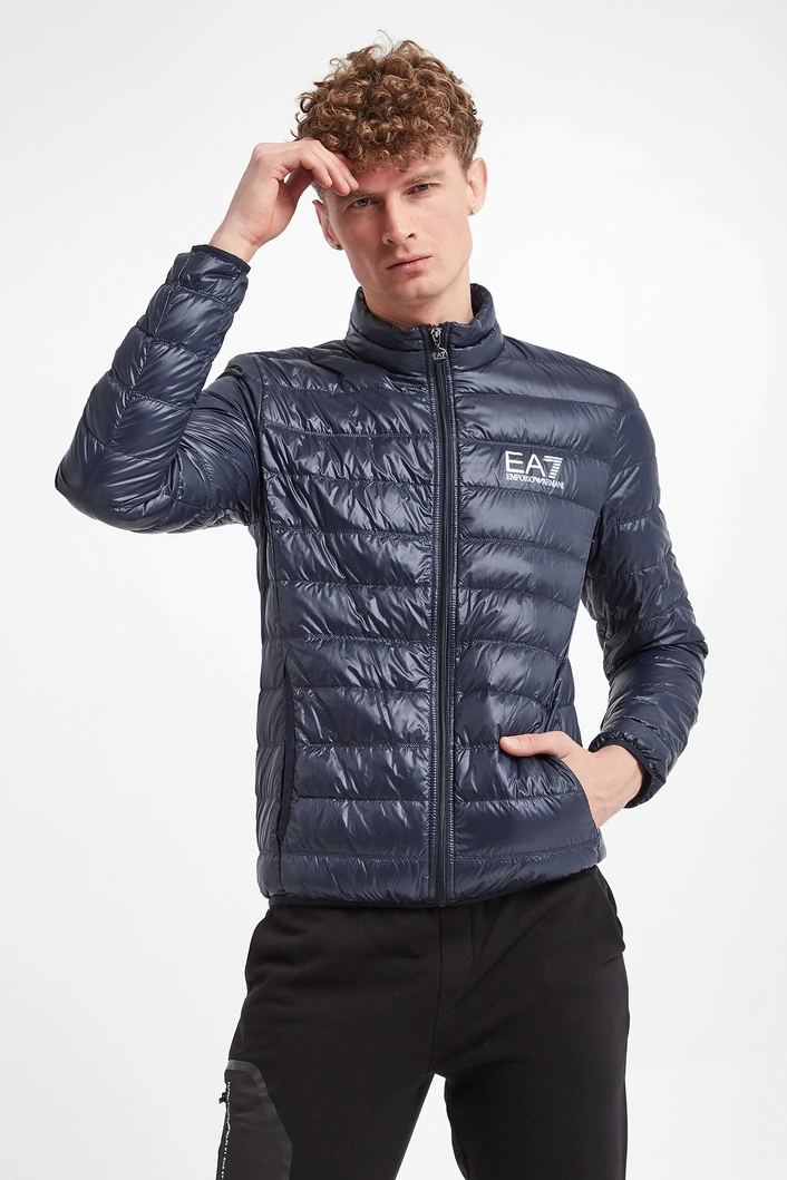 Kurtka puchowa marki EA7 Emporio Armani w granatowym kolorze. Całość pikowana. Na przodzie srebrny nadruk w postaci logo marki. Zapinana za pomocą zamka z logowanym suwakiem. Model z dwiema kieszeniami. Kurtka ocieplona pierzem. Wykończona lamówką. Fason typu slim.