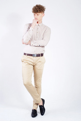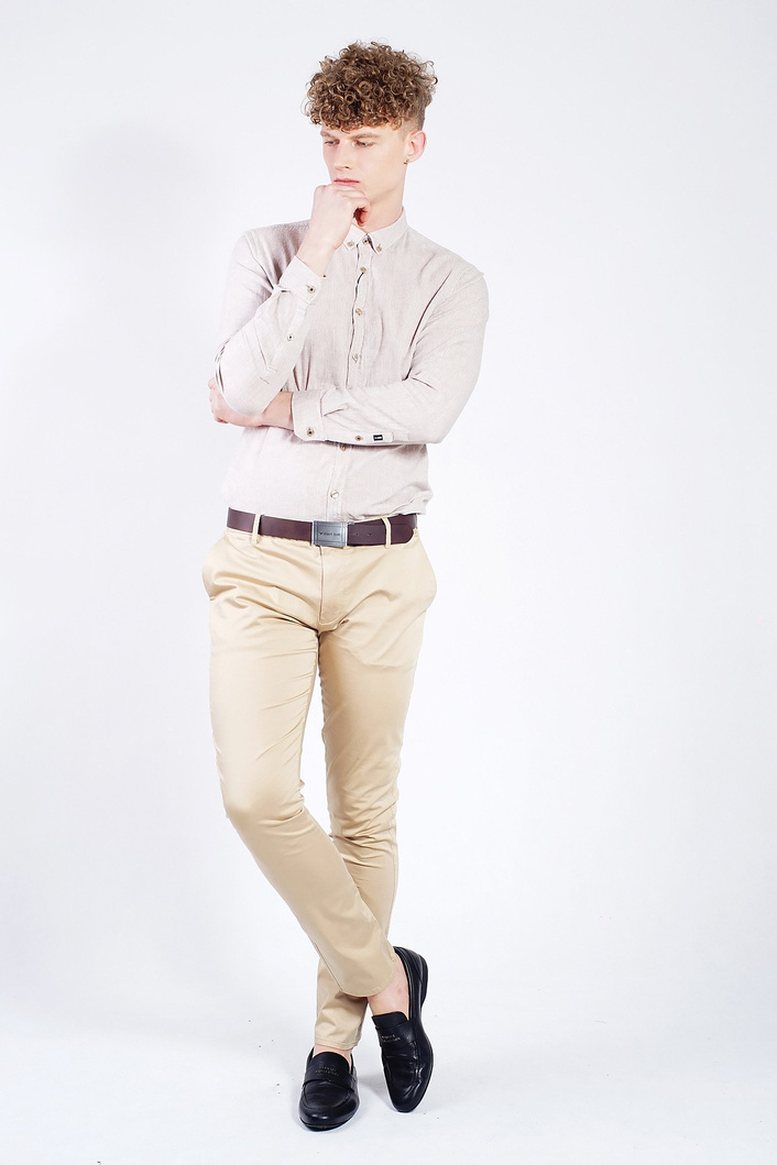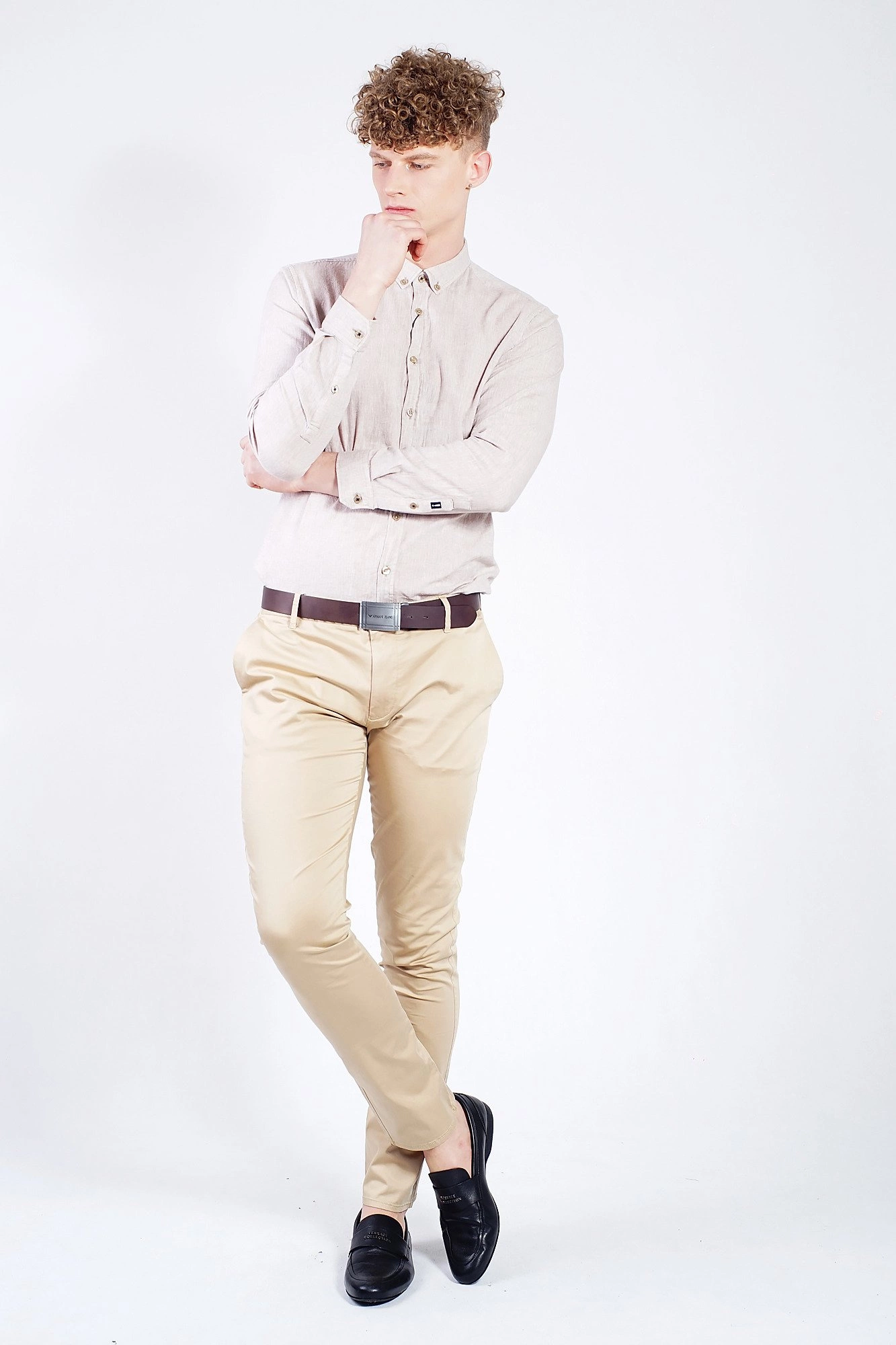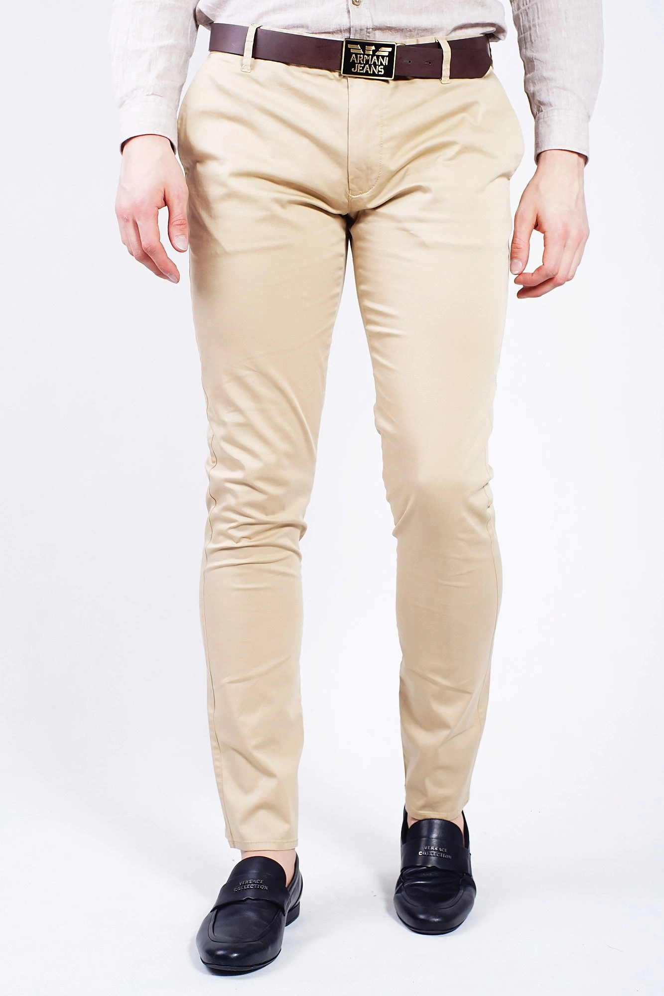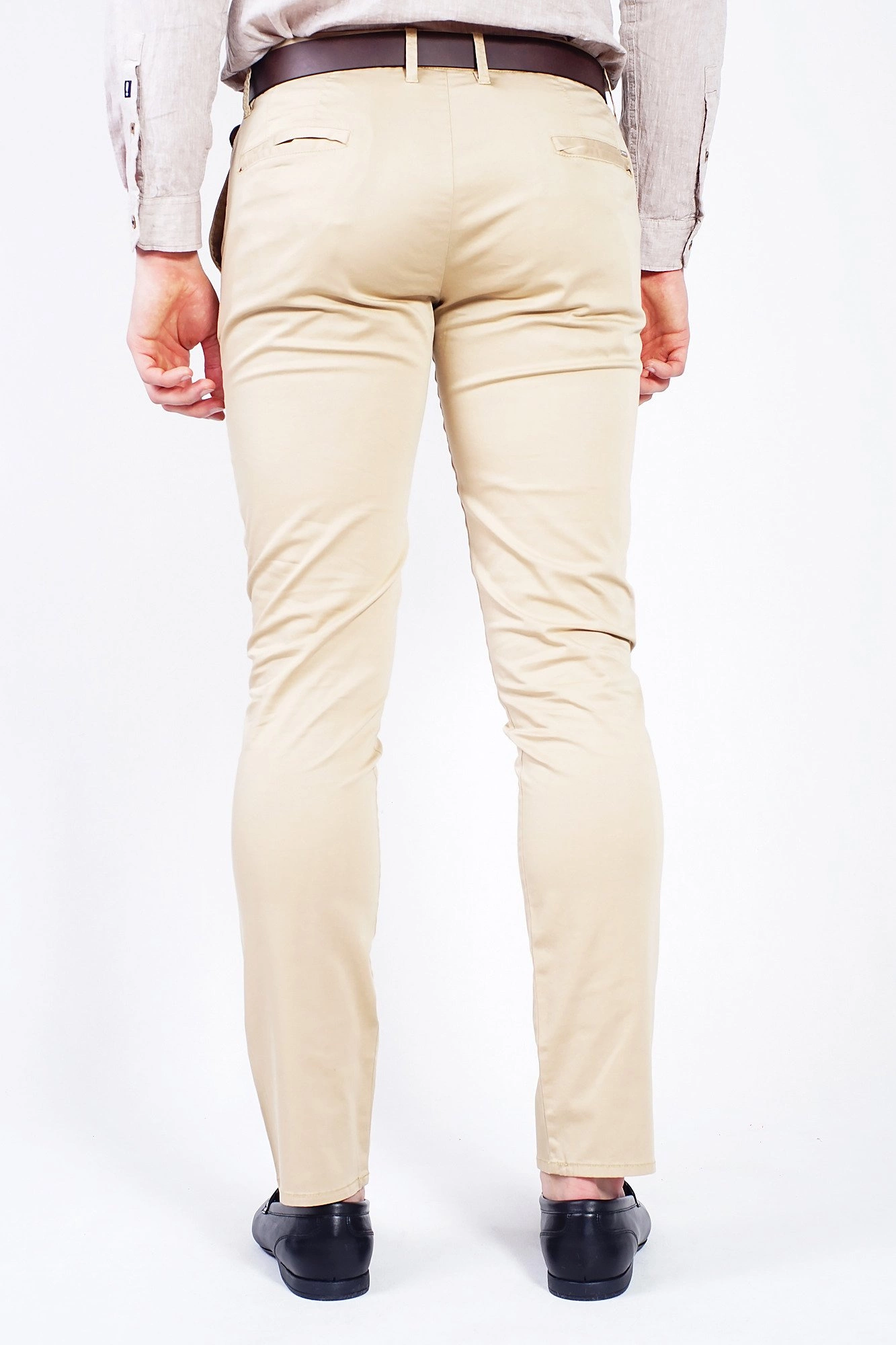 Beżowe spodnie o klasycznym fasonie. Zapinane na zamek i guzik sygnowane logo marki. Z przodu dwie skośne kieszenie. Z tyłu dwie, niezapinane kieszenie i aplikacja w postaci nazwy marki. Wykonane z wysokiej jakości bawełny z dodatkiem elastanu. Wygodne i komfortowe.