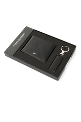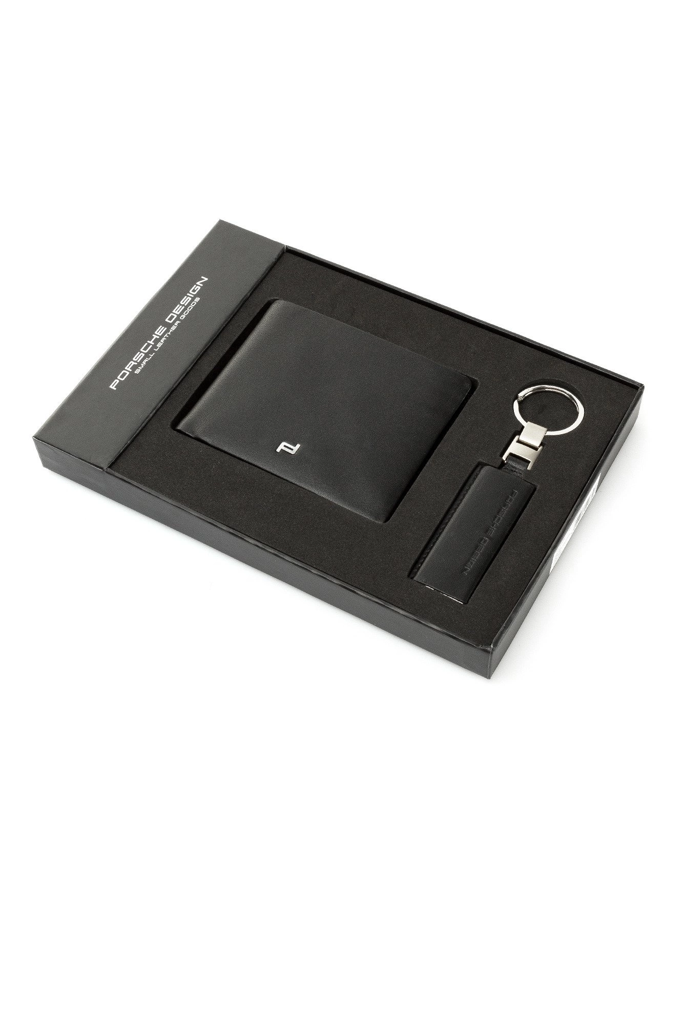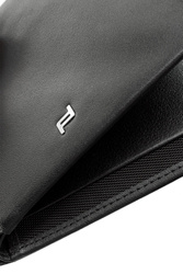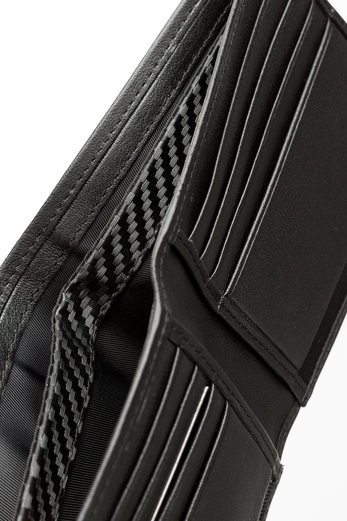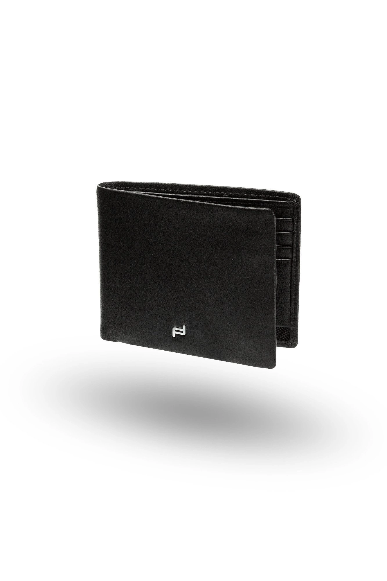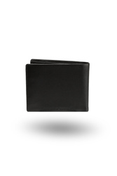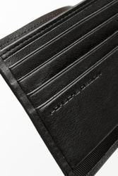 Czarny skórzany portfel. Z przodu metalowa aplikacja marki. Wewnątrz dwie przegrody na banknoty . Osiem miejsc na karty lub wizytówki oraz dwie kieszonki boczne. W zestawie elegancki skórzany brelok z metalowym wykończeniem i wytłoczonym logiem marki.