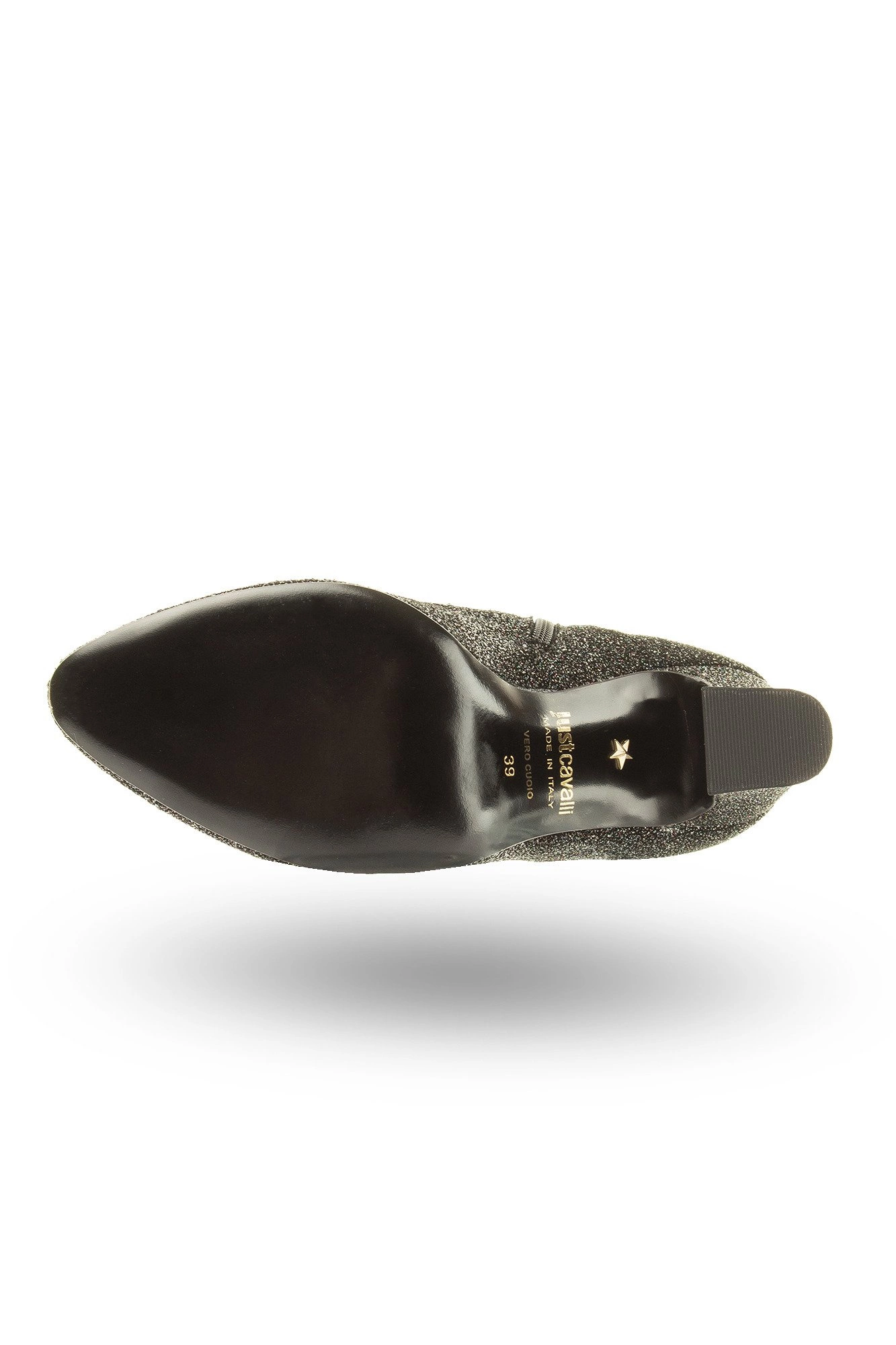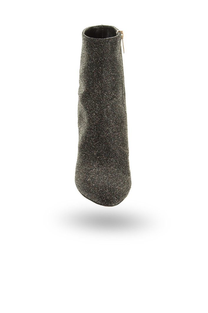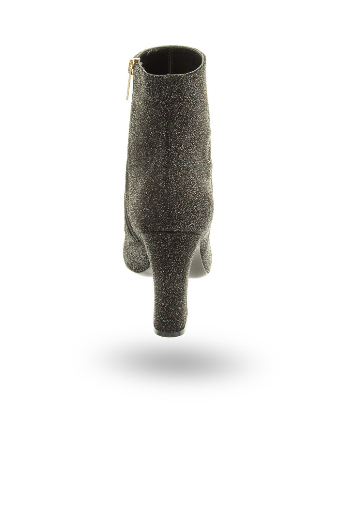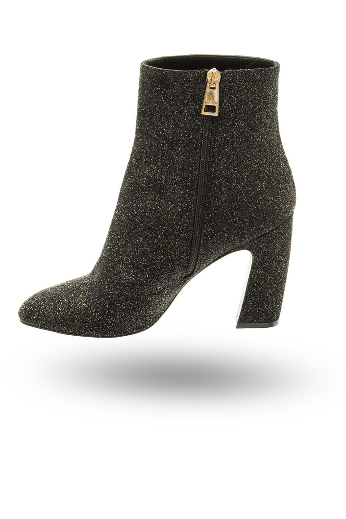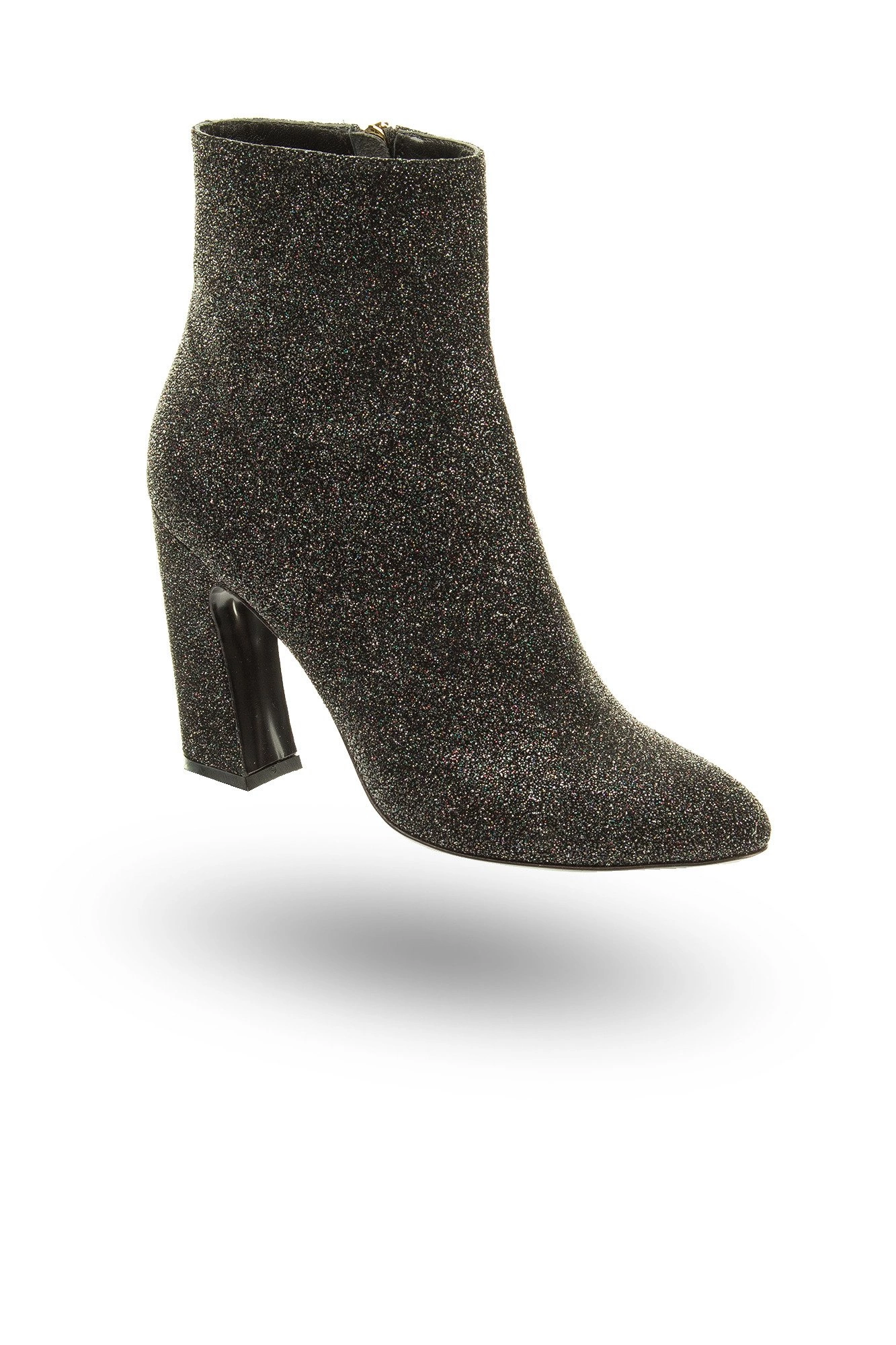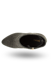 Botki w czarnym kolorze. Na całości pokryte brokatem. Delikatnie zaokrąglone noski. W całości wykonane ze skóry naturalnej. Od wewnętrznej strony zamek ułatwiający wkładanie buta. Obcas o wysokości ok. 9cm. W komplecie worek przeciwkurzowy.