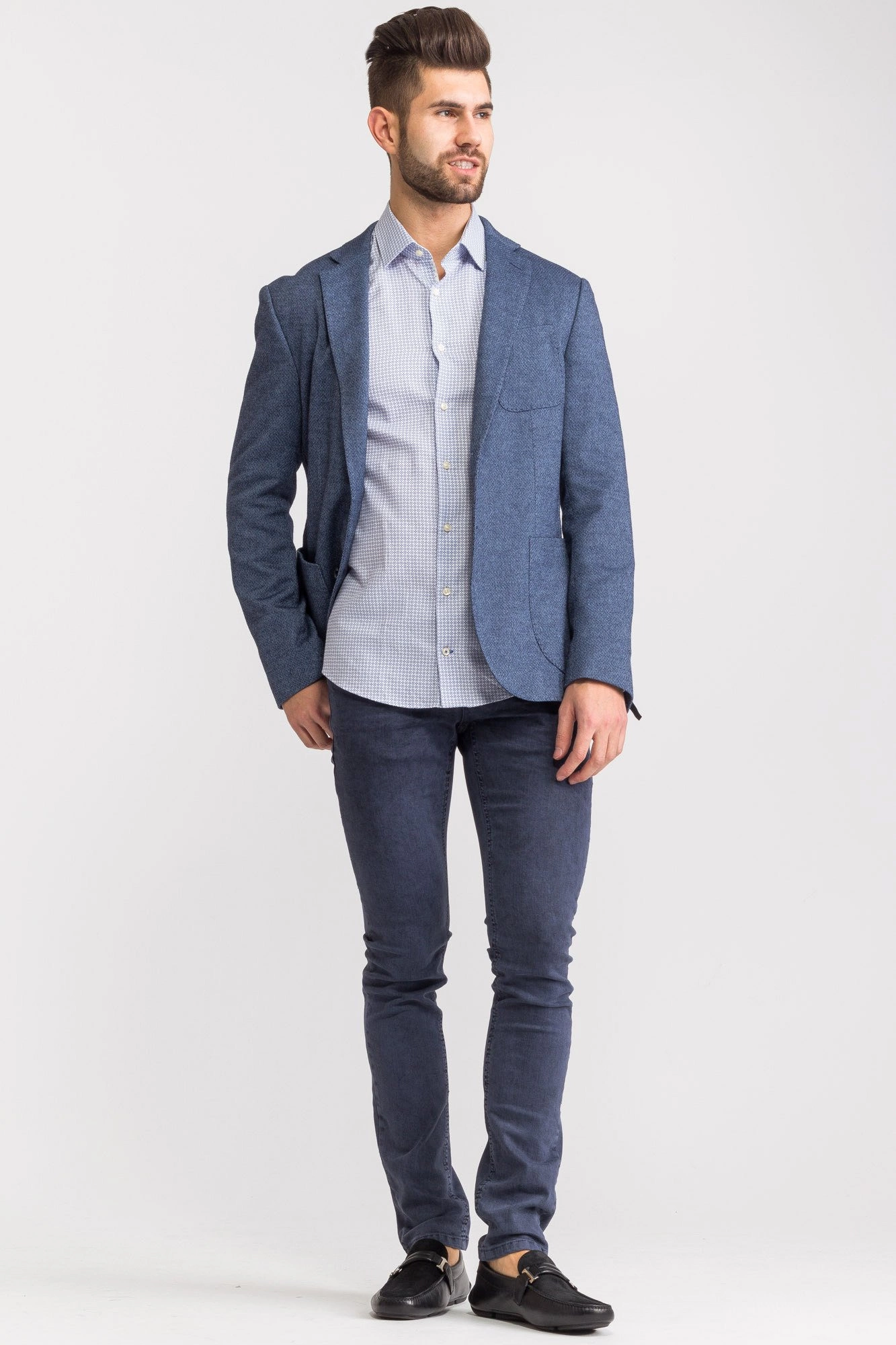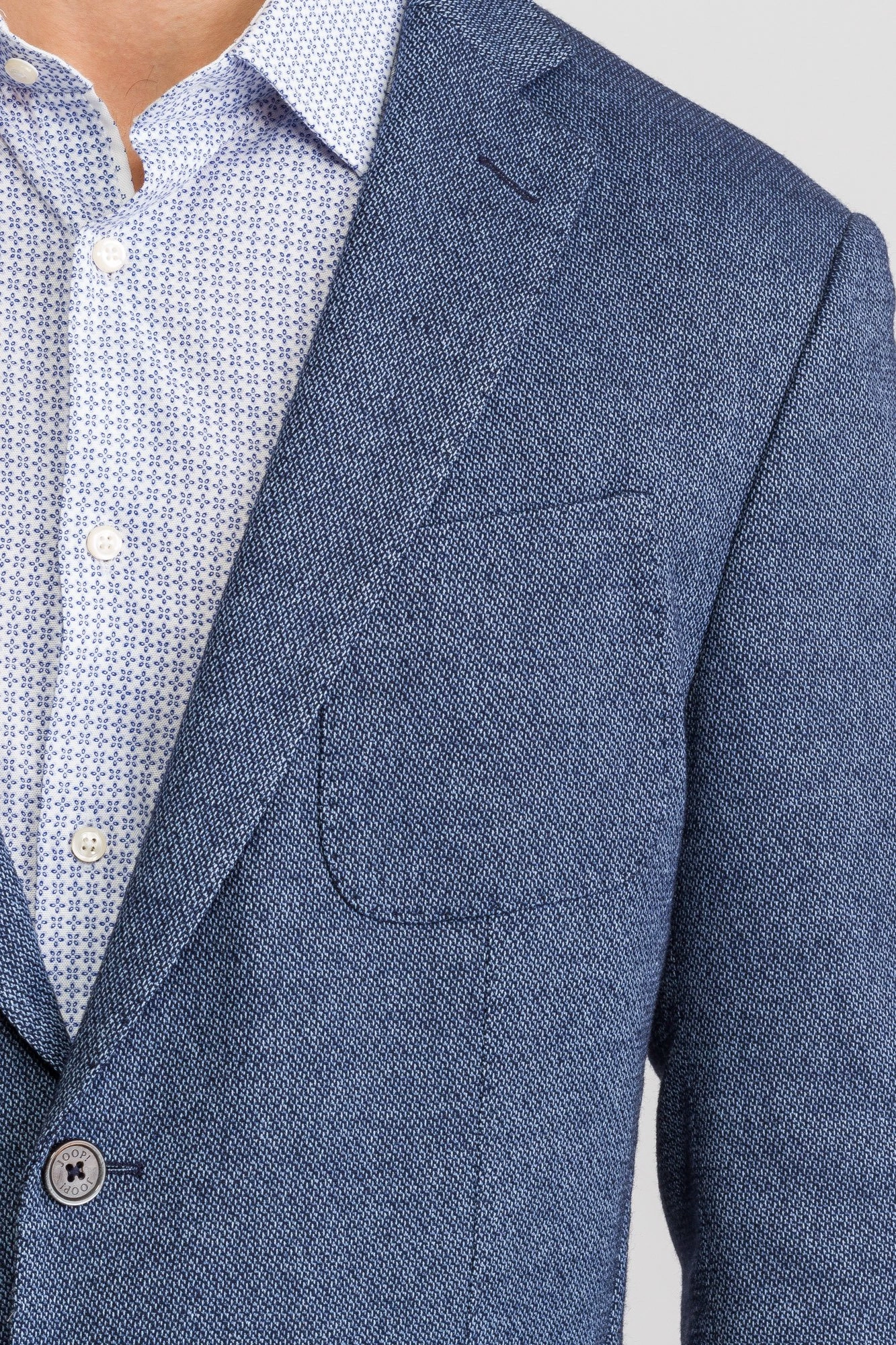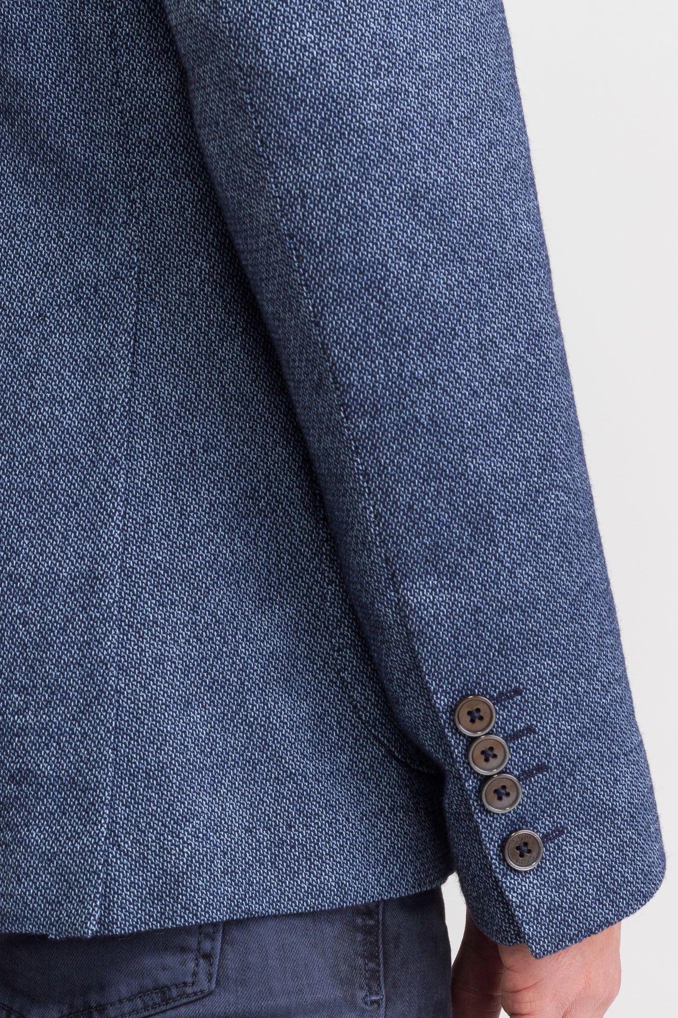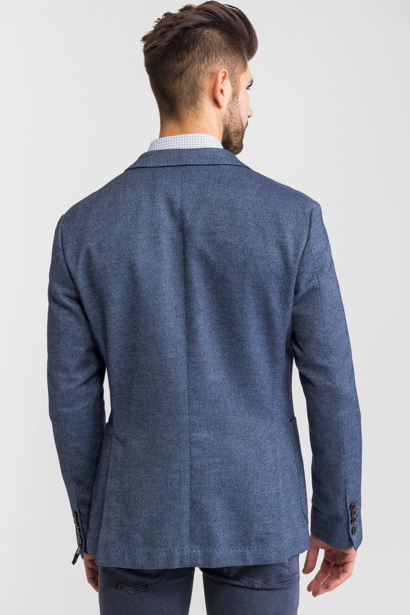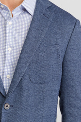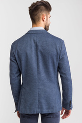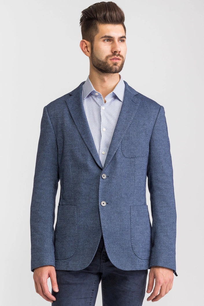 Niebieska marynarka męska typu Slim Fit. Wykonana z bawełny z domieszką elastanu. Zapinana na dwa guziki sygnowane logo marki. Łącznie trzy kieszenie zewnętrzne oraz dwie wewnętrzne. Cała powierzchnia pokryta przeszyciami w kolorze błękitnym. Wewnątrz rękawów wszyta biała podszewka w paski.