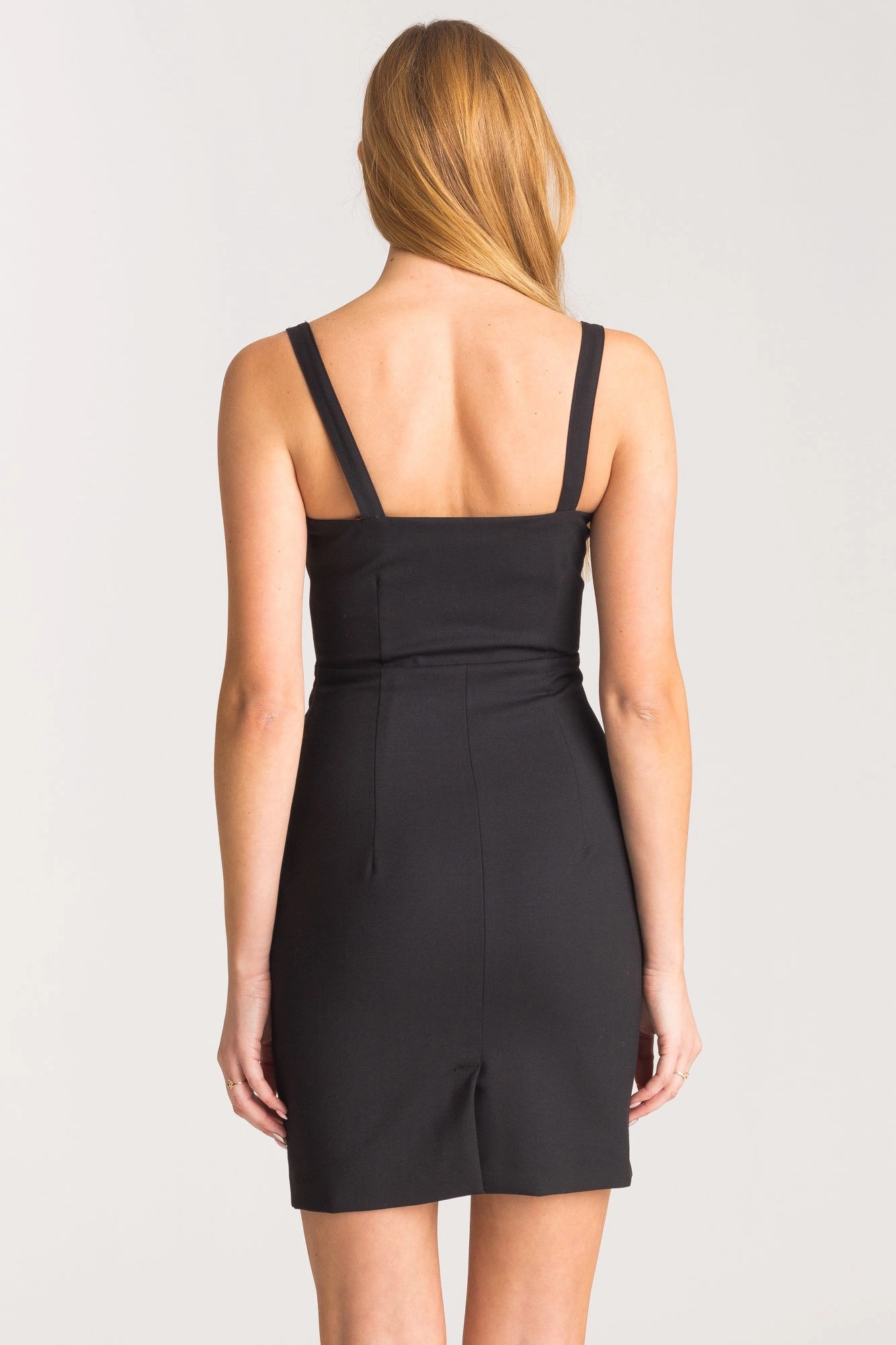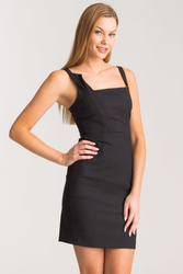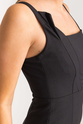 Sukienka na ramiączkach w kolorze czarnym. Asymetryczny dekolt z ozdobną zakładką. Po lewej stronie zapinana na kryty zamek z zawieszką w postaci złotej ważki oraz haftkę. Sukienka odcięta w pasie. Wykonana z najwyższej jakości wełny dziewiczej z domieszką dzianiny. Długości mini.
