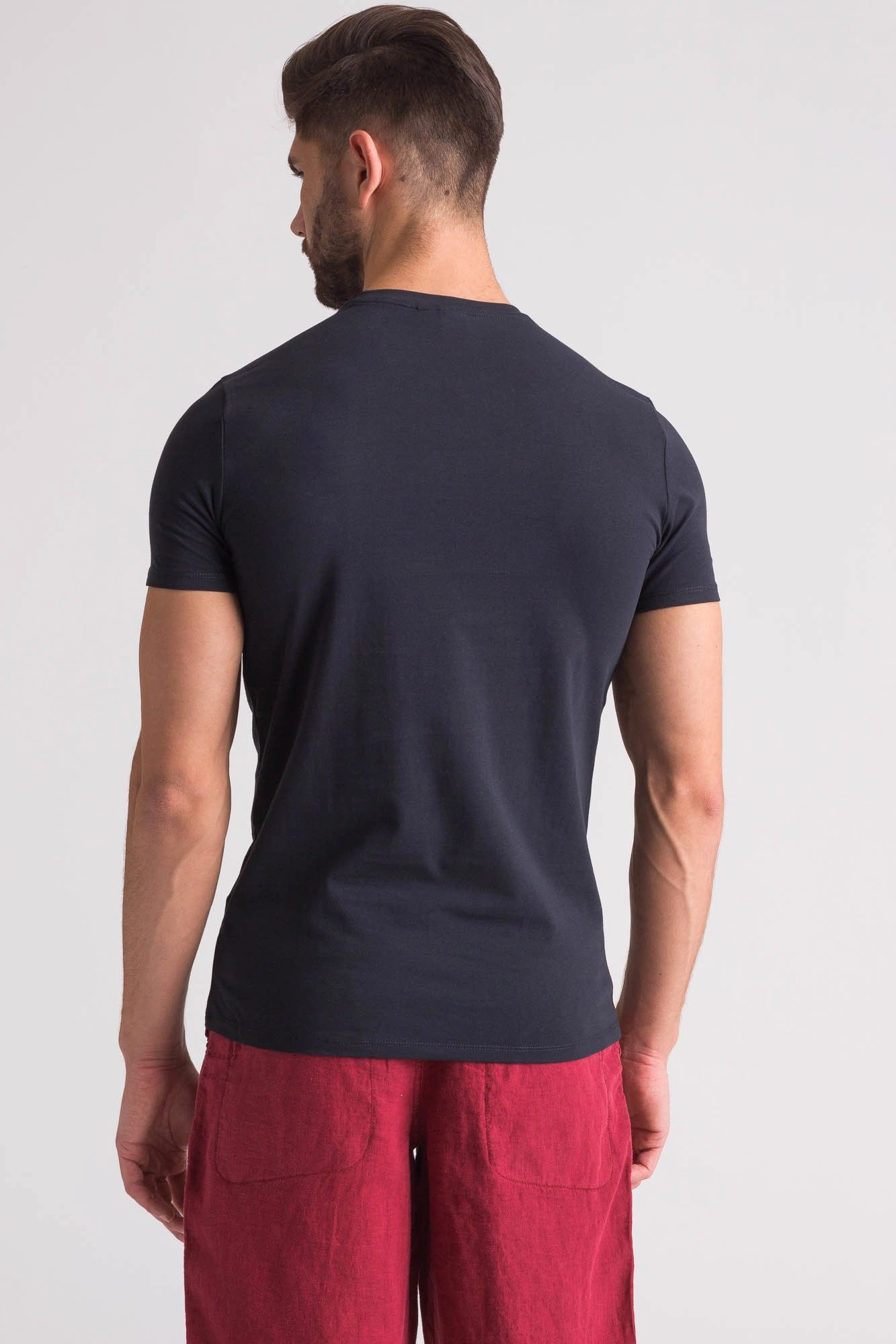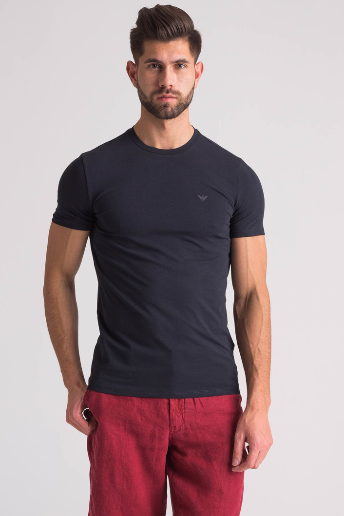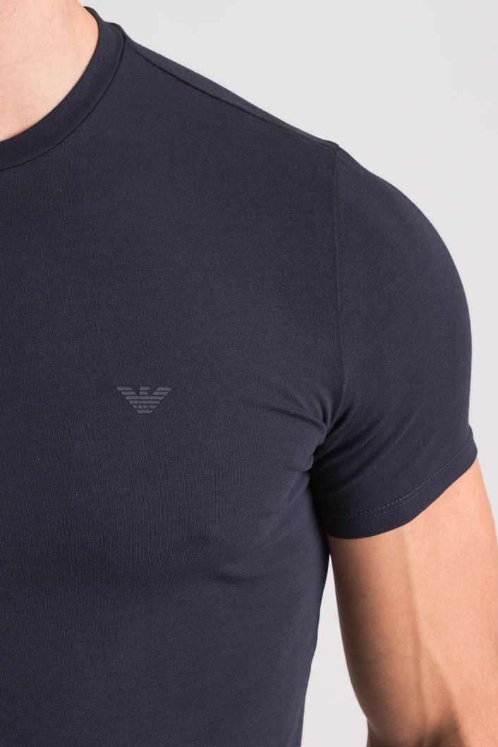 Granatowy t-shirt wykonany z bawełny z domieszką elastanu. Dekolt typu o-neck. Po lewej stronie nadruk w postaci logo marki w jednolitym kolorze.