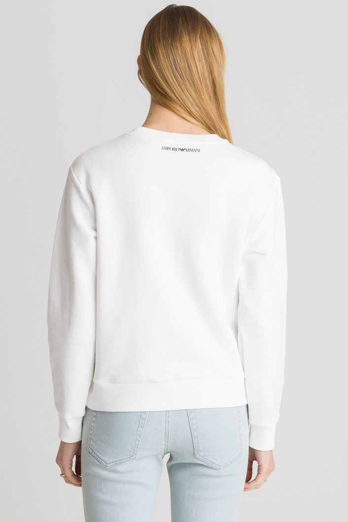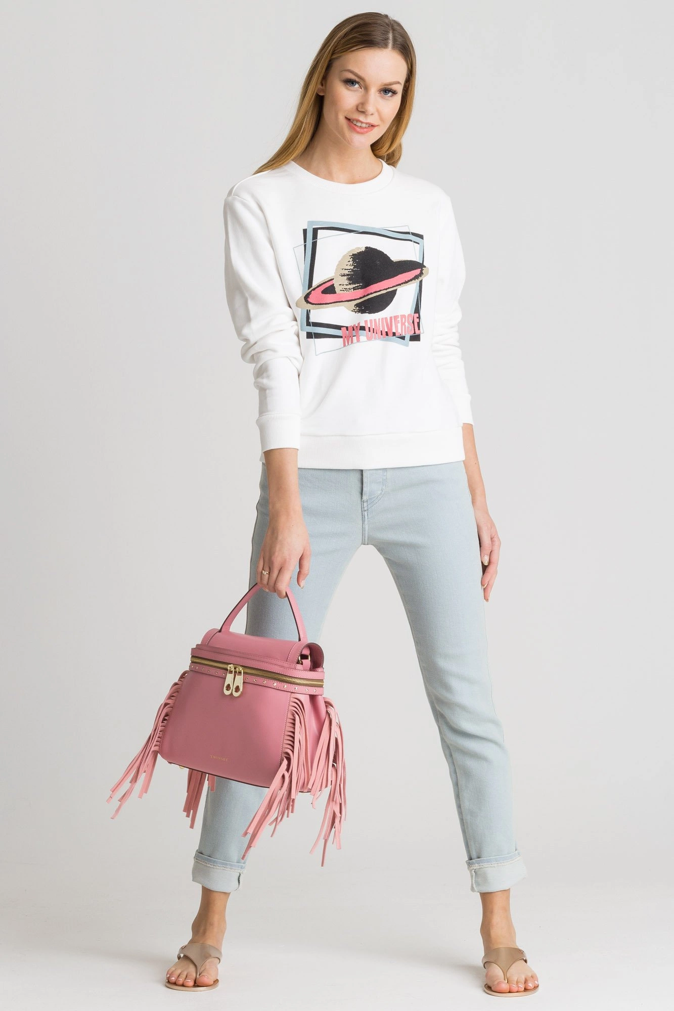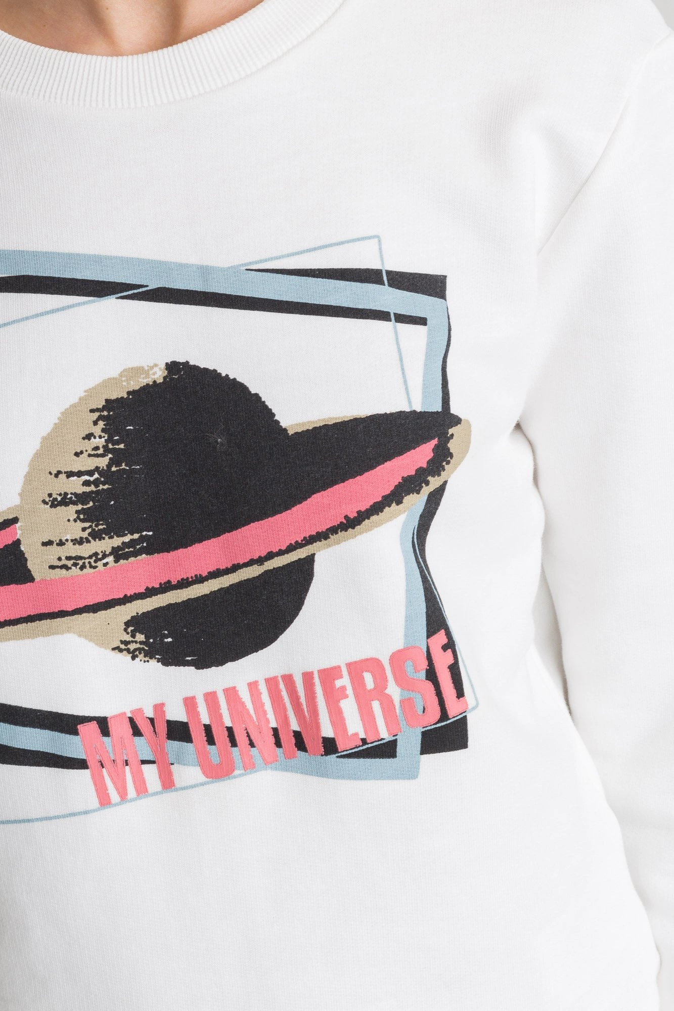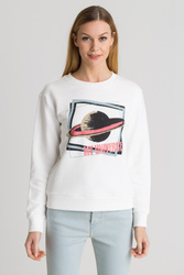 Bluza w białym kolorze. Dekolt typu o-neck. Z przodu wielokolorowy nadruk. Rękawy, góra oraz dół bluzy wykończone ściągaczem. Z tyłu, na wysokości karku, aplikacja marki w kolorze czarnym. Wykonana z wysokiej jakości bawełny.