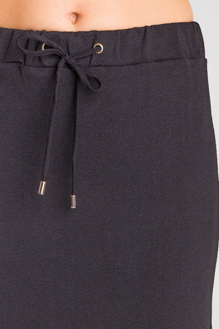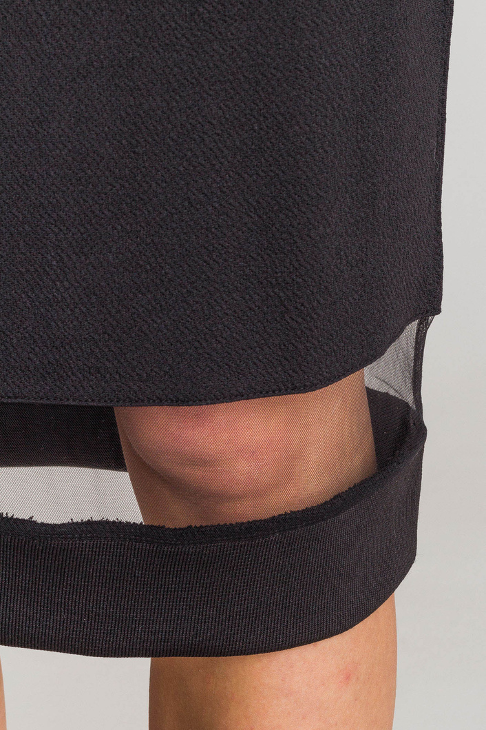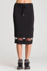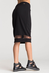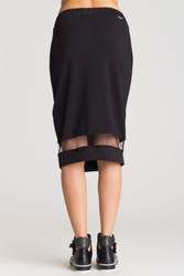 Czarna spódnica z transparentną wstawką. Elastyczny pas regulowany za pomocą troczków zakończonych metalowymi agletami. Na dole wstawka z transparentnego tiulu w kolorze czarnym. Z tyłu, poniżej pasa, metalowa aplikacja marki. Spódnica o długości midi.