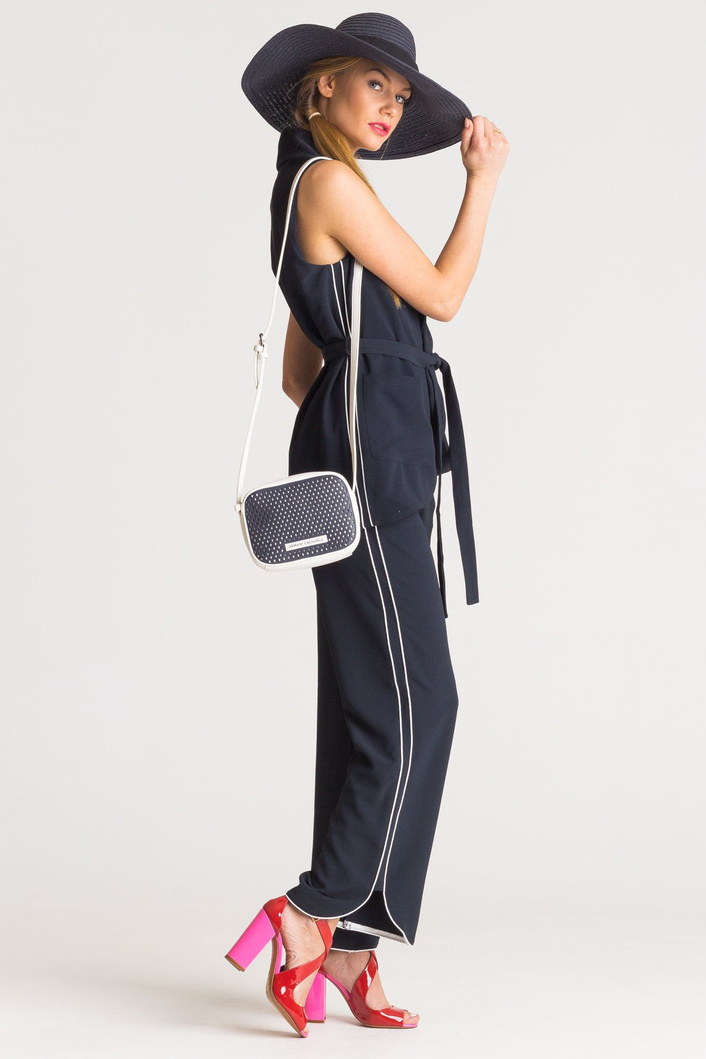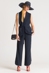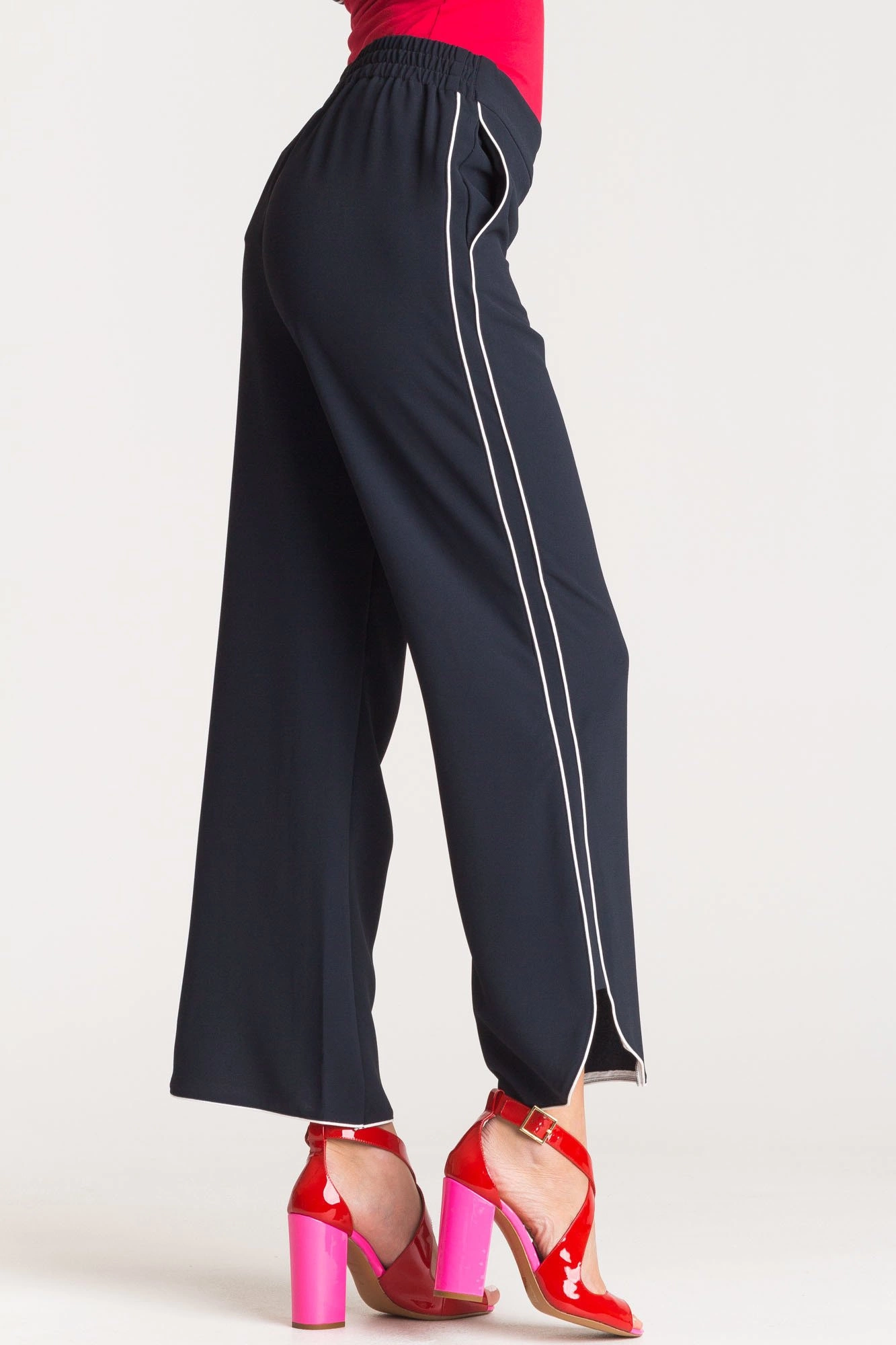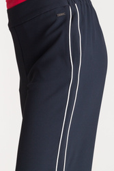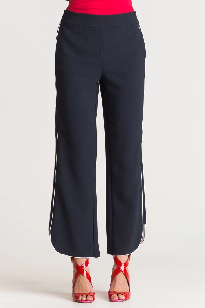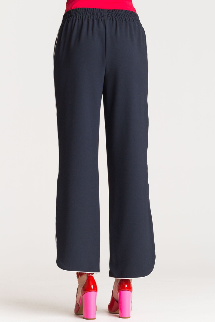 Szerokie, granatowe spodnie. Częściowo elastyczny pas. Po bokach dwie, niezapinane kieszenie. Po lewej stronie metalowa aplikacja z logo marki. Wzdłuż nogawek lampasy w kontrastowej bieli. U dołu rozcięcia z zaokrąglonymi krawędziami.