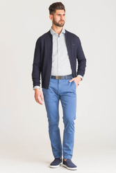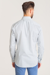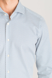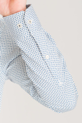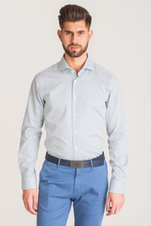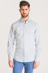 Biała, bawełniana koszula typu slim fit w niebieski wzór. Zapinana na guziki w kolorze perłowym. Kołnierzyk typu włoskiego. Ścięte mankiety zapinane na guzik, z możliwością regulacji szerokości.