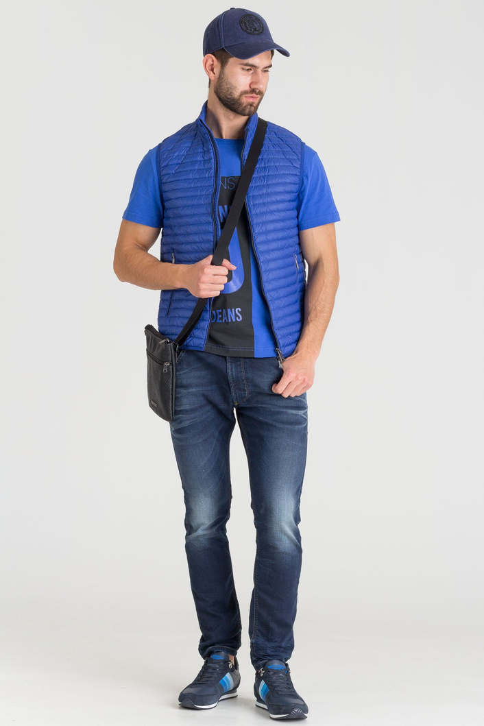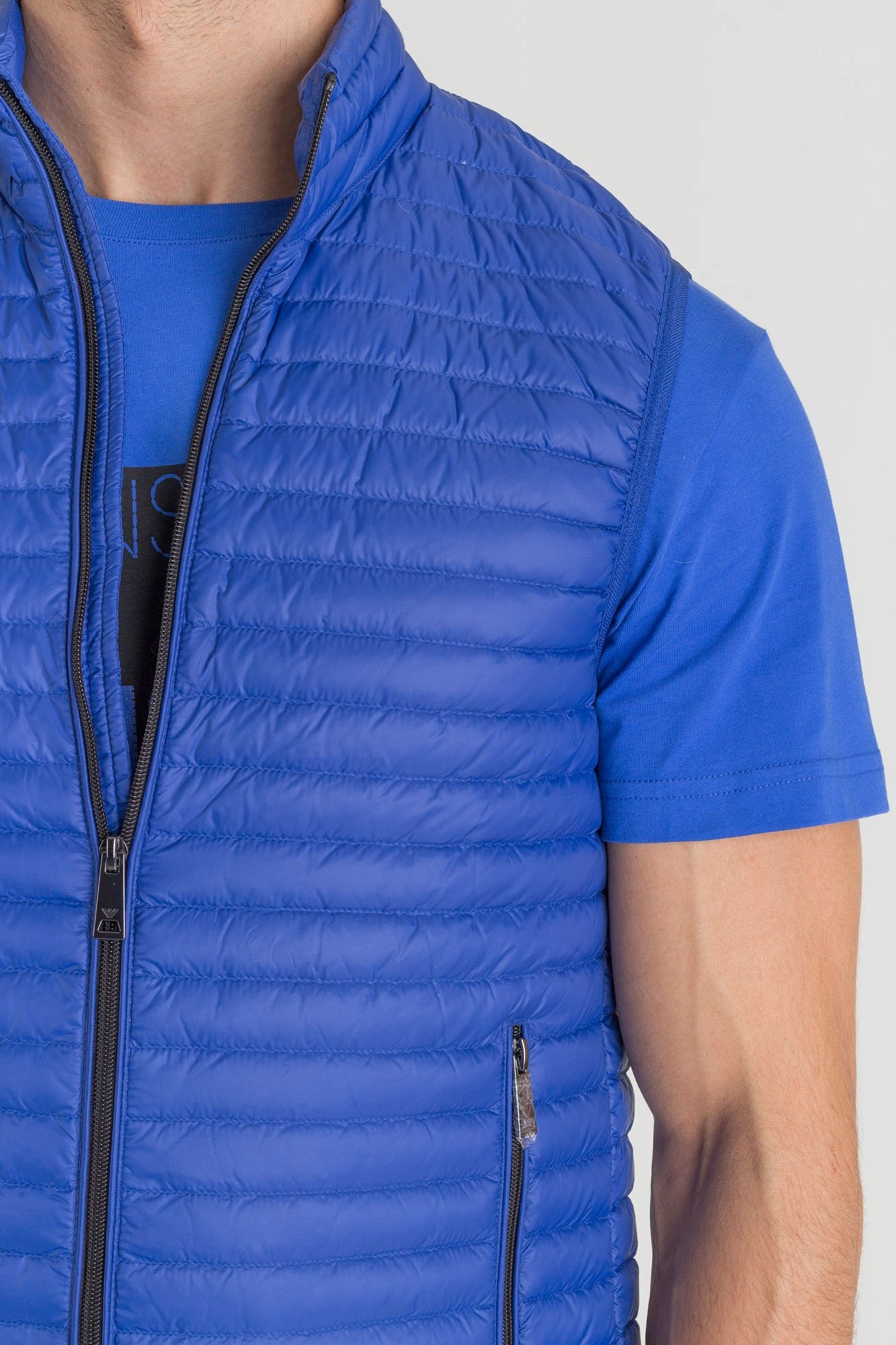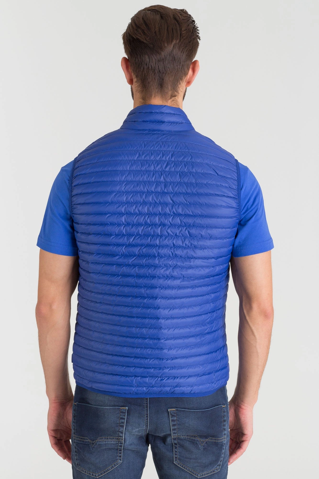 Lekka, pikowana kamizelka męska w kolorze niebieskim. Zapinana na czarny, dwukierunkowy zamek, zakończony zawieszką sygnowana logo marki. Przy szyi stójka. Z przodu dwie zapinane kieszenie. Wykończona obszyciem w niewyróżniającym się kolorze. Kamizelka ocieplana pierzem oraz kaczym puchem, z przeznaczeniem na sezon wiosenno-letni.