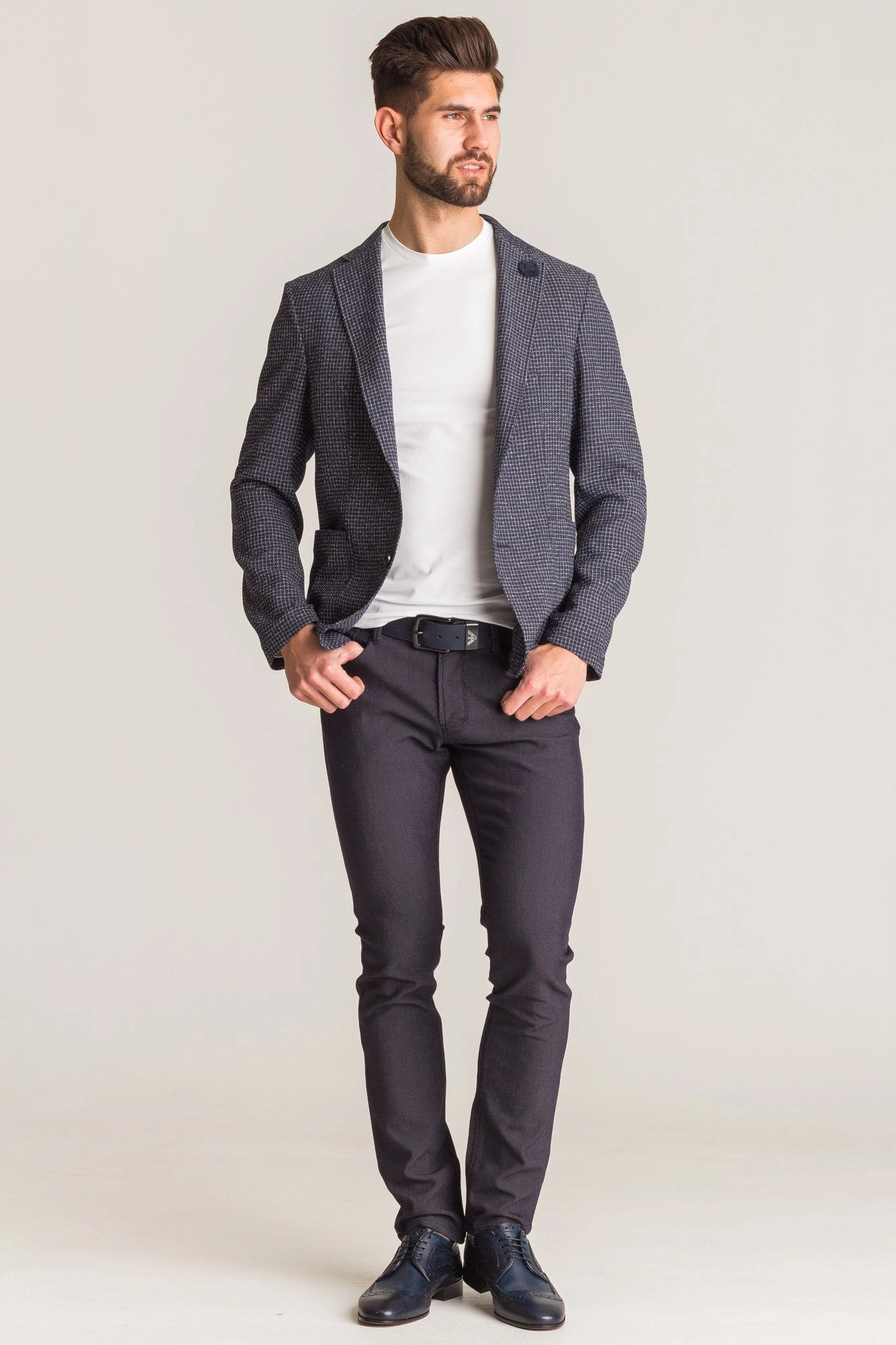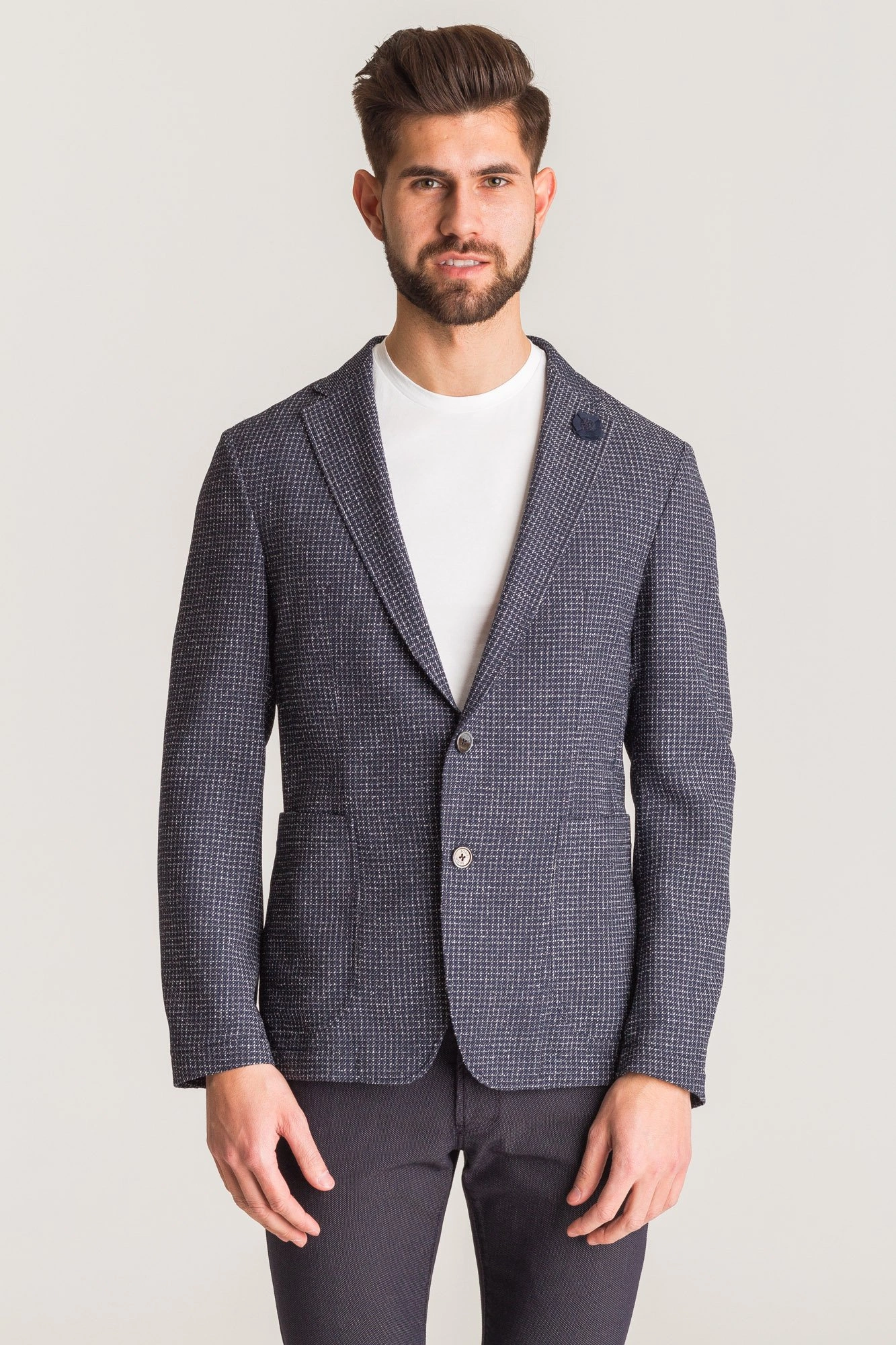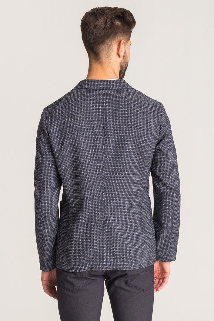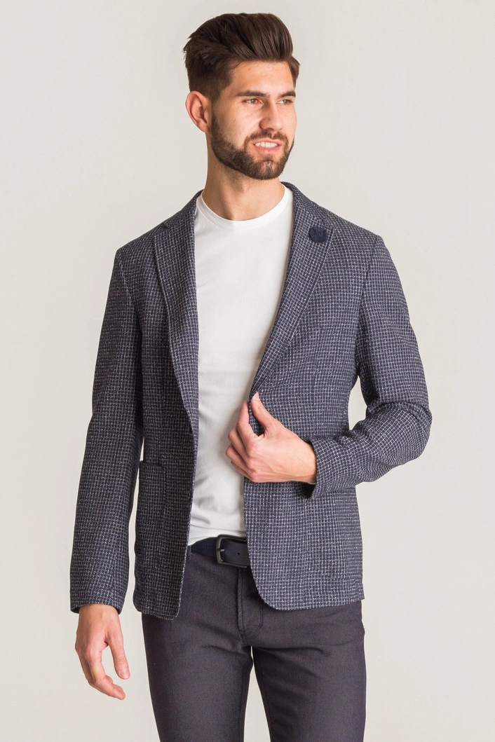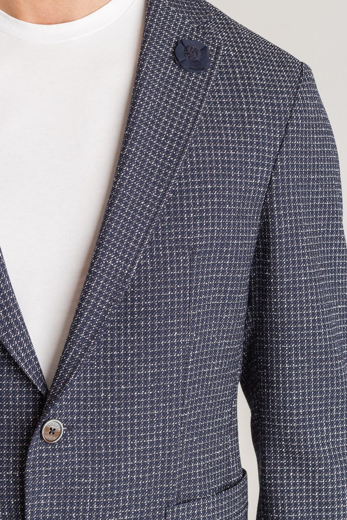Granatowa marynarka męska typu slim fit. Wykonana z naturalnej wełny z domieszką bawełny. Cała powierzchnia przetykana wielokolorową nicią, tworzącą wzór drobnych kwadratów. Zapinana na dwa guziki sygnowane logo marki. Po lewej stronie przy kołnierzu ozdobny, odpinany kwiat, wykonany z tkaniny w niewyróżniającym się kolorze. Z przodu dwie duże, niezapinane kieszenie. Rękawy niezapinane, wykończone obszyciem. Wewnątrz po prawej stronie kieszeń zapinana na guzik. Z tyłu nacięcie.