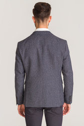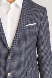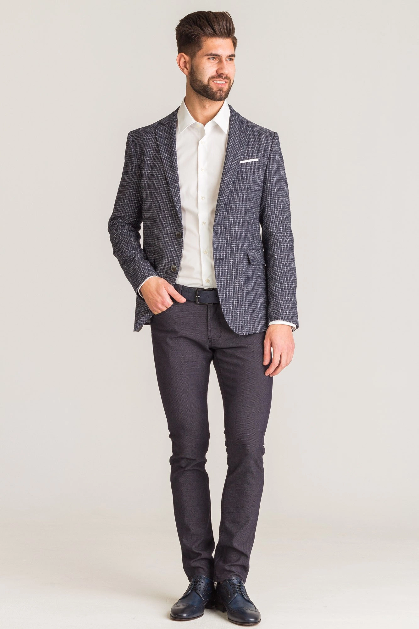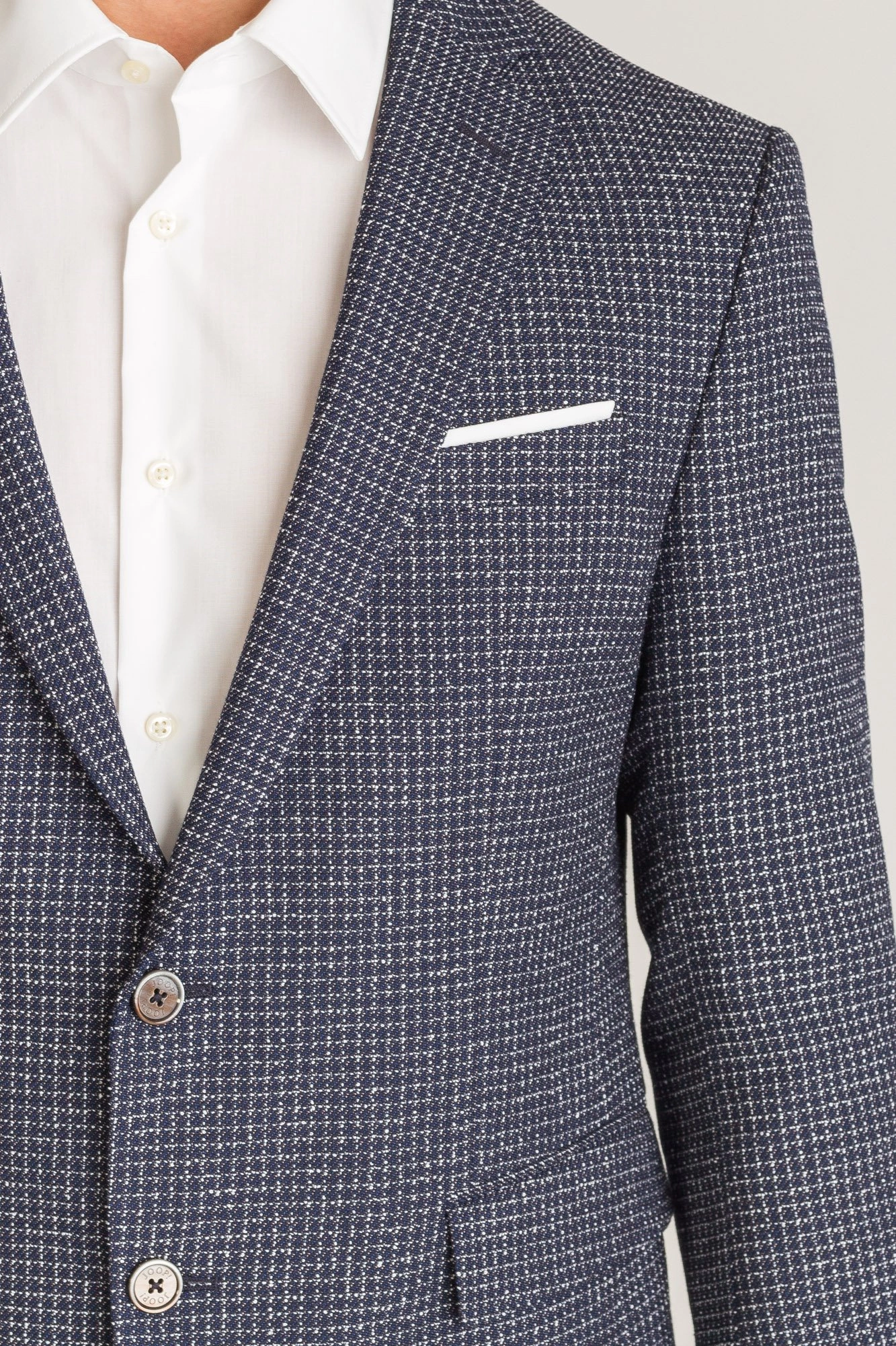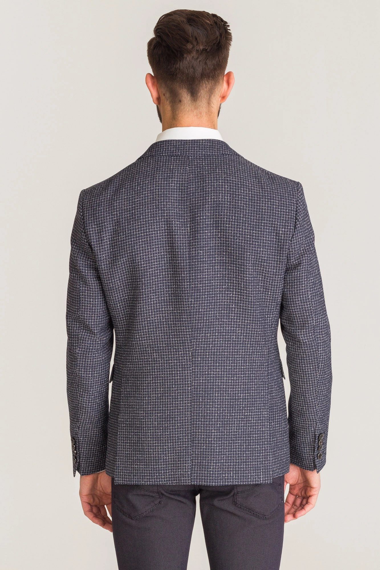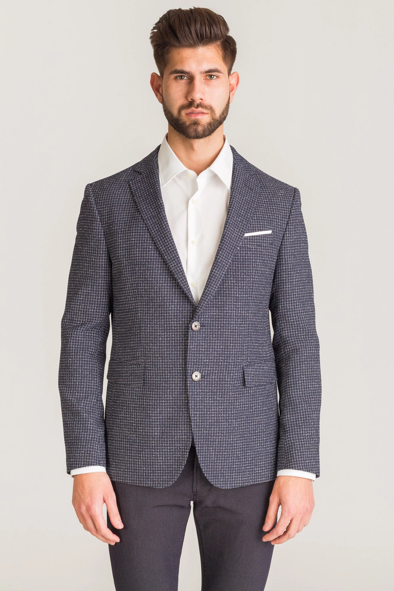 Granatowa marynarka slim fit, wykonana z wełny dziewiczej w połączeniu z bawełną. Całość przetykana wielokolorowymi nićmi, tworzącymi wzór drobnych kwadratów. Zapinana na dwa guziki sygnowane logo marki. Po lewej stronie u góry imitacja kieszeni oraz biała butonierka. Z przodu dwie duże imitacje kieszeni z patkami. Rękawy zapinane na cztery guziki. Wewnątrz, po obu stronach kieszenie, jedna zapinana na guzik. Podszewka w kolorze szarym sygnowana logo marki. Wewnątrz rękawów wszyta granatowa podszewka. Z tyłu dwa nacięcia (szlice).