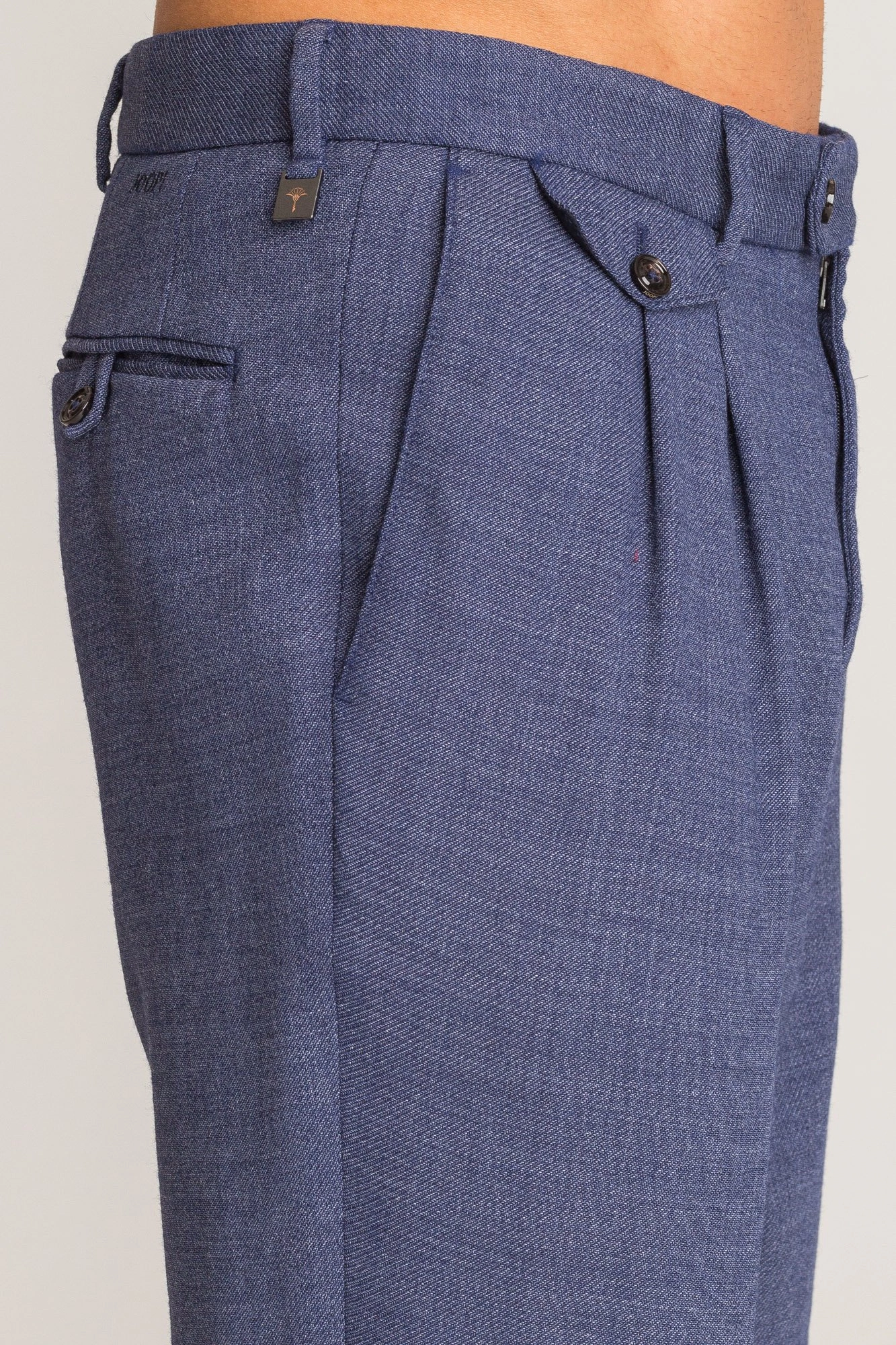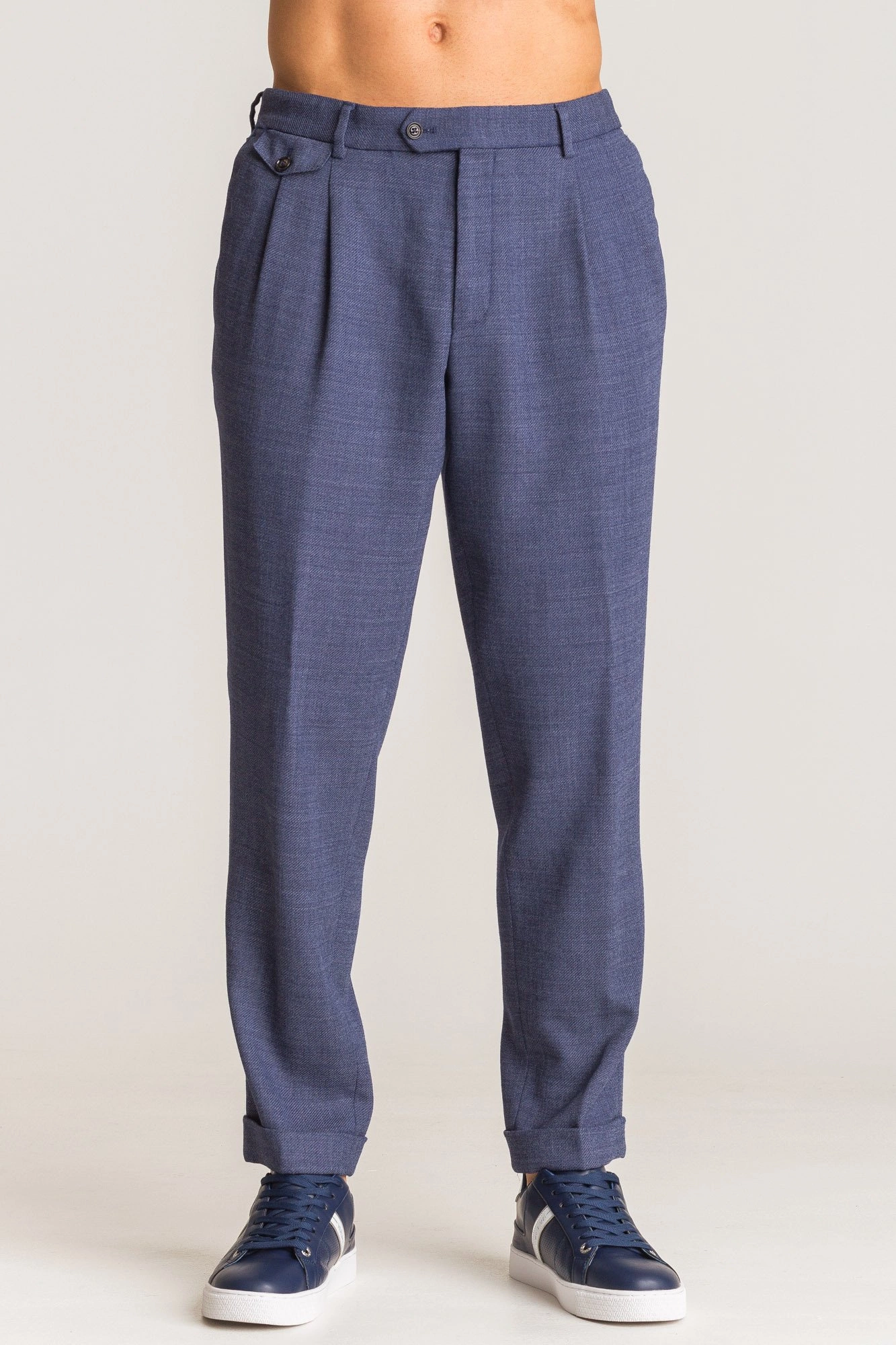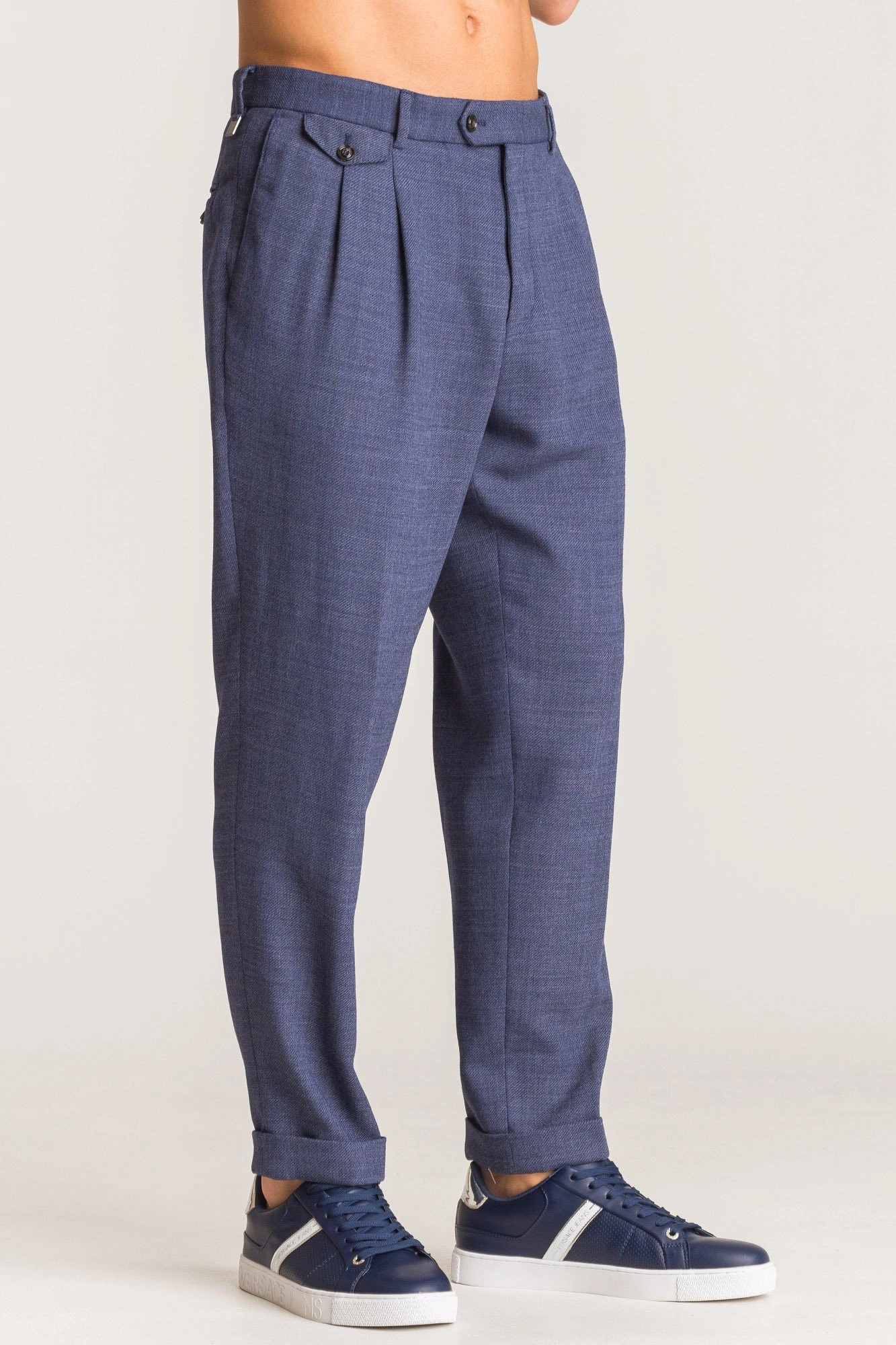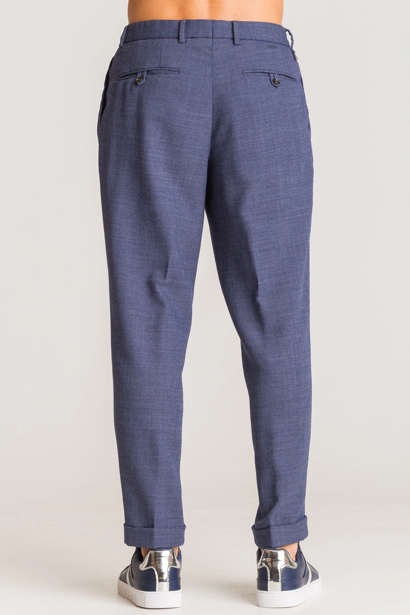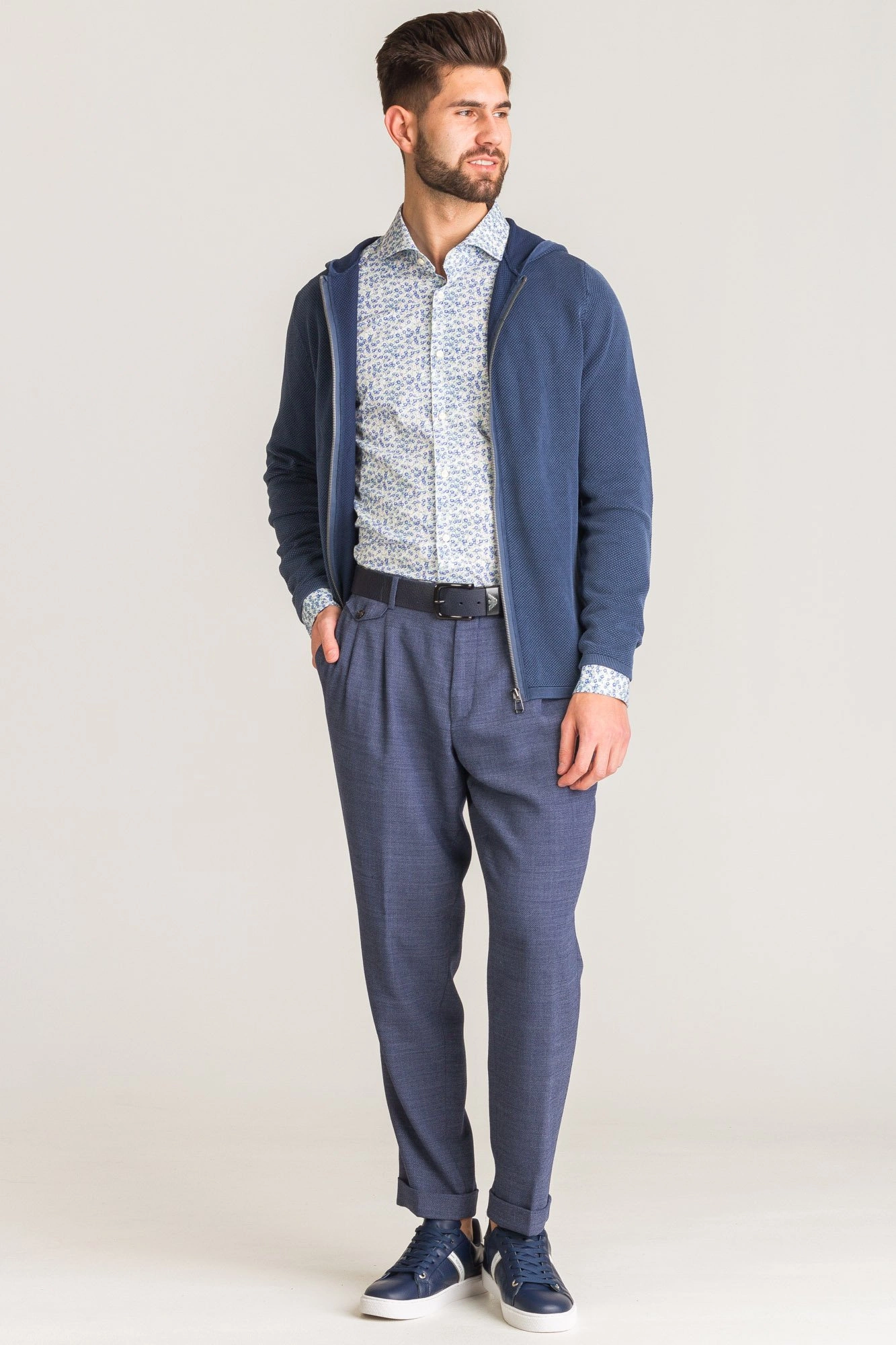 Eleganckie spodnie męskie w kolorze granatowym. Zapinane na zamek i guzik sygnowany logo marki, oraz dodatkową ukrytą haftkę. Po bokach dwie kieszenie oraz bilonówka z patką zapinana na guzik. Z tyłu dwie kieszenie zapinane na guzik. Nad prawa kieszenią haftowane logo marki oraz metalowa aplikacja. Nogawki wykończone mankietami. Fason regular.