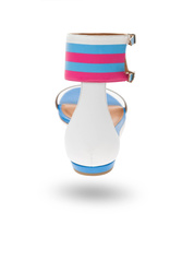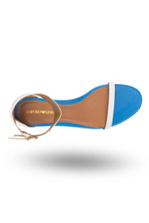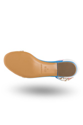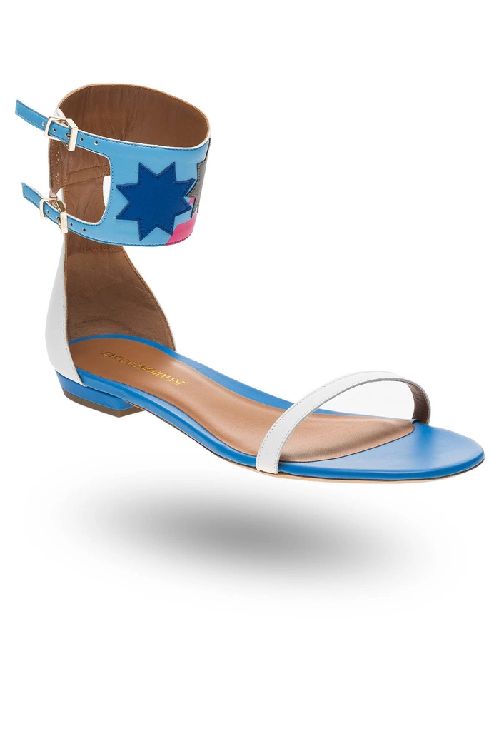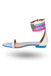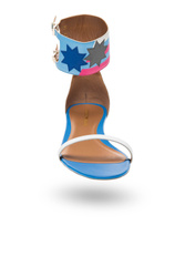 Białe sandały. W całości wykonane ze skóry naturalnej. Zapinane wokół kostki za pomocą dwóch sprzączek na szerokim pasku w trzech kolorach: białym, błękitnym i różowym. Pasek dodatkowo zdobiony aplikacją w formie dwóch gwiazd w kolorze szarym i niebieskim. Wkładka w kolorze niebieskim i beżowym sygnowana logo marki. Podeszwa o wysokości ok. 1 cm.
