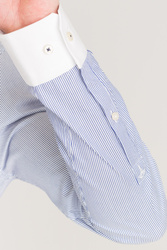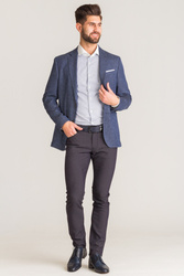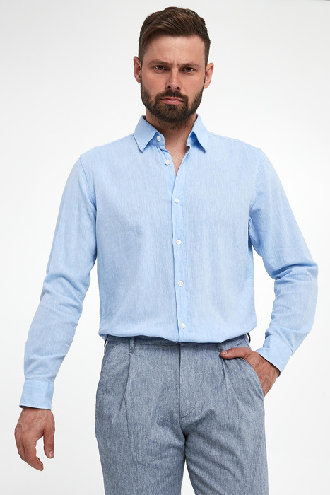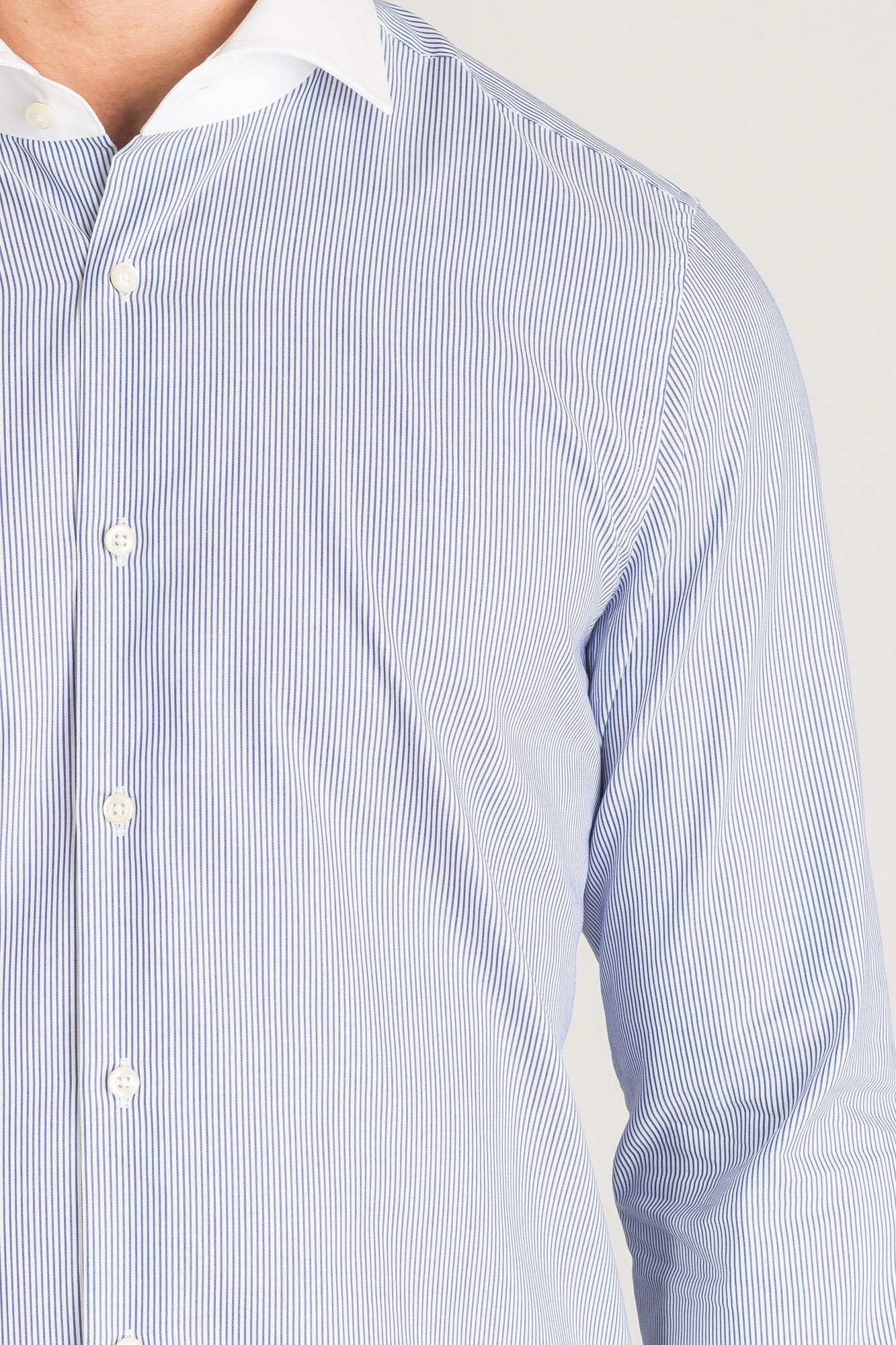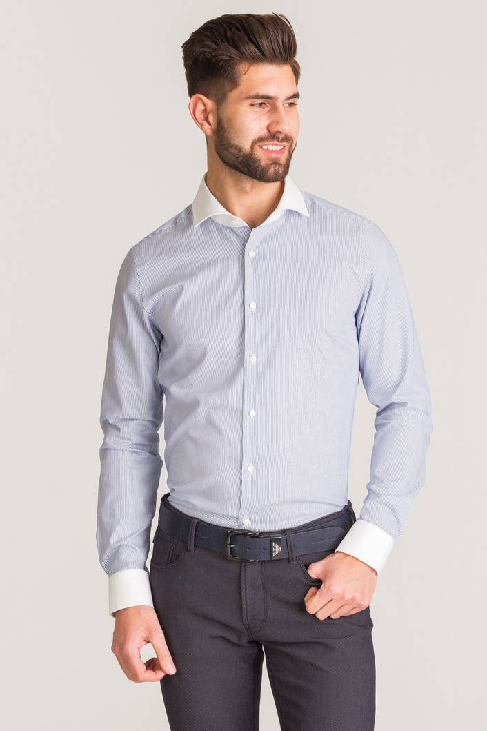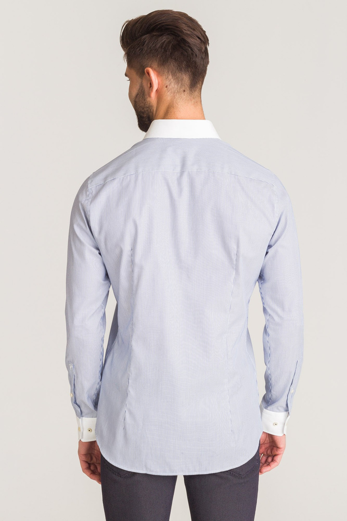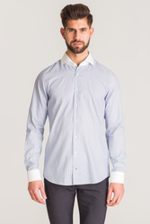 Biała koszula męska typu slim fit, wykonana z bawełny. Całość pokryta drobnymi paskami w kolorze niebieskim. Biały kołnierzyk typu włoskiego. Zapinana na perłowe guziki. Ścięte mankiety w kolorze białym, zapinane na trzy guziki. Na lewym rękawie u dołu haftowane logo marki w kolorze białym.