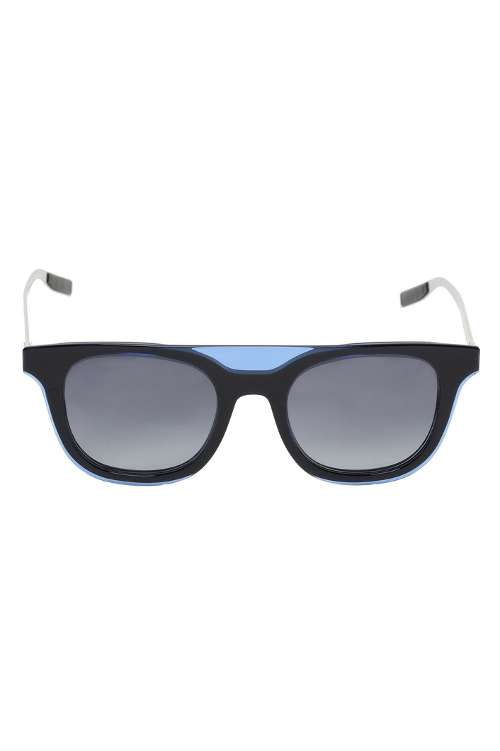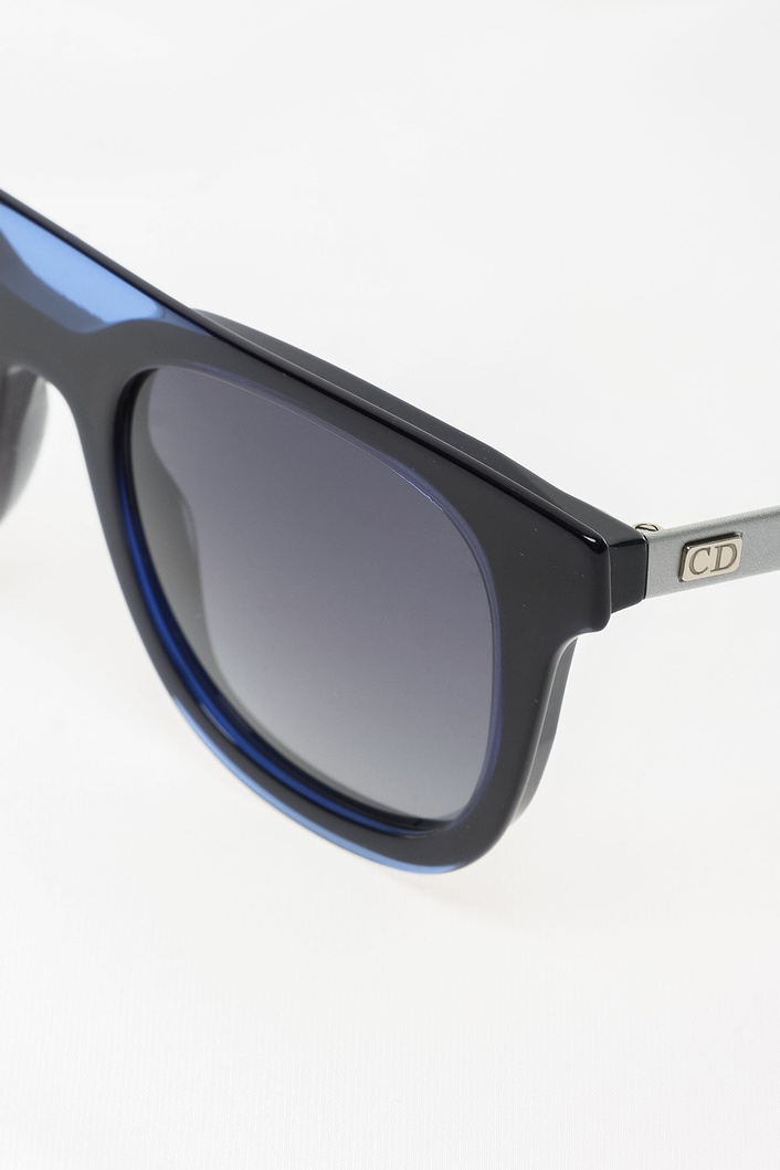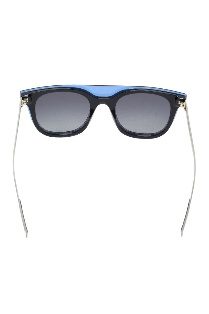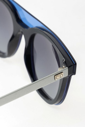 Okulary przeciwsłoneczne z oprawkami w kolorze granatowym. Zauszniki w kolorze matowego srebra z inicjałami marki. Soczewka z barwionymi szkłami. W komplecie oryginalne akcesoria: eleganckie etui, ściereczka z mikrofibry do soczewek oraz certyfikat.