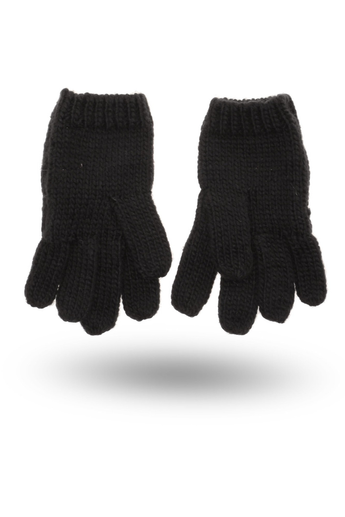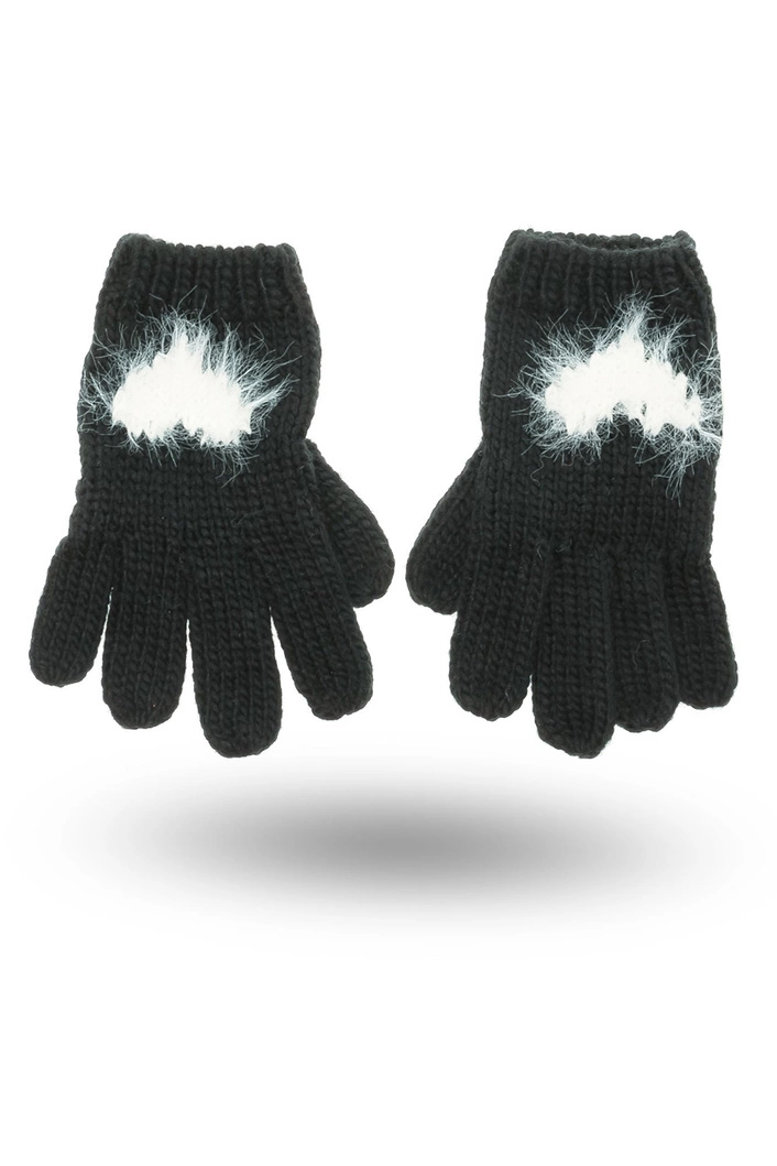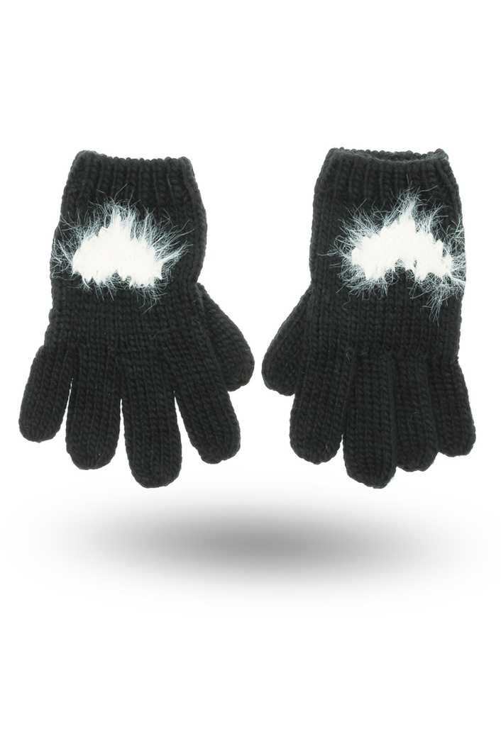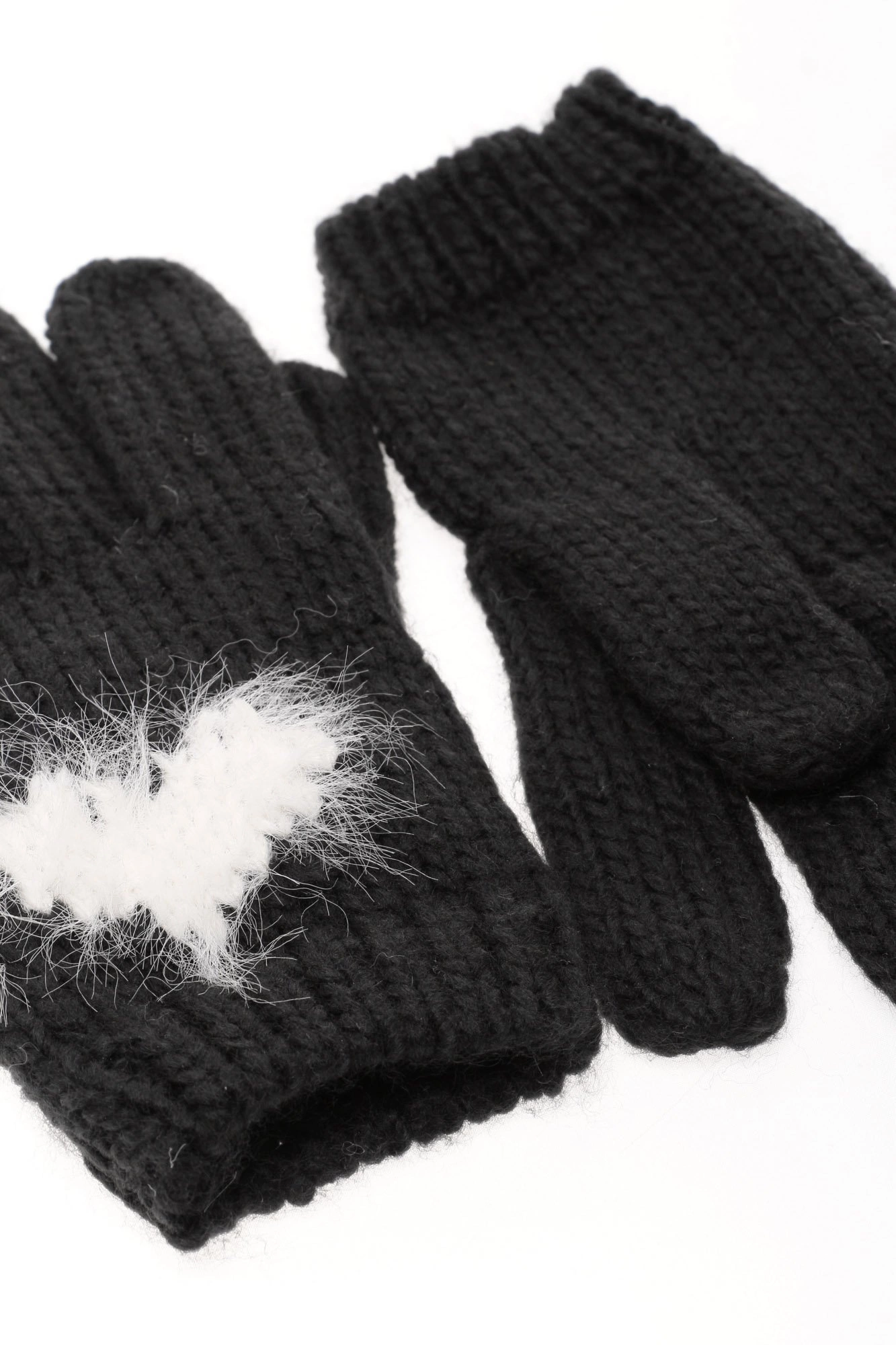 Klasyczne rękawiczki w kolorze czarnym. Na zewnętrznej części duże serce logo marki w kolorze białym z włóczki z długim włosem.