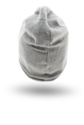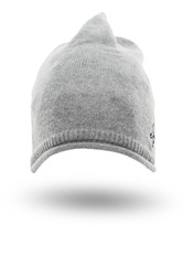 Czapka w kolorze jasnoszarym. Wzdłuż boków białe paski, poniżej jednego z nich niewielki czarny haft z logo marki. Dół podwinięty.