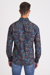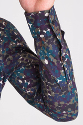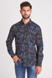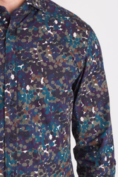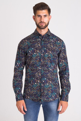 Wielokolorowa koszula męska wykonana z bawełny. Całość pokryta wzorem moro w odcieniach granatu, fioletu i czarnego. Kołnierzyk typu włoskiego. Zapinana na czarne guziki z logo marki. Ścięte mankiety, zapinane na jeden guzik.