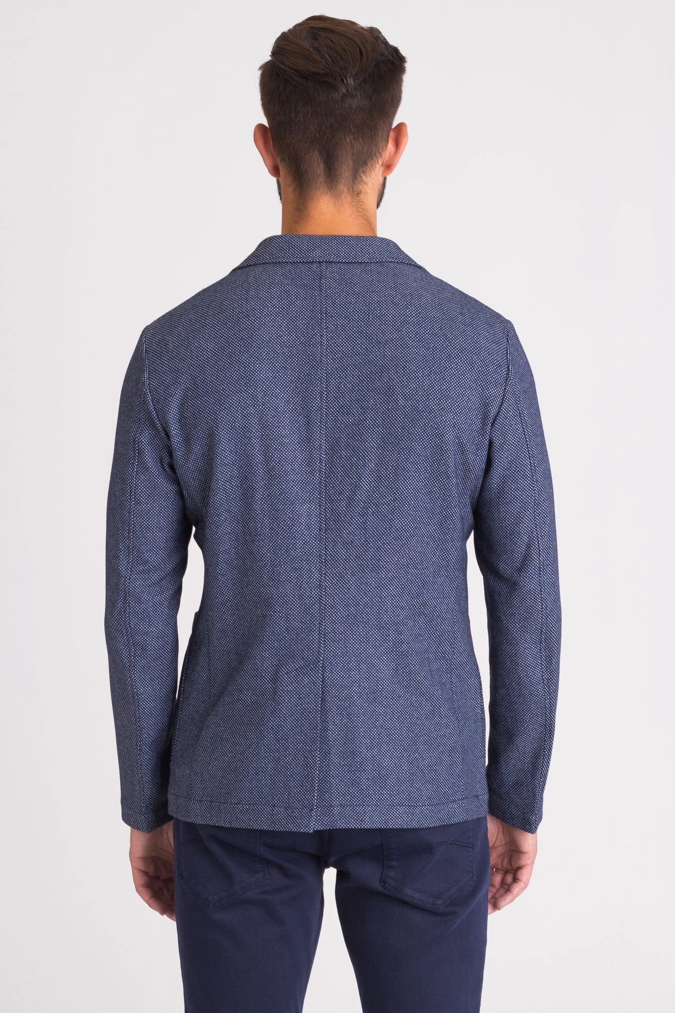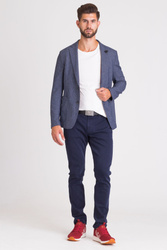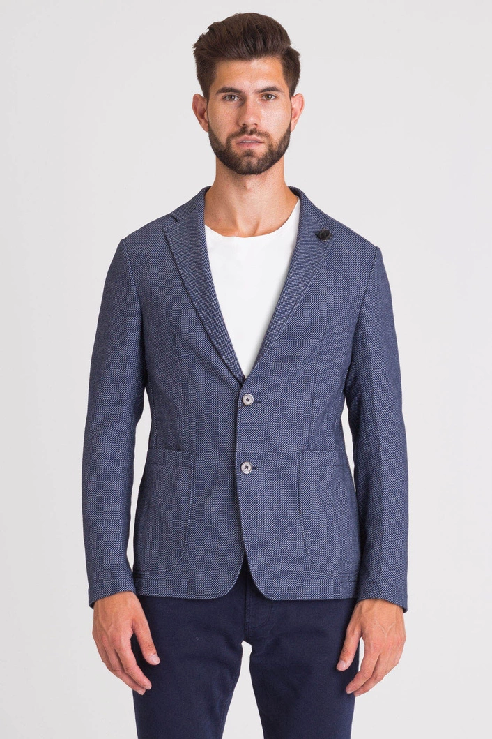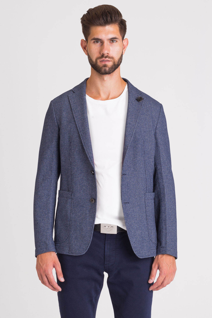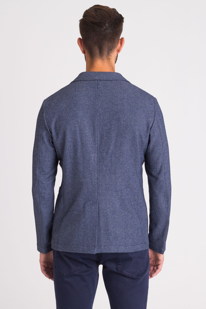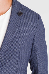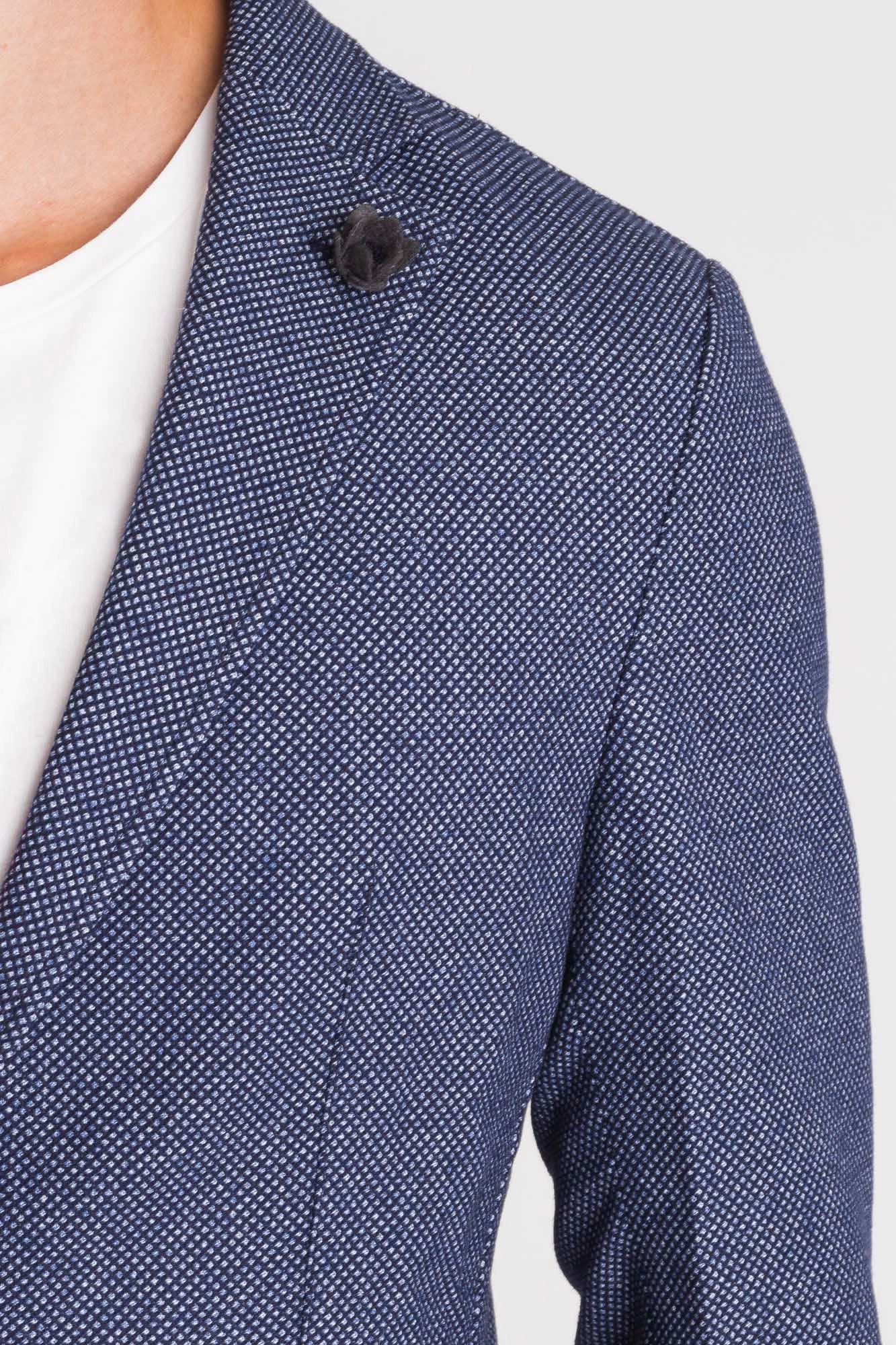 Niebieska marynarka o dopasowanym kroju w drobny biało-niebieski wzór. Zapinana na dwa guziki sygnowane logo marki. Z przodu dwie duże niezapinane kieszenie. Na klapie dopinany ozdobny kwiatek. Rękawy proste. Wewnątrz jedna kieszeń zapinana na guzik. Z tyłu jedno nacięcie. Marynarka nie posiada podszewki.