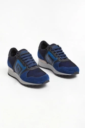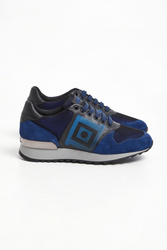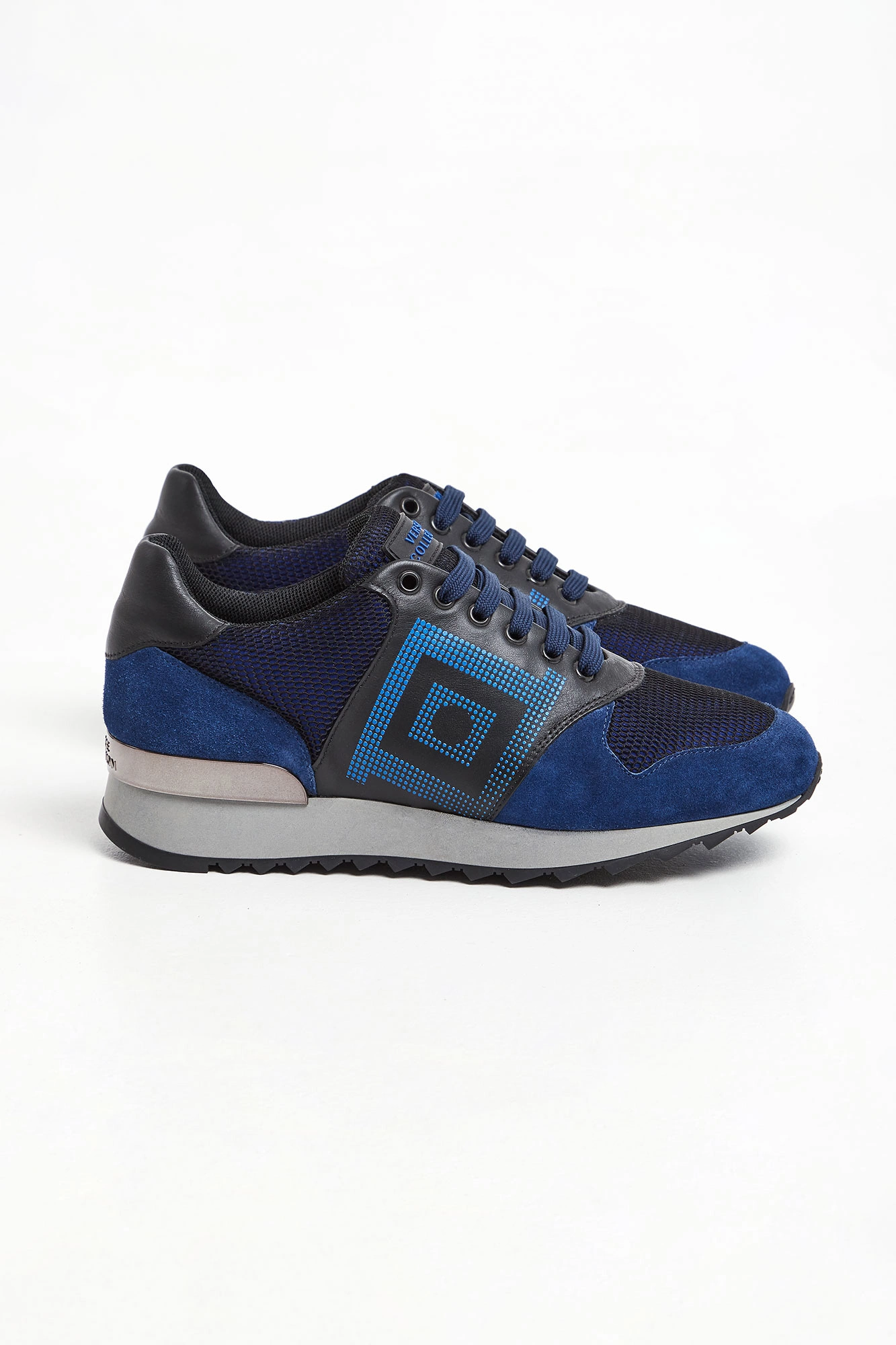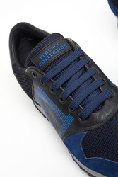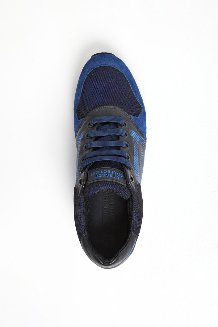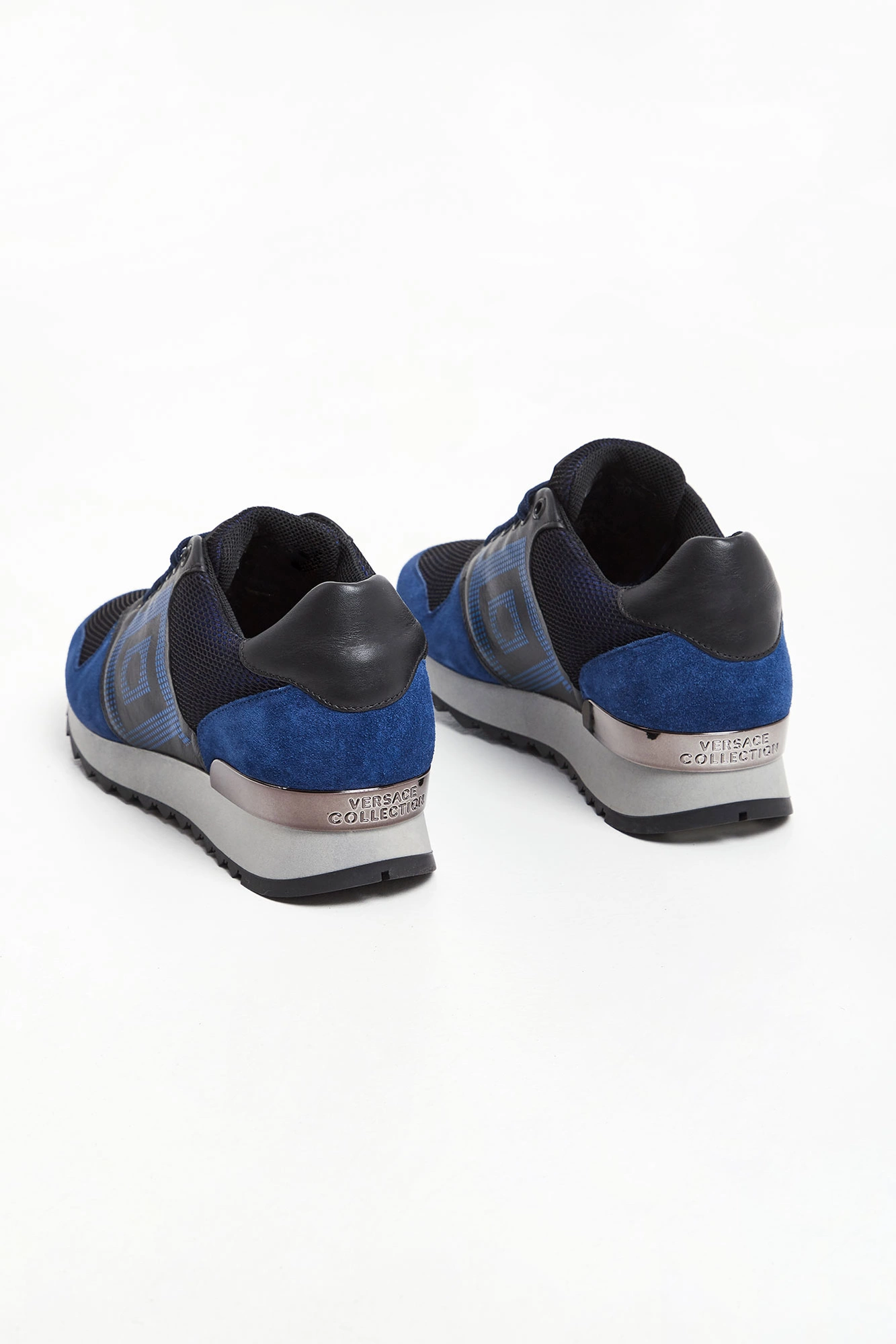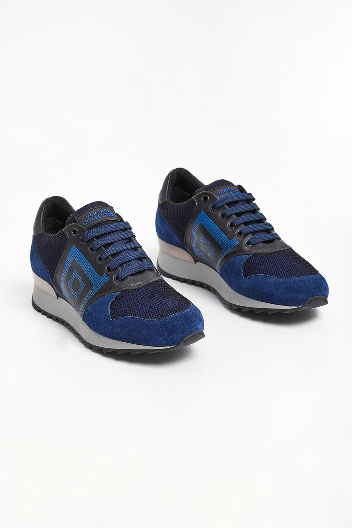 Sneakersy marki Versace Collection w kolorze niebieskim. Wykonane ze ze skóry zamszowej i syntetycznego materiału, gwarantującego odpowiednią wentylację stóp. Nosek okrągły. Wiązane za pomocą materiałowych. sznurówek. Język wykonany z siateczkowej tkaniny z gumową aplikacją z nazwą marki. Po bokach wzorzysta wstawka ze skóry naturalnej. Zapiętek z metalowym wykończeniem z nazwą marki. Sygnowana wkładka. Szara podeszwa z wysokogatunkowego tworzywa.