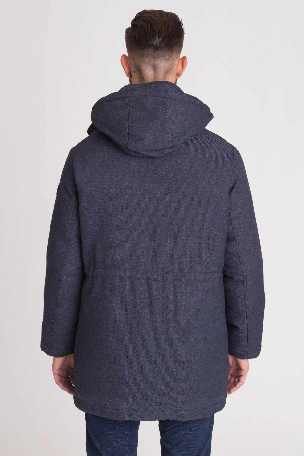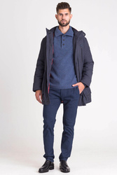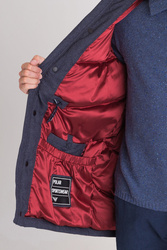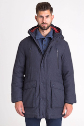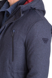 Niebieski płaszcz z kapturem o melanżowym splocie. Zapinany na zamek i napy. Z przodu cztery kieszenie, dwie zapinane na ukryte zamki, oraz dwie naszywane z patkami. Rękawy wykończone ukrytym ściągaczem w tym samym kolorze. Na lewym rękawie aplikacja w postaci logo marki. Wewnątrz podwójna kieszeń zapinana na napę. Regulowana w pasie wewnętrznym troczkiem. Podszewka w kurtce jak i w kapturze w kolorze czerwonym.