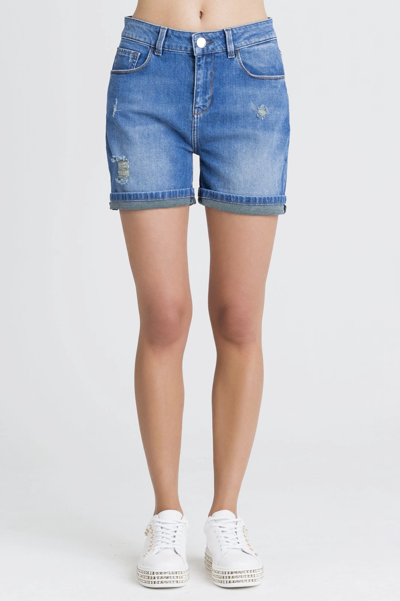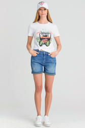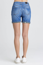Szorty jeansowe w niebieskim kolorze. Zapinane na zamek i guzik, sygnowany logo marki. Z przodu dwie kieszenie i bilonówka. Z tyłu dwie niezapinane kieszenie. Na nogawkach ozdobne przetarcia. Podszewka w odcieniach zieleni. Wykonane z wysokiej jakości bawełny z domieszką elastanu. Wygodne.