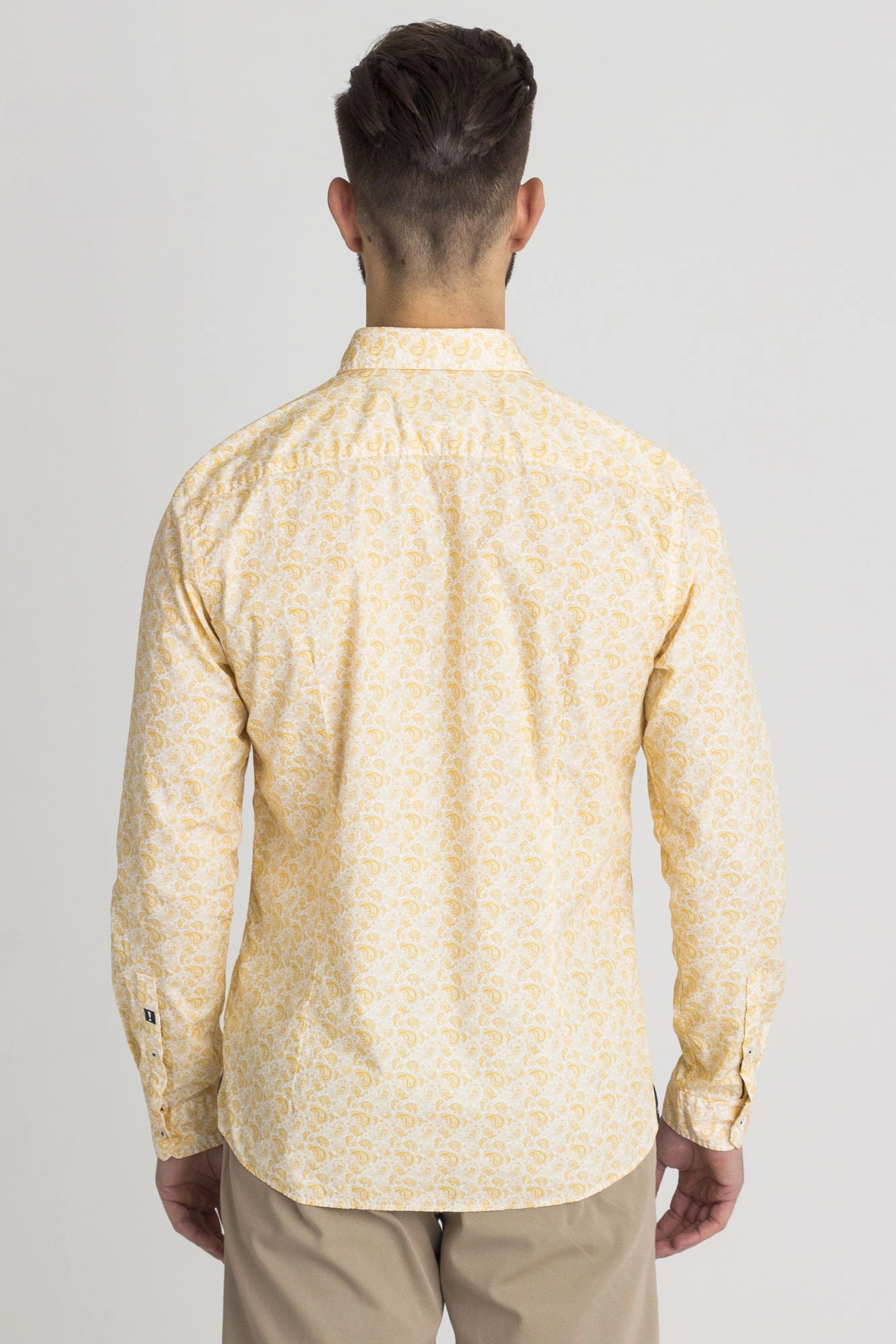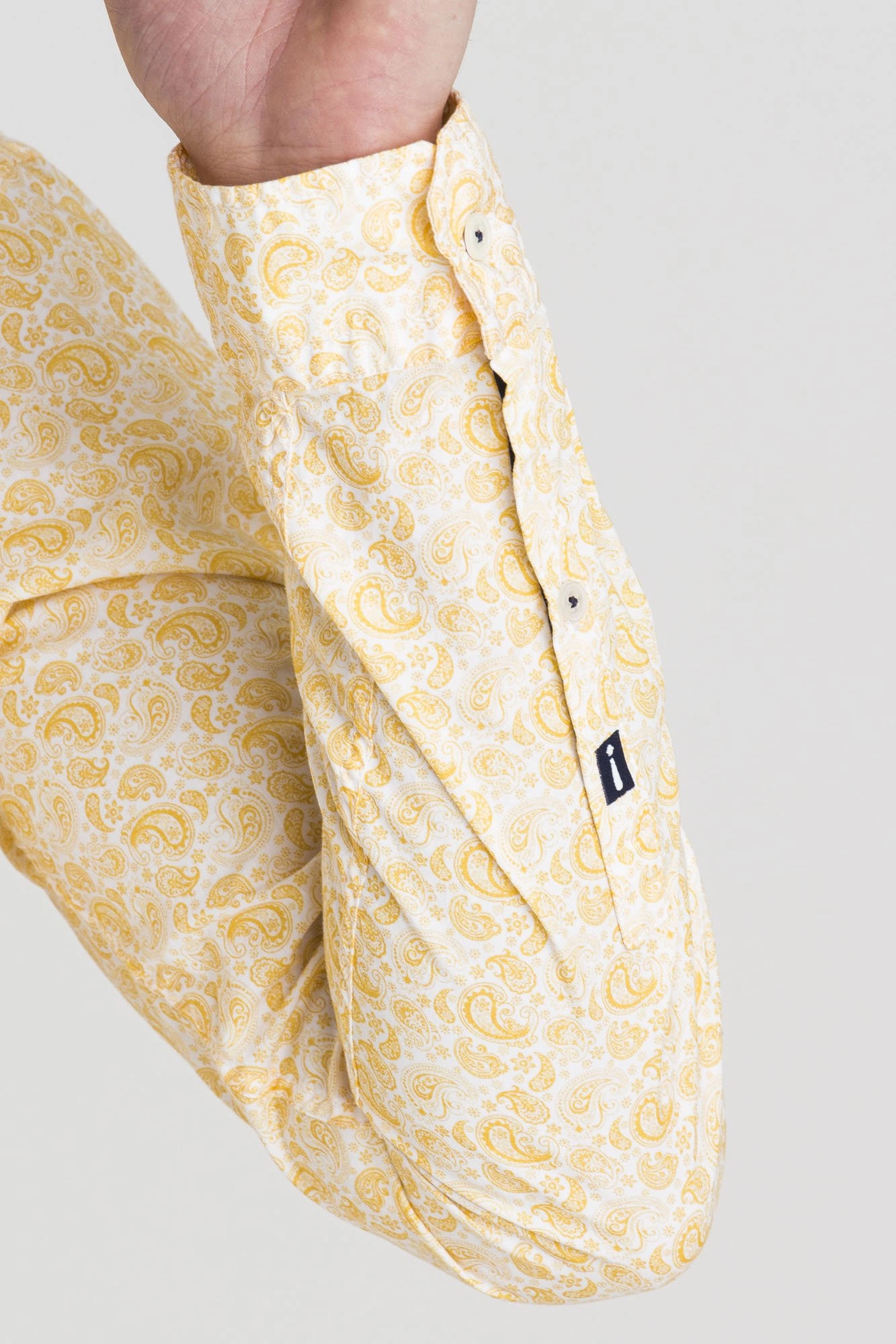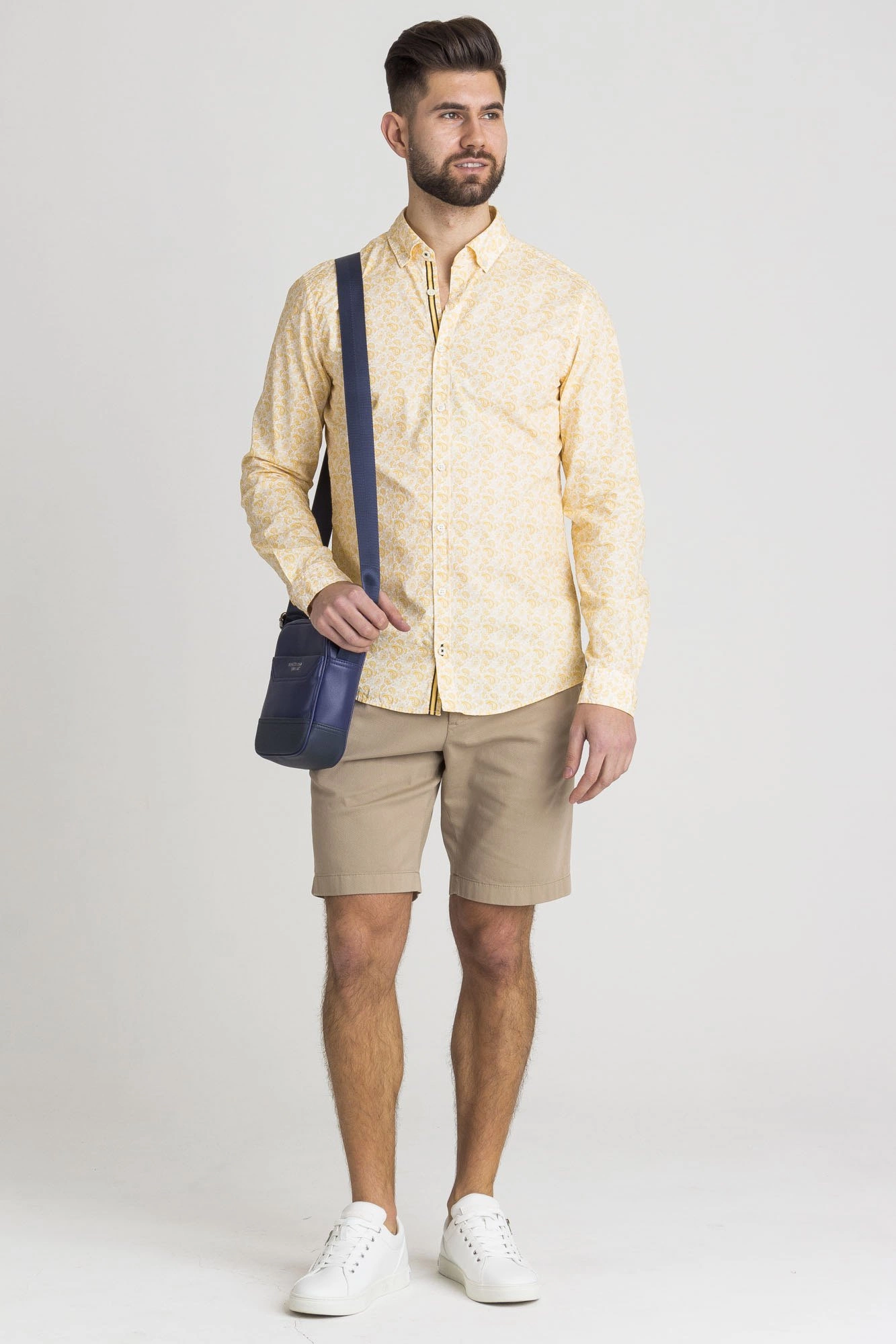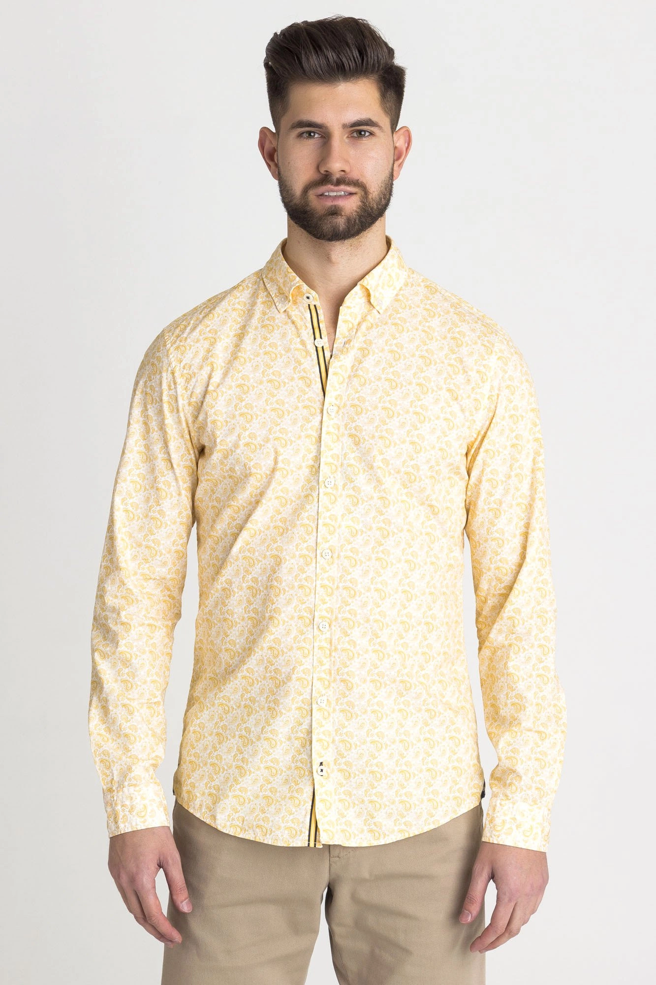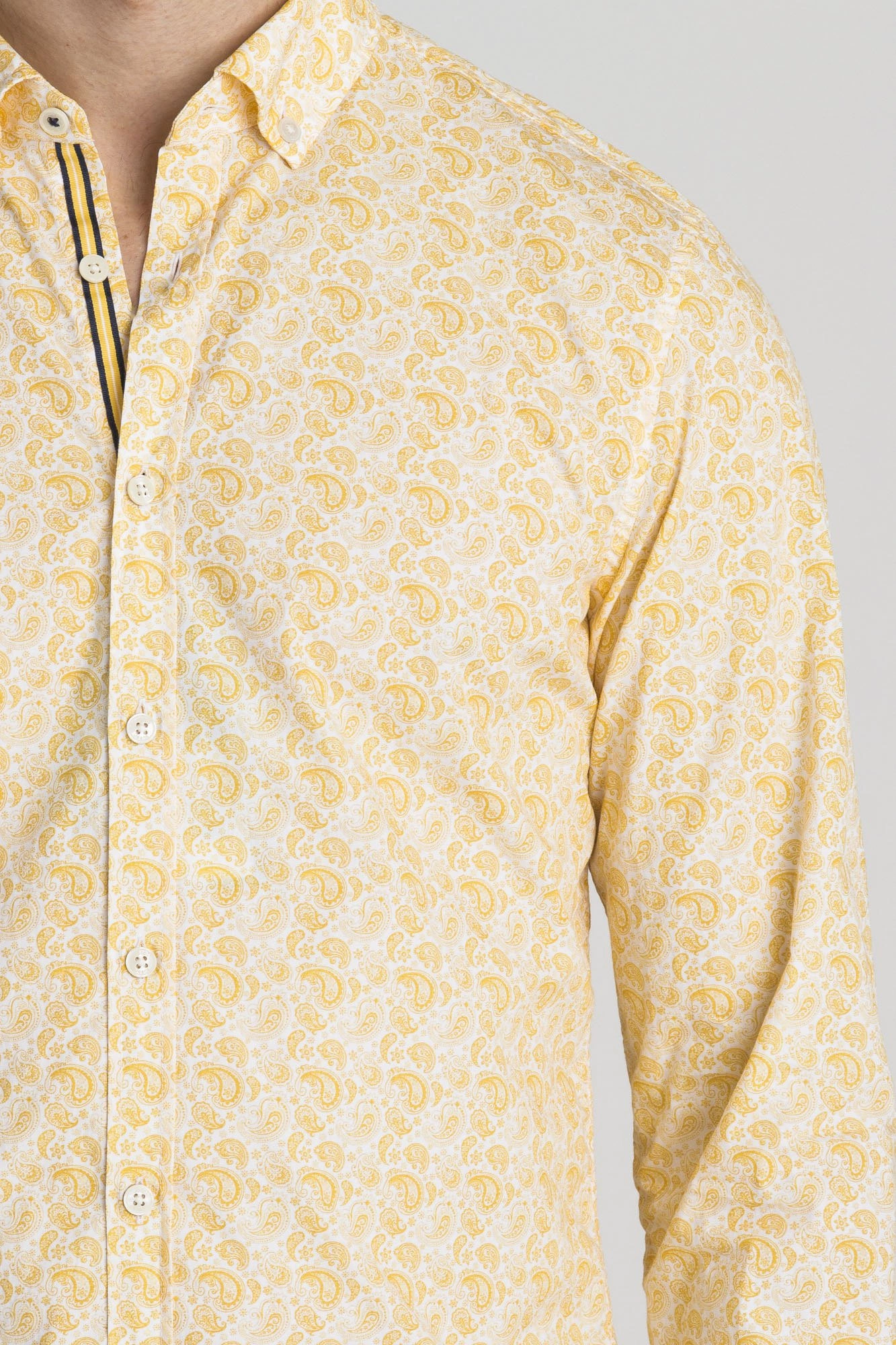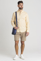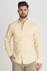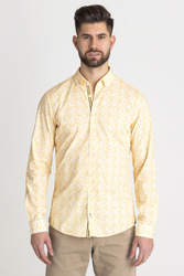 Wielokolorowa koszula we wzór. Fason slim fit. Kołnierzyk typu button-down. Zapinana na perłowe guziki, sygnowane logo marki. Mankiety ścięte zapinane na jeden guzik. Na dole po obu stronach aplikacja logo marki w kolorze czarnym. Wzdłuż guzików taśma ozdobna taśma.