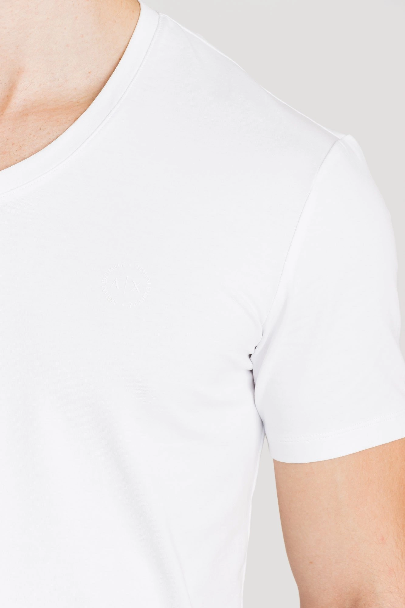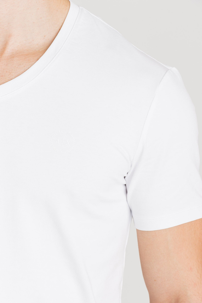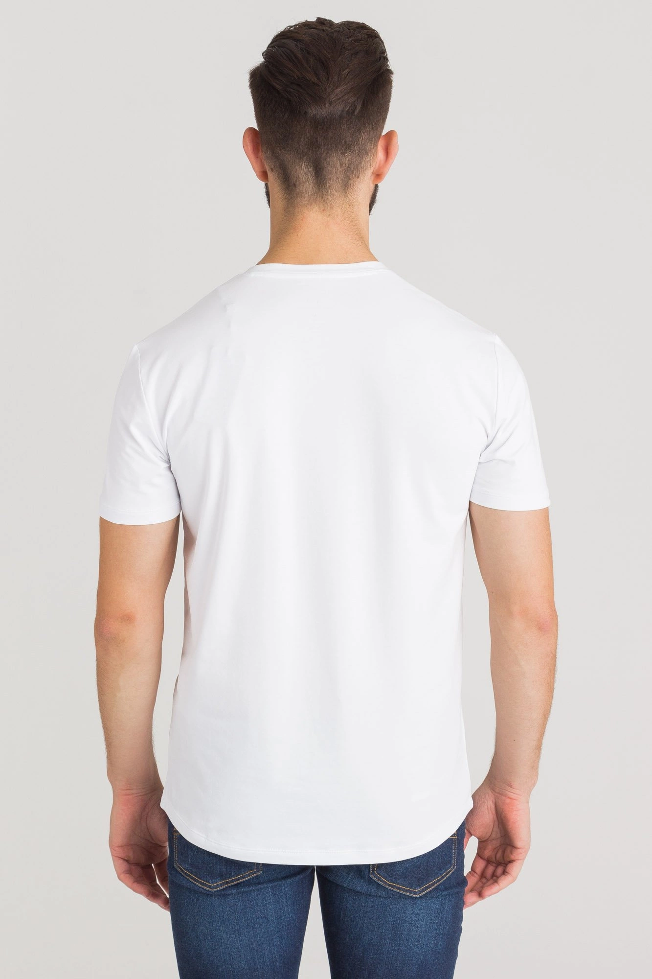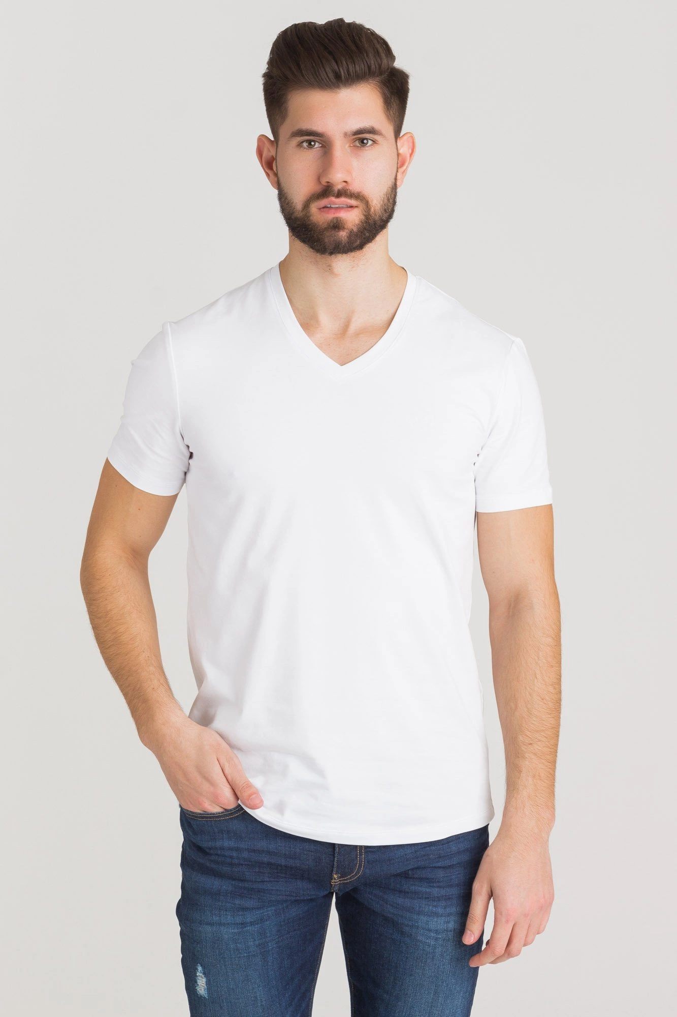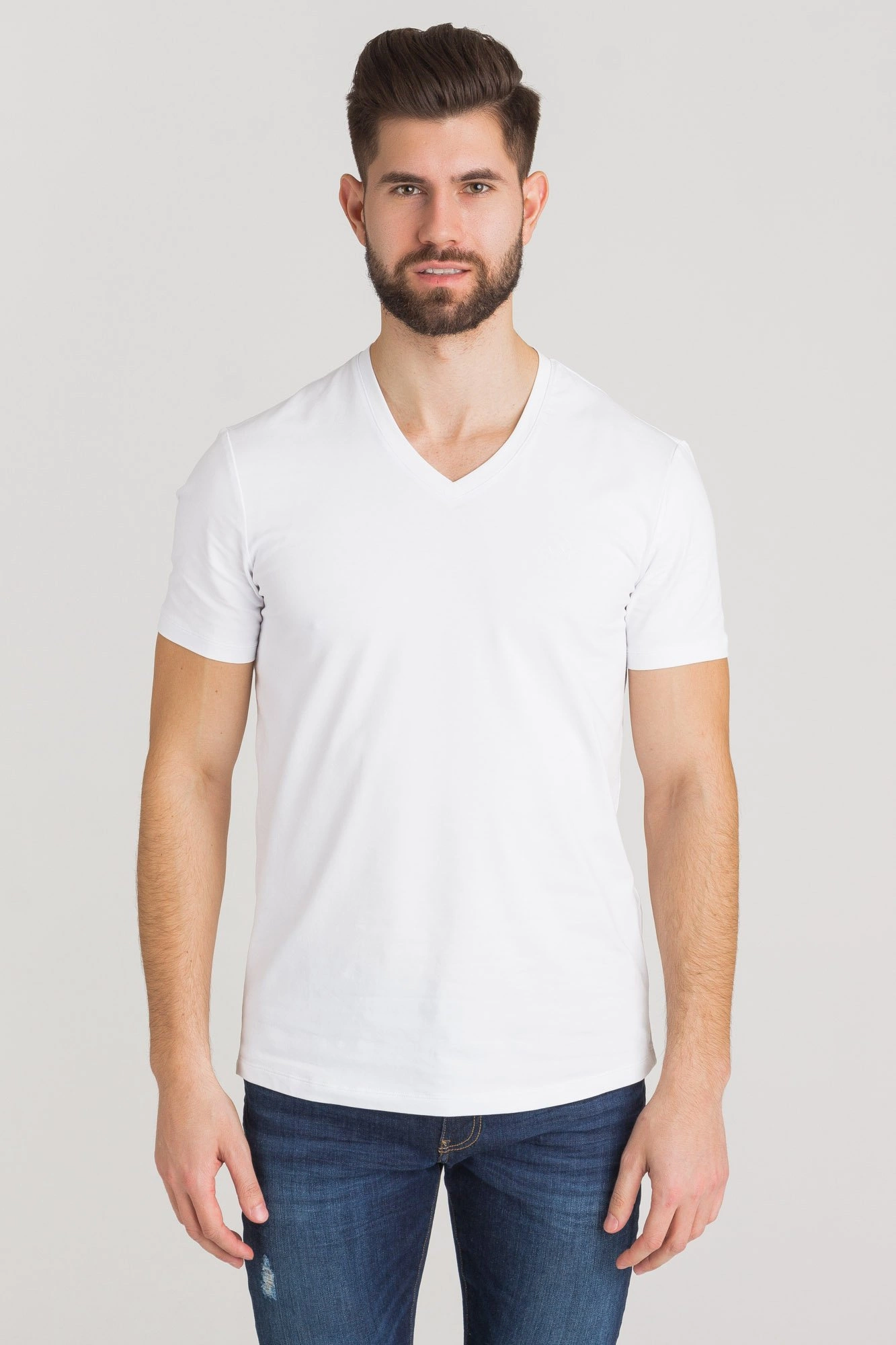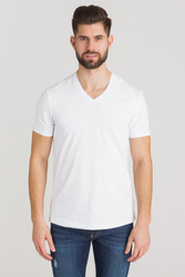 Biały t-shirt o prostym fasonie. Dekolt typu v-neck. Wykonany z wysokiej jakości bawełny. Koszulka miękka, przyjemna w dotyku i lekko elastyczna.