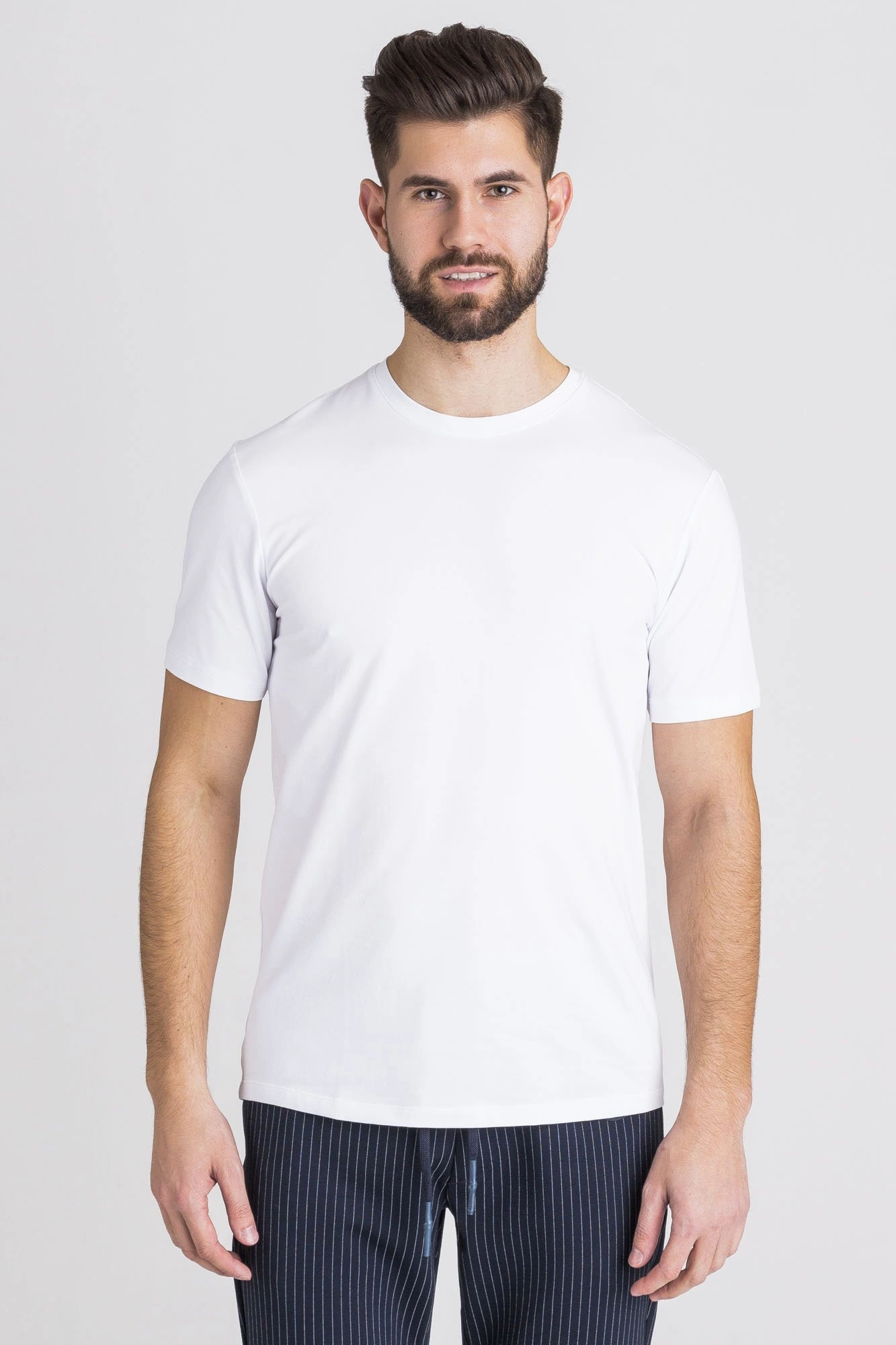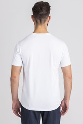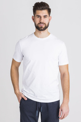 Biały t-shirt o prostym fasonie. Dekolt typu o-neck. Z przodu niewielkie, okrągłe logo marki w tym samym kolorze. Wykonany z wysokiej jakości bawełny z dodatkiem elastanu. Przyjemny w dotyku, miękki, wygodny i elastyczny.