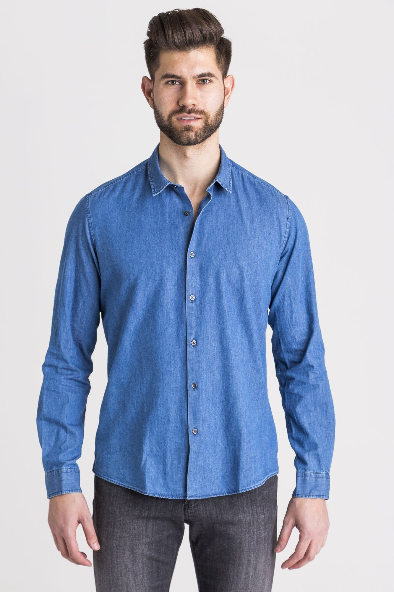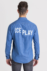 Niebieska koszula jeansowa o dopasowanym kroju. Kołnierzyk prosty typu kent. Zapinana na czarne guziki. Mankiet prosty zapinany na jeden guzik. Z tyłu biały nadruk logo marki. Wykonana z wysokiej jakości bawełny. Wygodna, przyjemna w dotyku i lekko elastyczna.