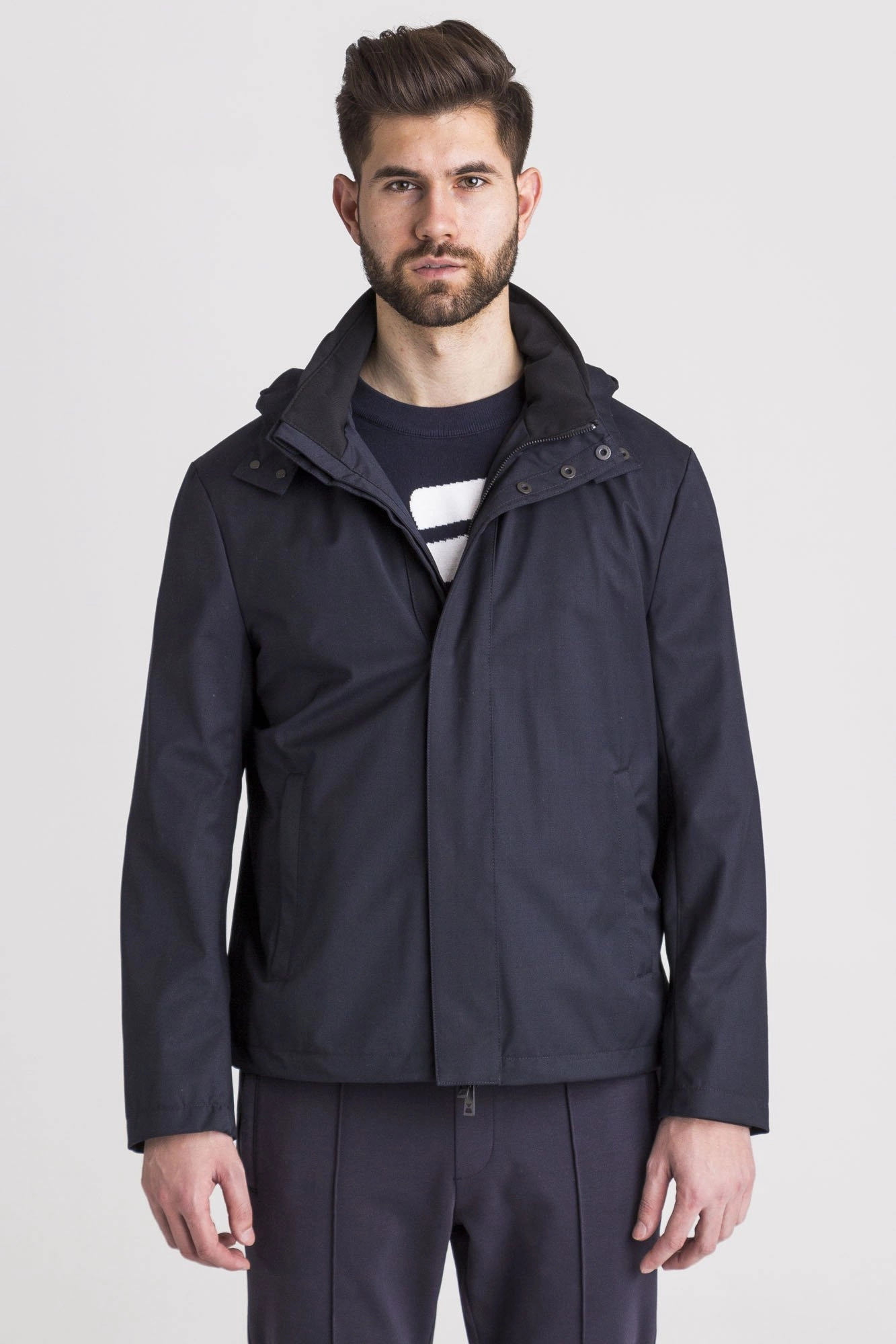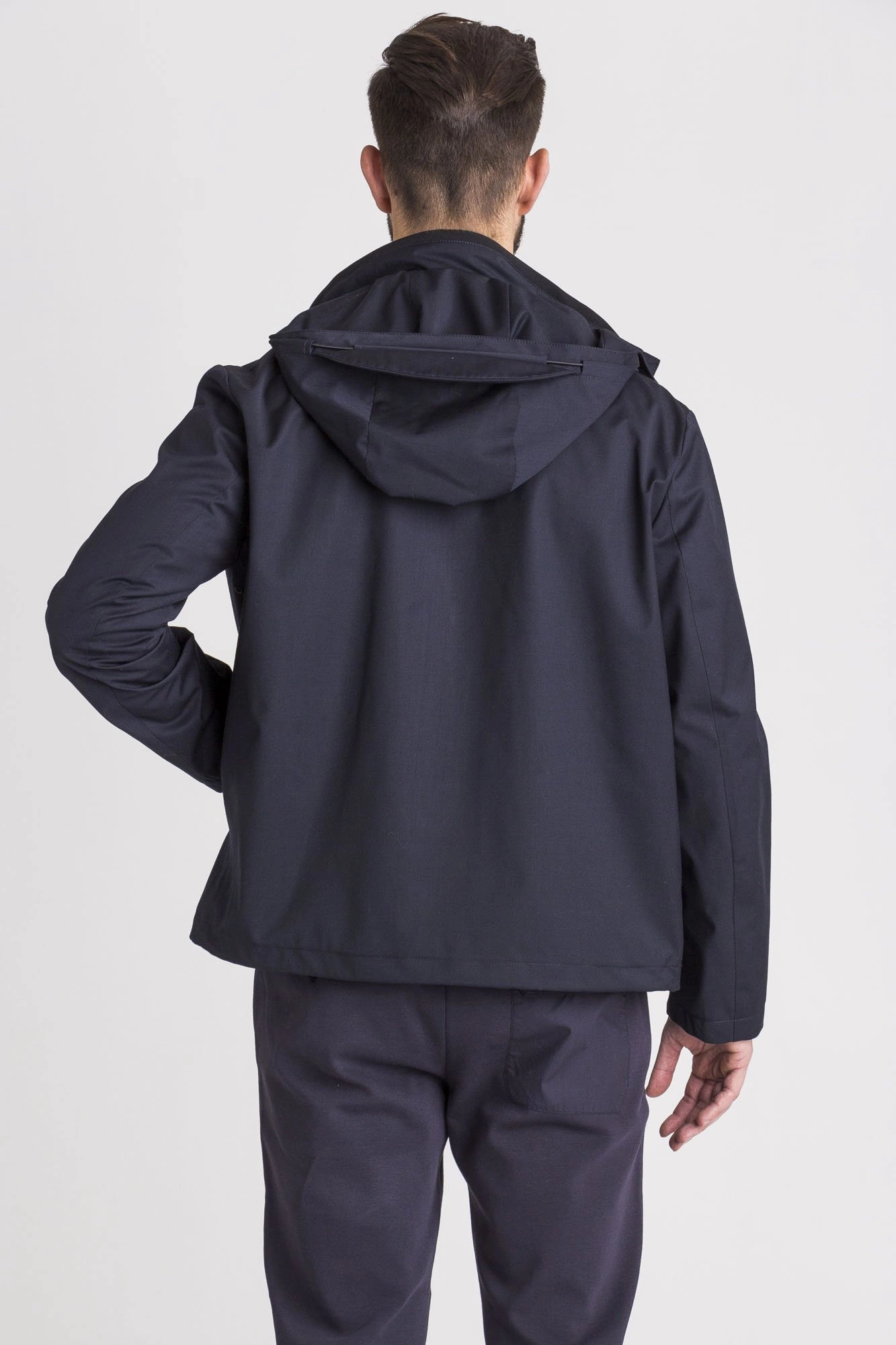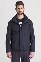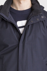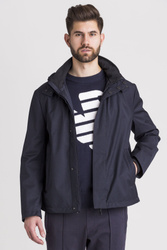 Granatowa kurtka z kapturem. Zapinana na dwukierunkowy zamek, sygnowany logo marki i napy. Z przodu dwie kieszenie. Kaptur odpinany. Wykonana z wysokiej jakości materiałów. Przyjemna w dotyku i wygodna.
