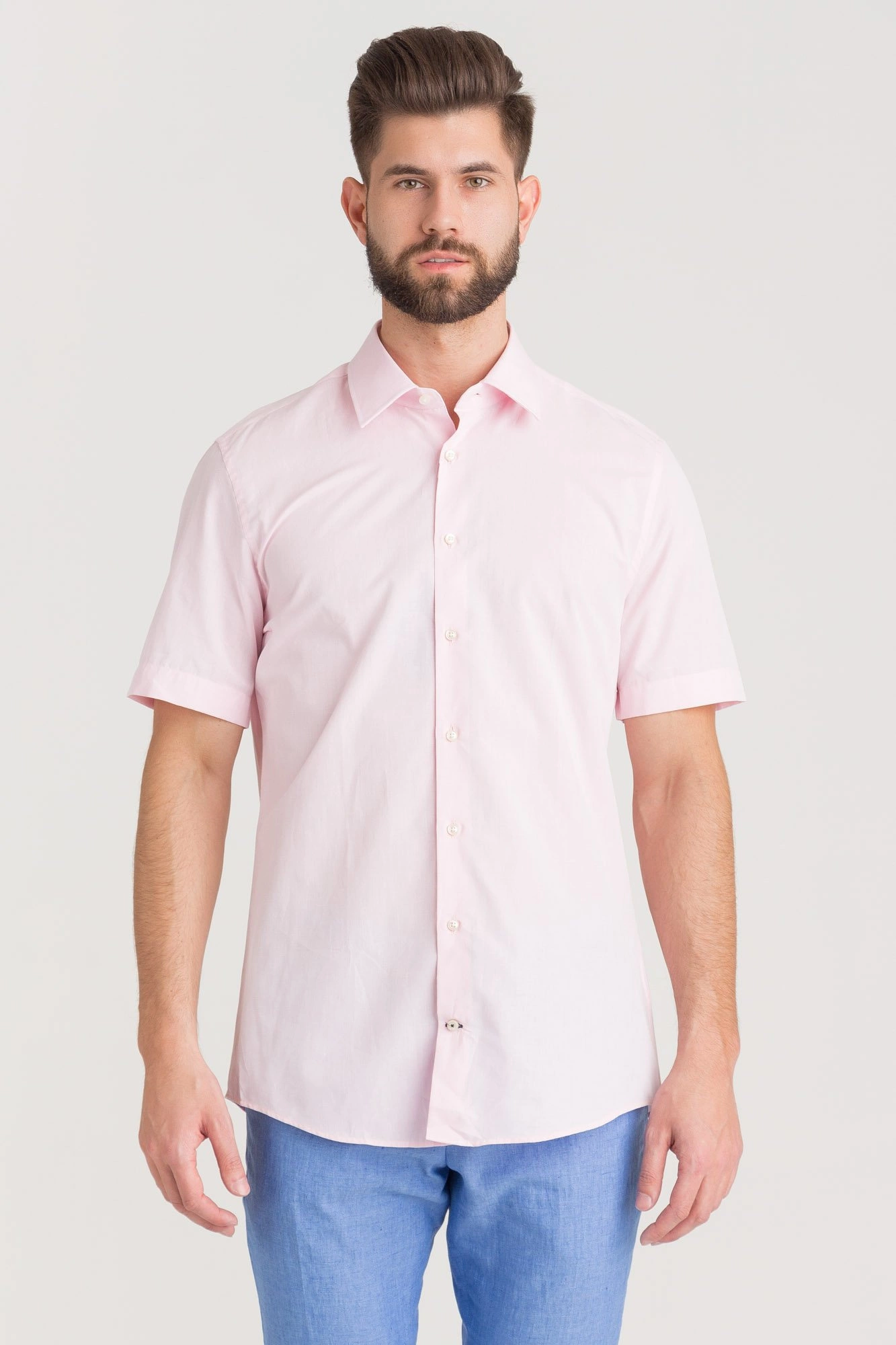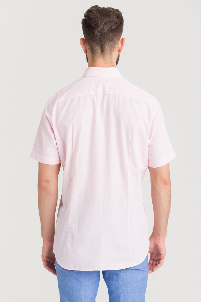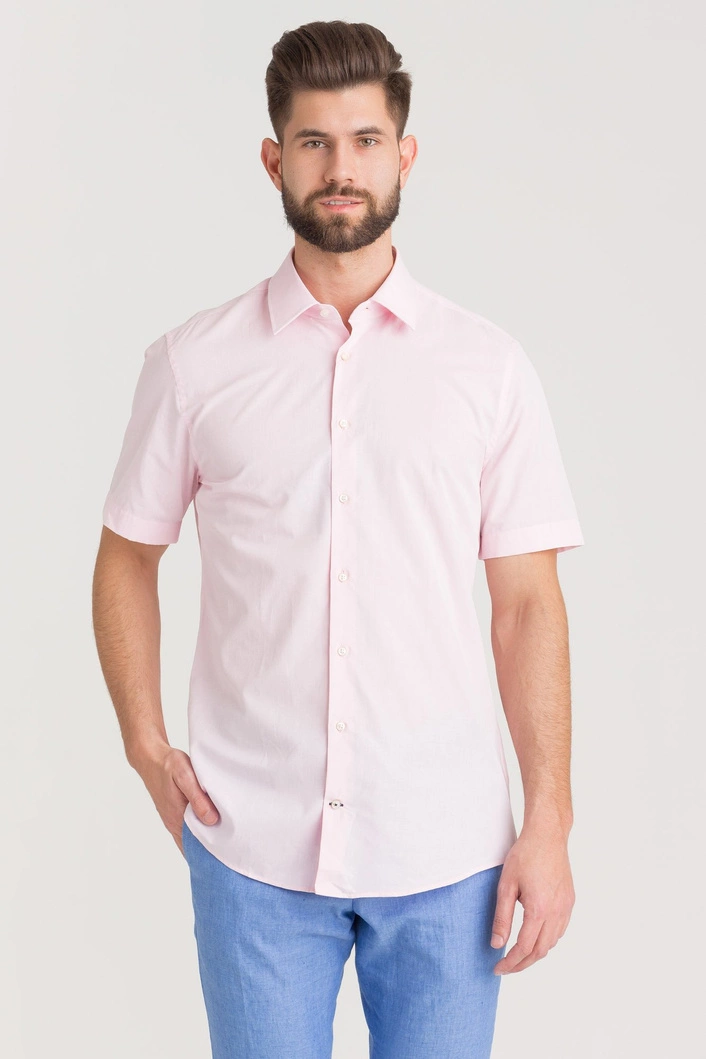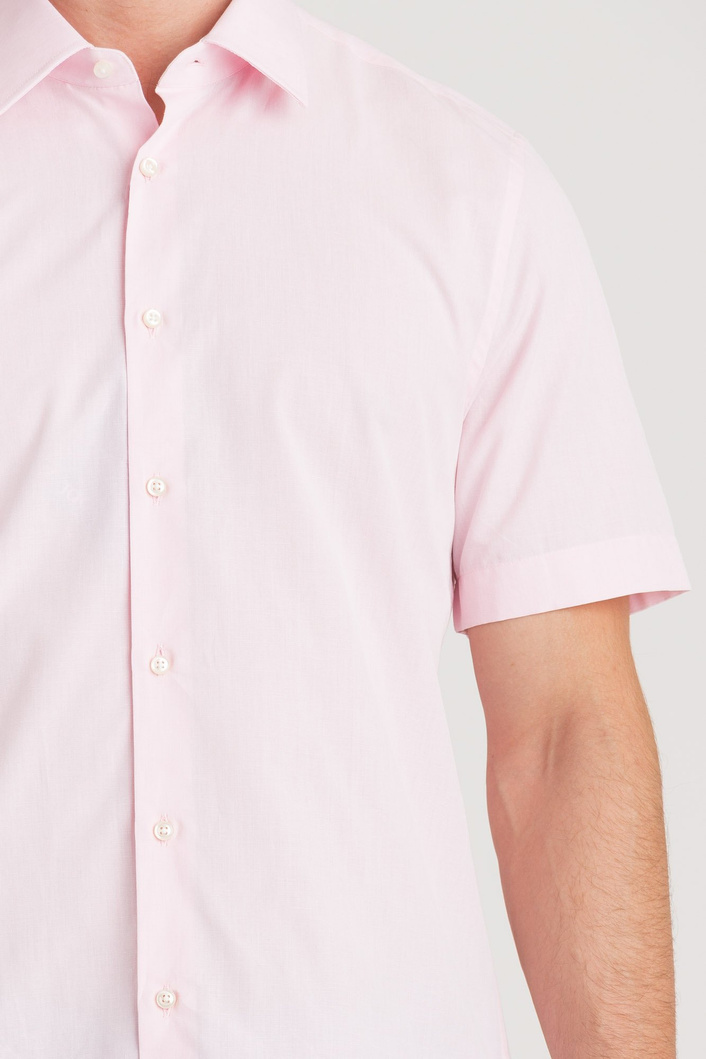 Różowa koszula o fasonie slim. Kołnierzyk prosty, typu kent. Zapinana na drobne perłowe guziki. Koszula z krótkim rękawem. Wykonana z wysokiej jakości bawełny z domieszką lnu. Przyjemna w dotyku, komfortowa i wygodna.