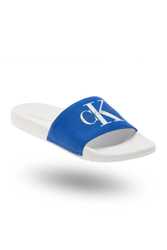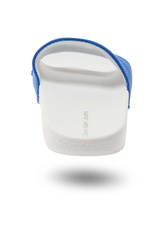 Klapki w kolorze białym. Góra w kolorze niebieskim, od spodu wyściełane miękką gąbką i tkaniną. Z przodu nadruk logo marki w kolorze białym. Wyprofilowana, porowata wkładka z logo marki. Podeszwa o grubości 2 cm.