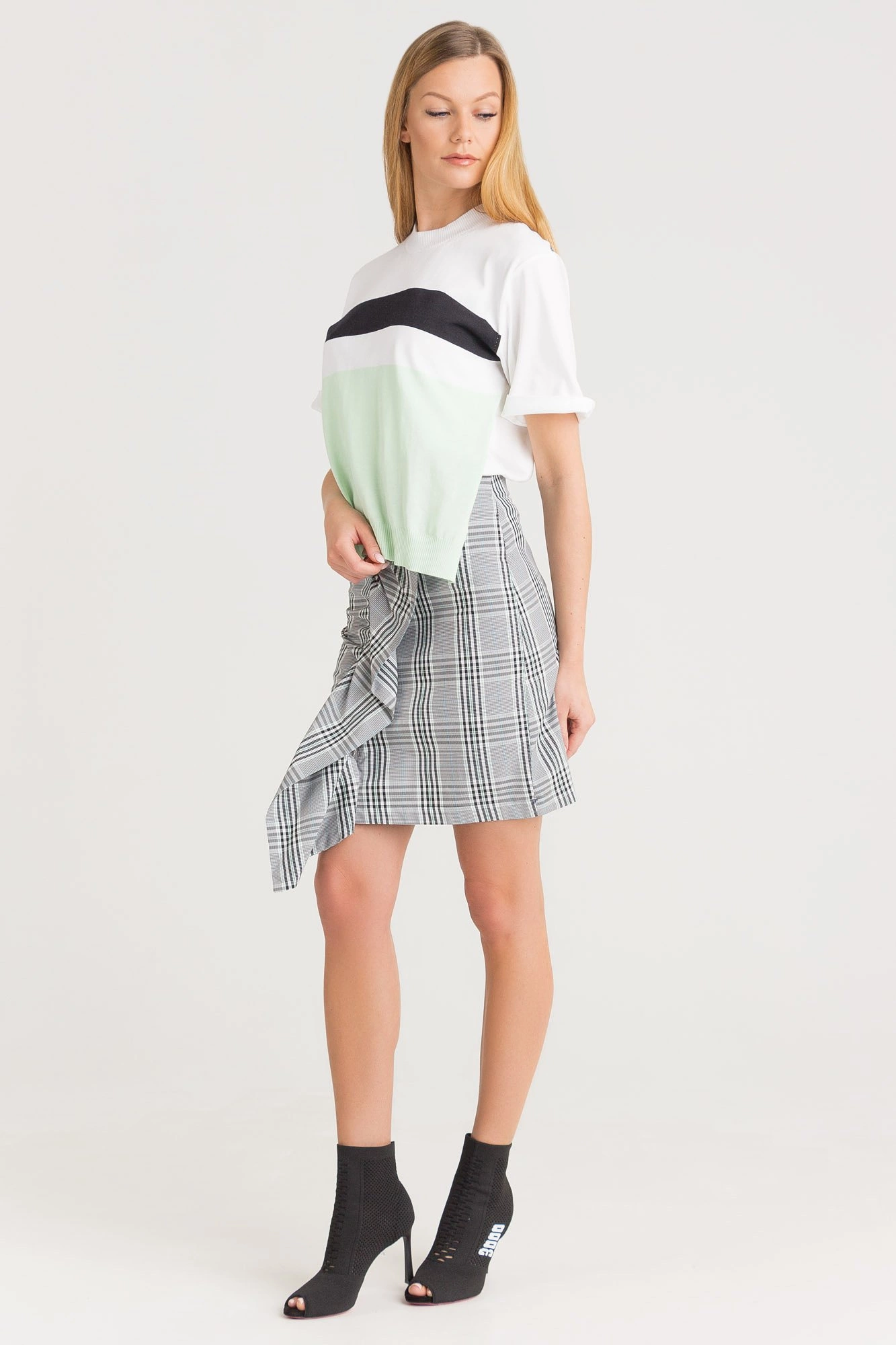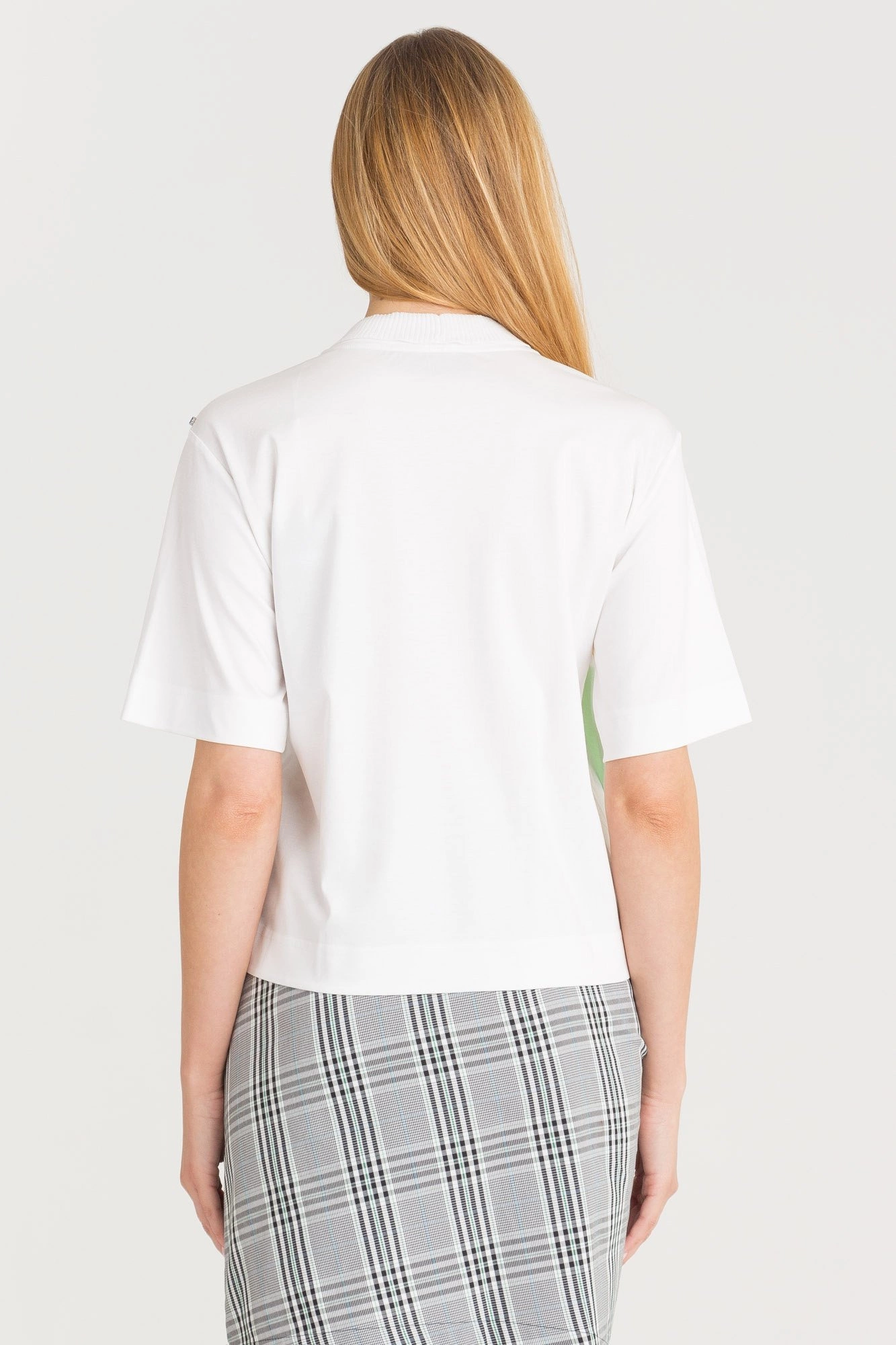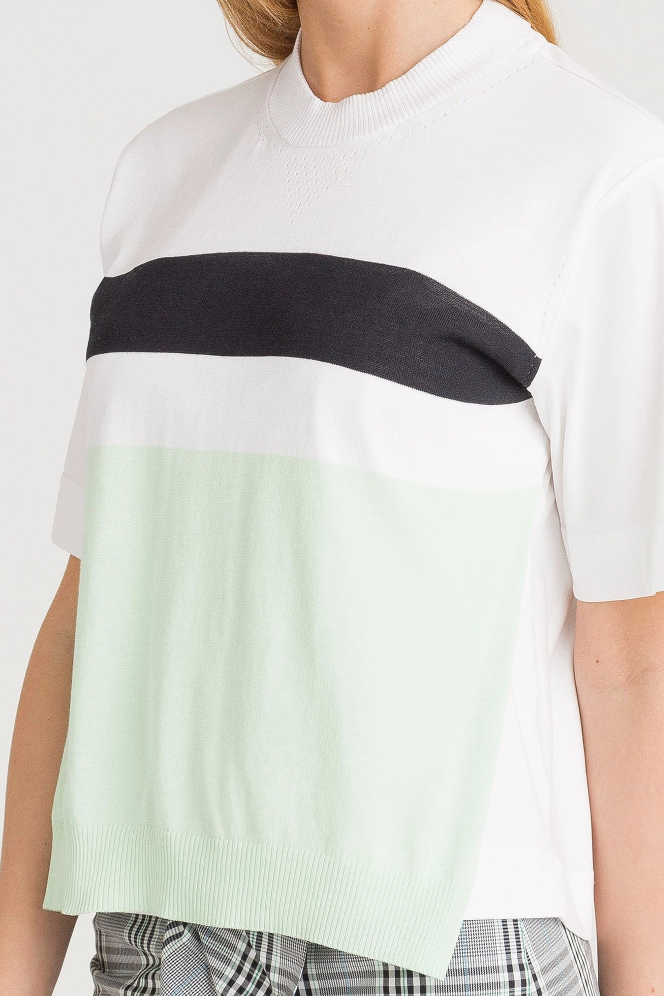 Bluzka w białym kolorze o prostym fasonie. Dekolt typu o-neck. Z przodu pasy w kolorach: białym, seledynowym i czarnym. Dół i dekolt wykończony ściągaczem. Na lewym ramieniu niewielka aplikacja w postaci błękitnego kryształu. Z tyłu, przy dekolcie, dzianinowa taśma w białym kolorze. Bluzka wykonana z wysokiej jakości bawełny i modalu. Miękka, komfortowa i przyjemna w dotyku.