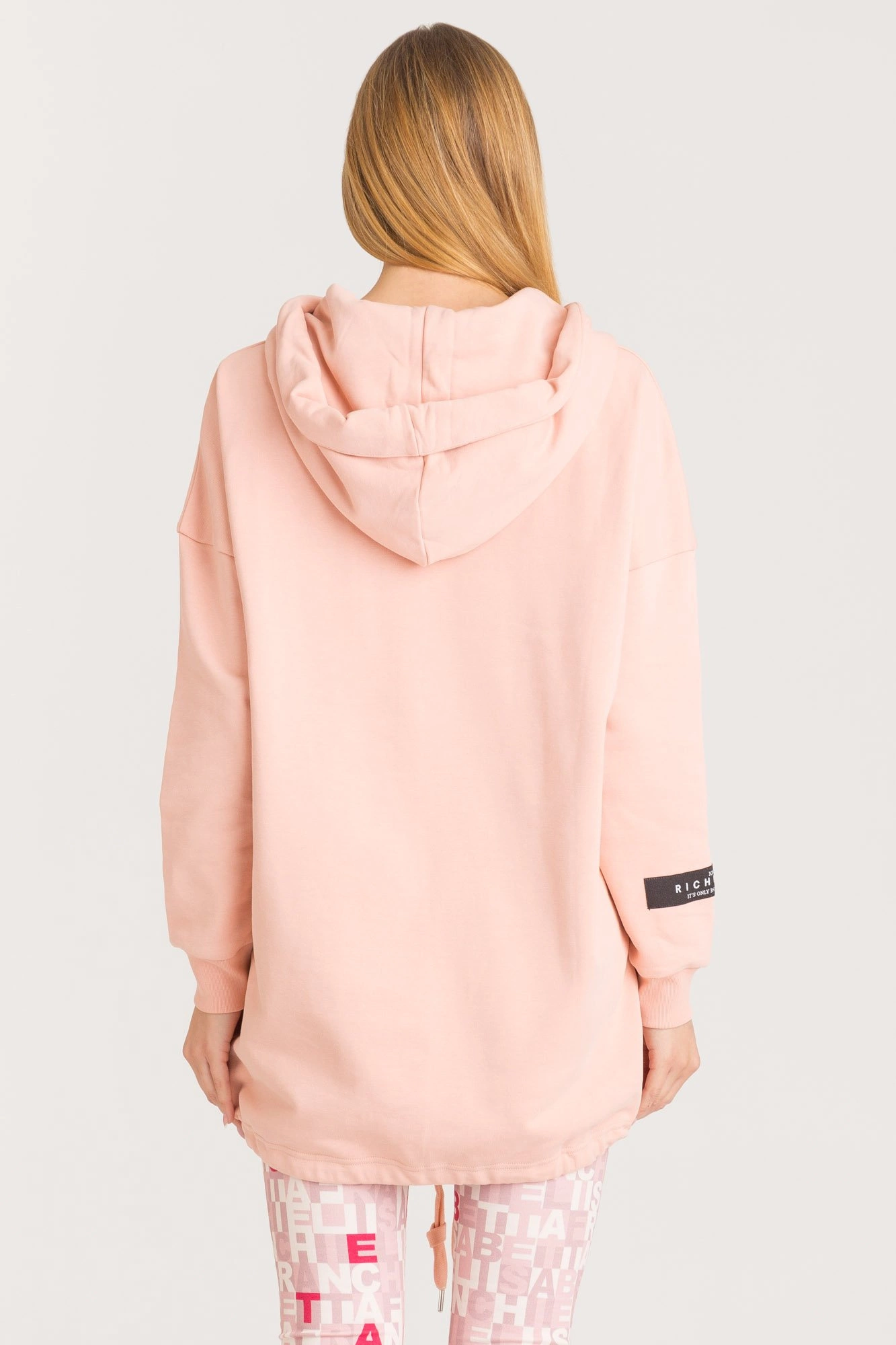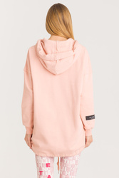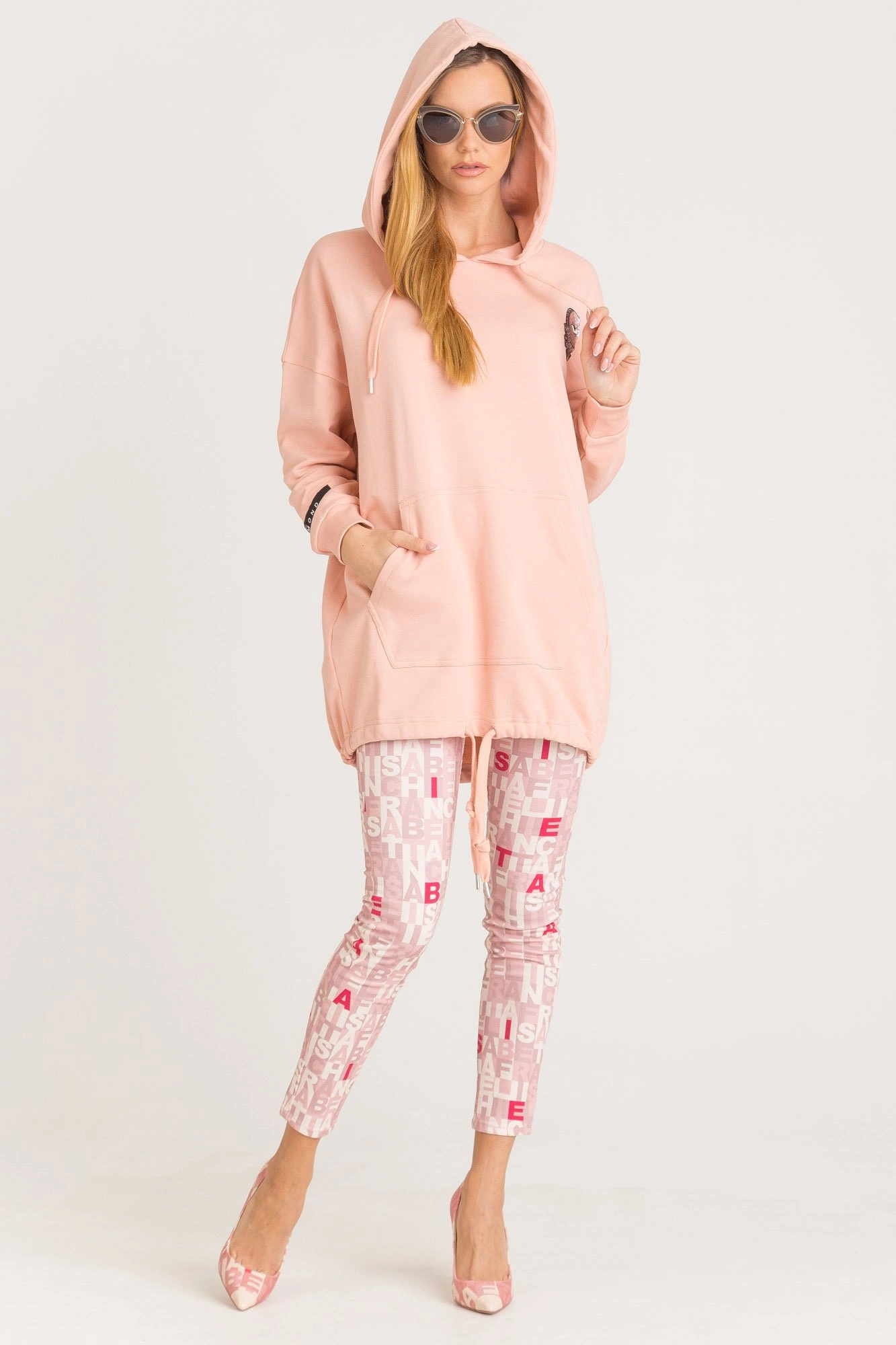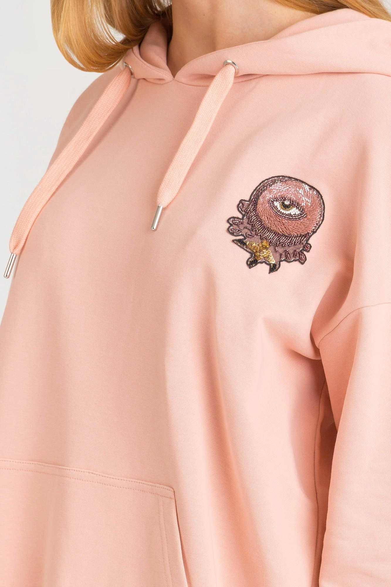 Bluza w kolorze antycznego różu, o luźnym fasonie z kapturem. Kaptur regulowany za pomocą troczków w tym samym kolorze.Z przodu kieszeń typu "kangurka". Z lewej strony wielokolorowa aplikacja. Wykonana z wysokiej jakości tkaniny. Miękka w dotyku, wygodna, elastyczna.