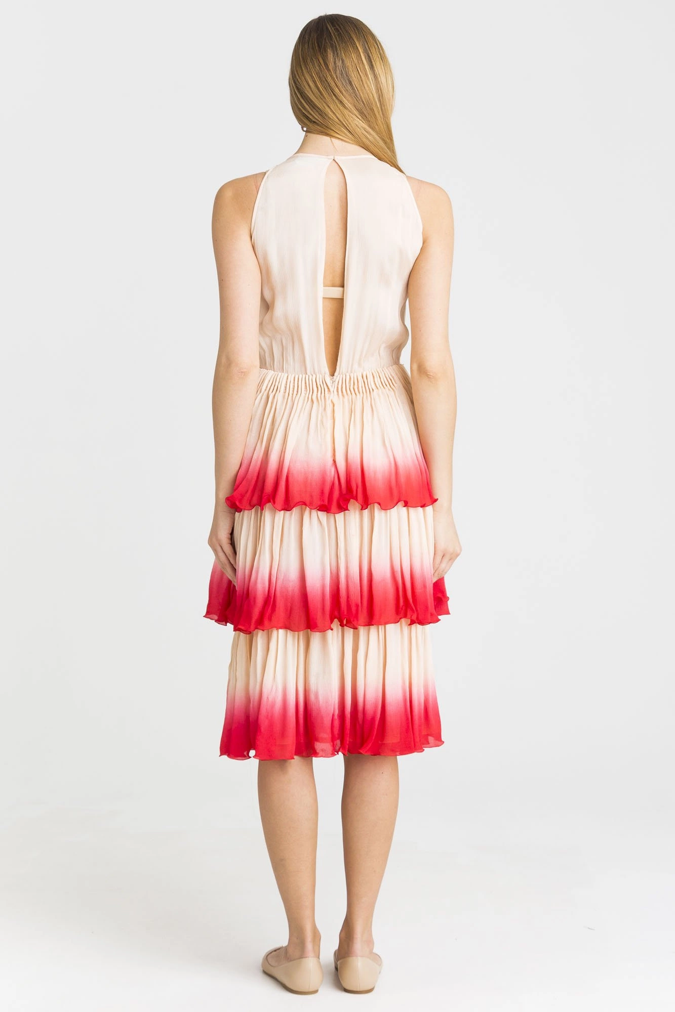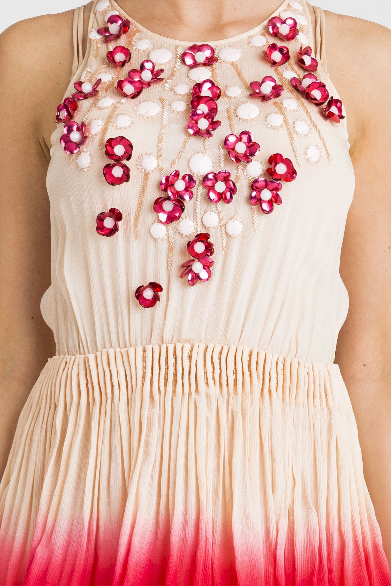 Sukienka marki Elisabetta Franchi w jasnym kolorze brzoskwiniowym z elementami różu. Fason regular fit, długość midi. Zapinana z tyłu na niewielki guzik. Dekolt typu o-neck. Góra bogato zdobiona wielokolorowymi aplikacjami w postaci cekinów i koralików. Odcinana i marszczona w pasie. Dół lekko rozkloszowany, wykończony rzędami czerwonych falban. Przy pasie drobne ozdobne koraliki. Sukienka wykonana z wysokiej jakości materiałów. Zwiewna, lekka i przyjemna w dotyku.