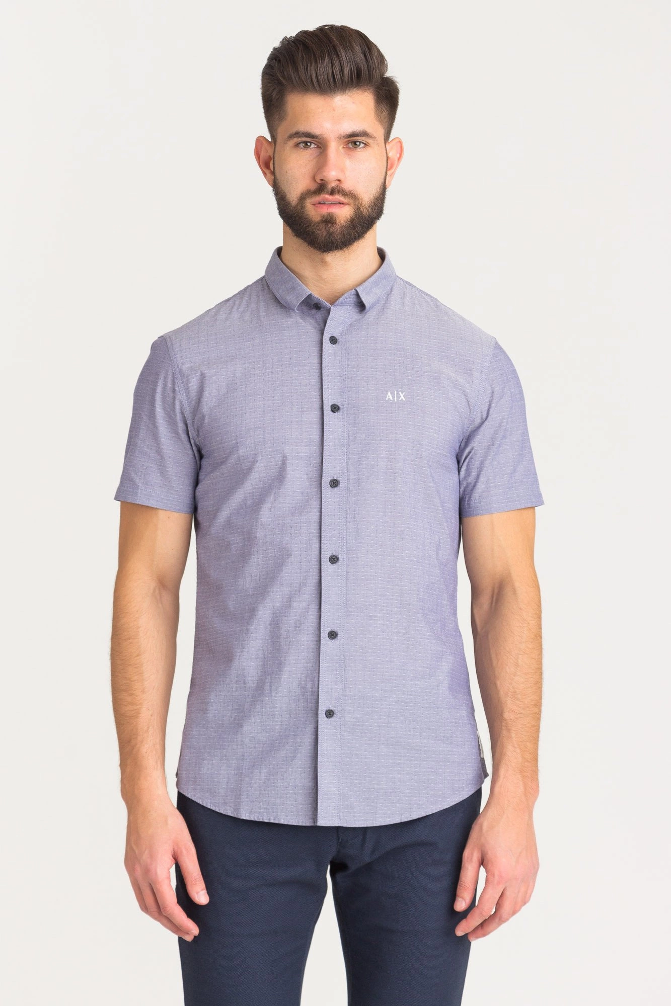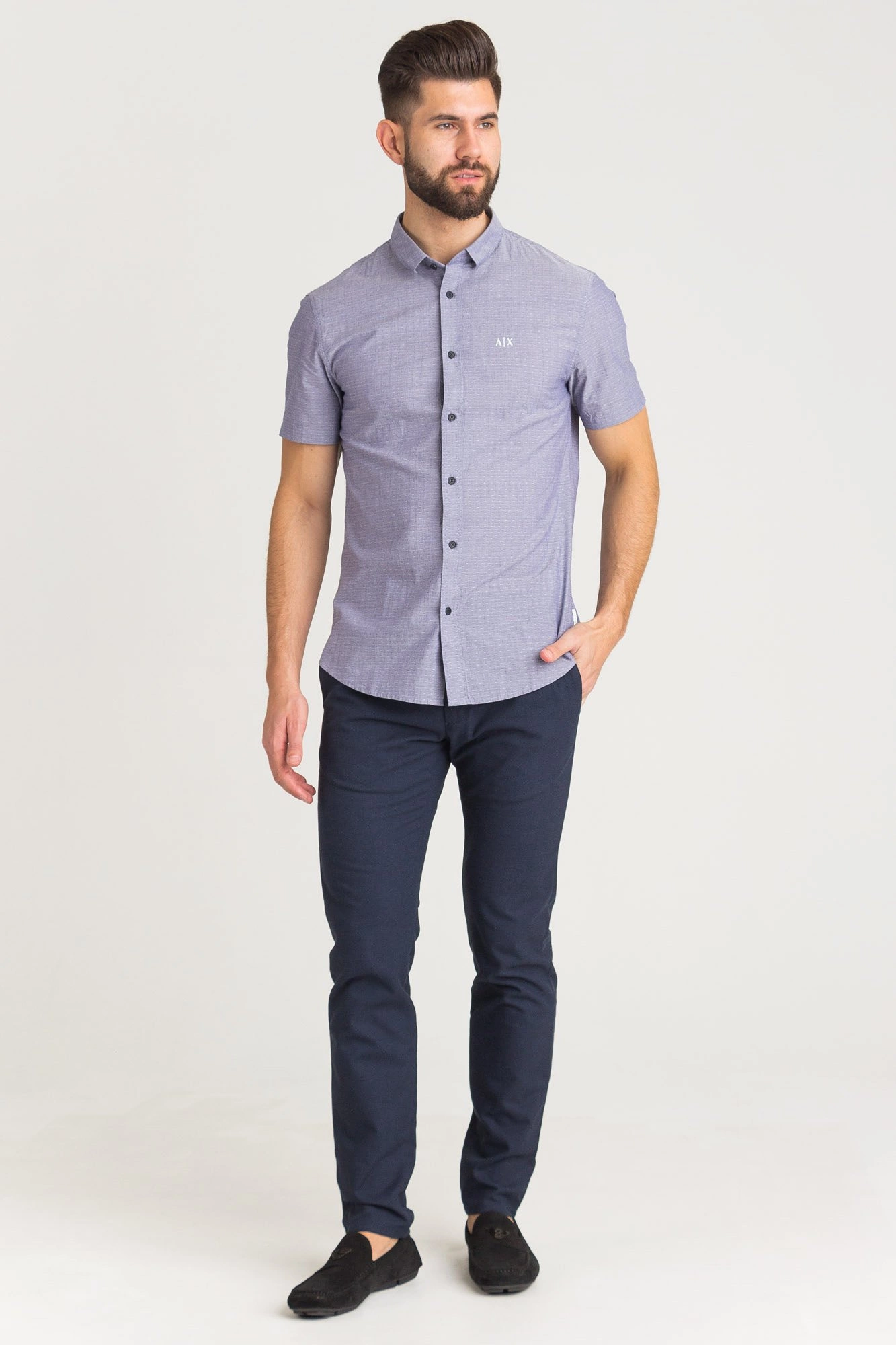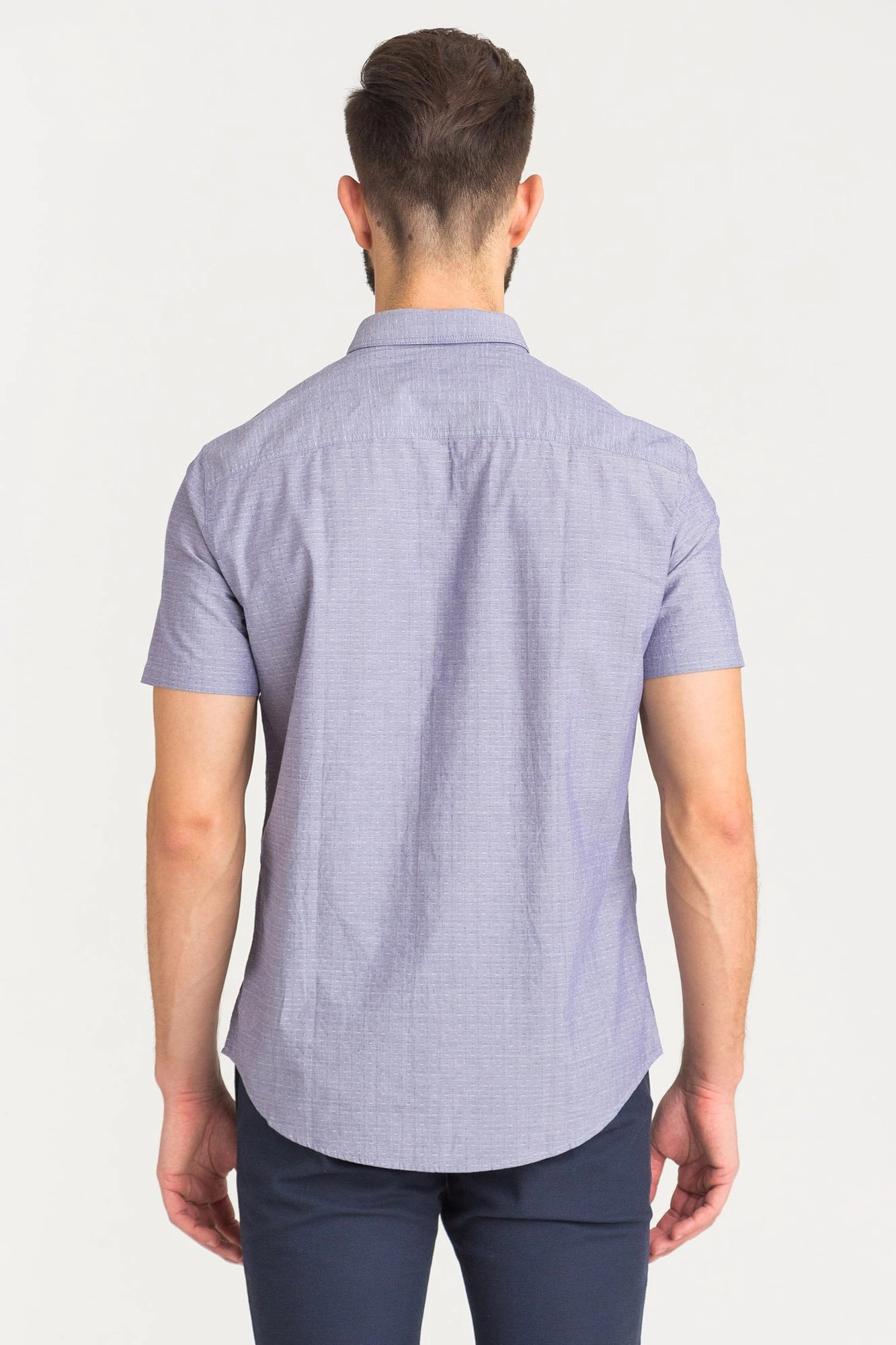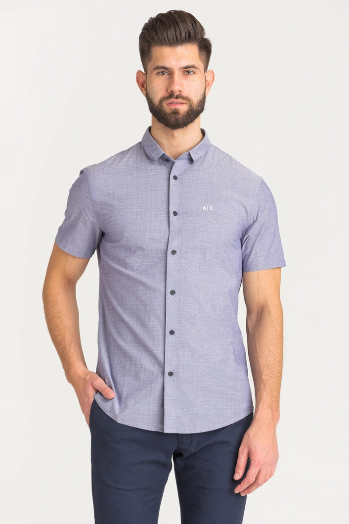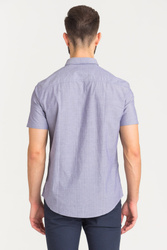 Niebieska koszula z krótkim rękawem. Kołnierzyk prosty. Zapinana na granatowe guziki sygnowane logo marki. Wykonana z wysokiej jakości tkaniny. Na całości drobny wzór. Przewiewna, przyjemna w dotyku i wygodna.