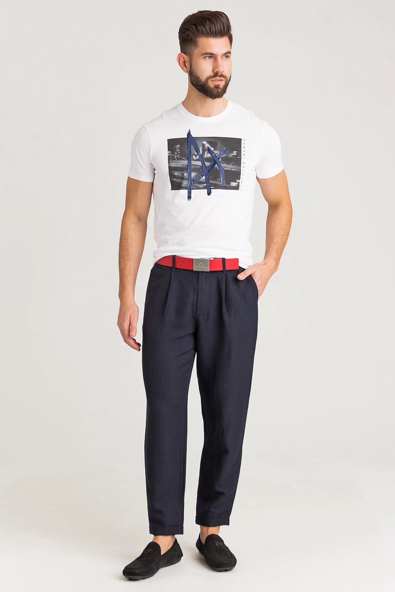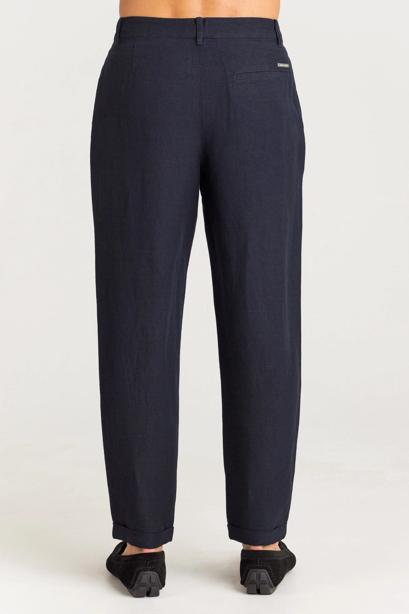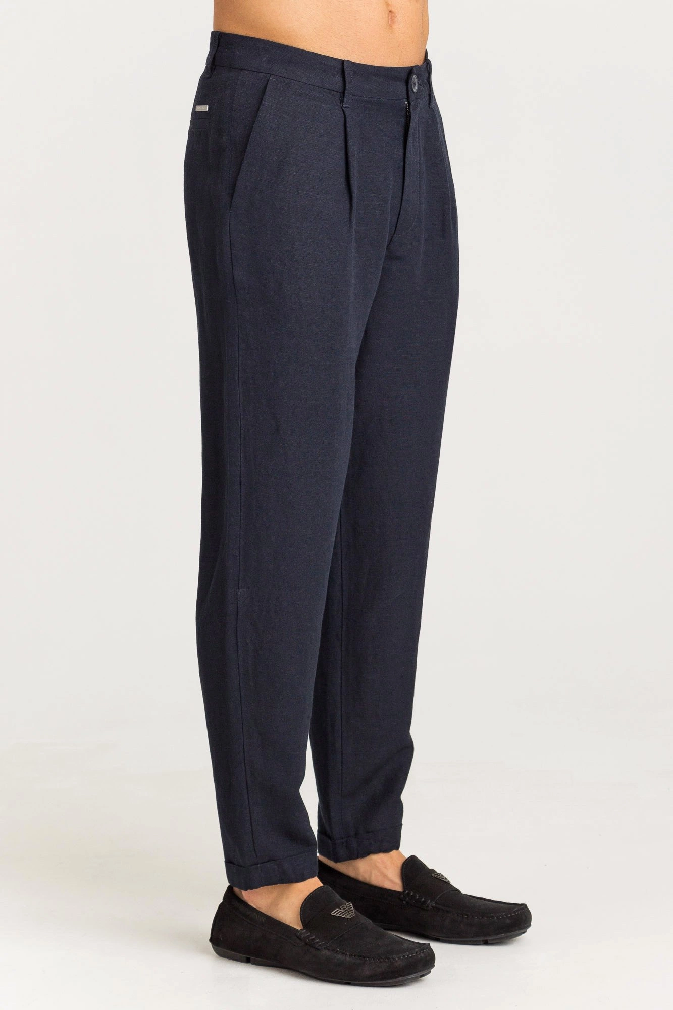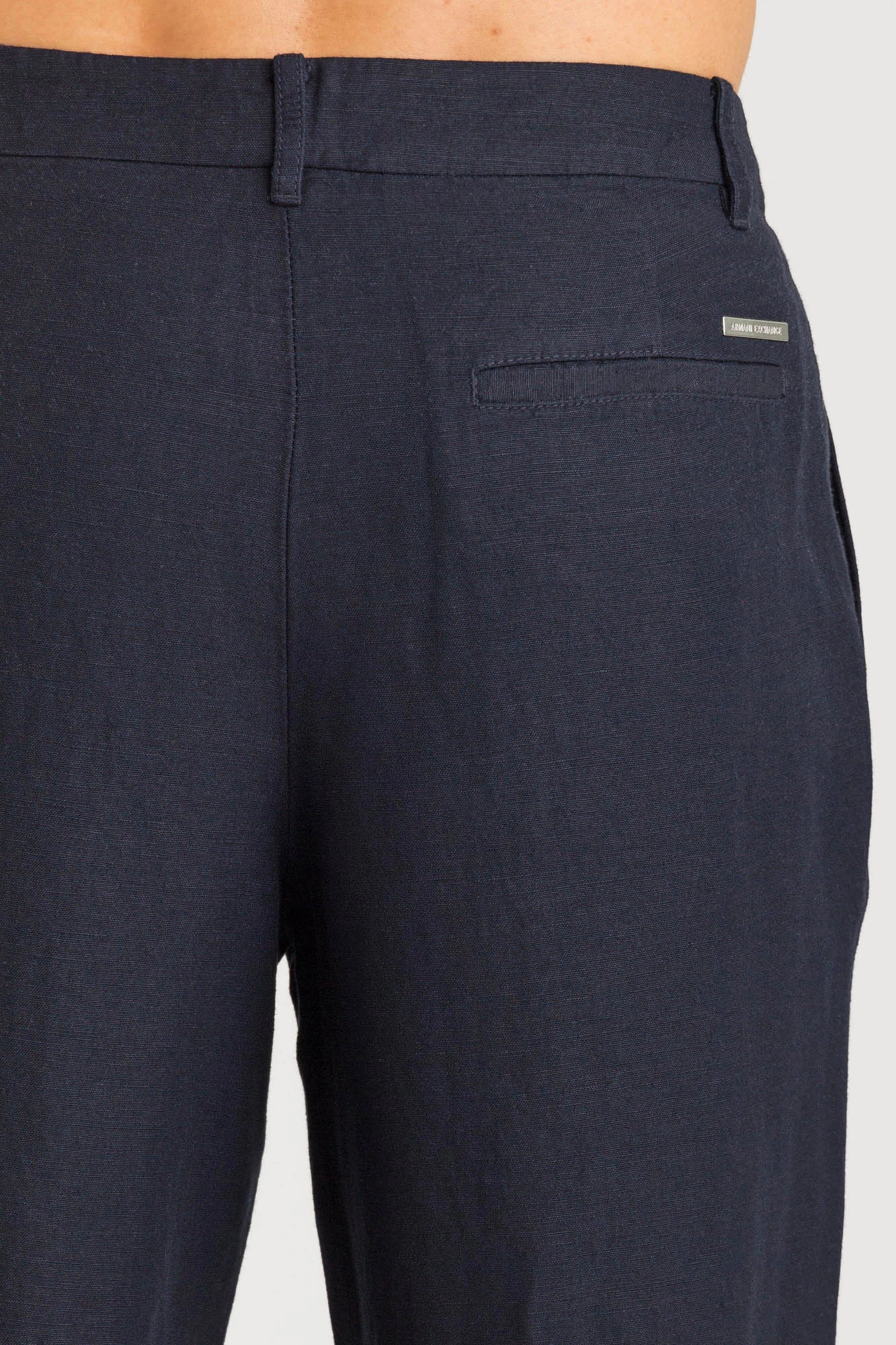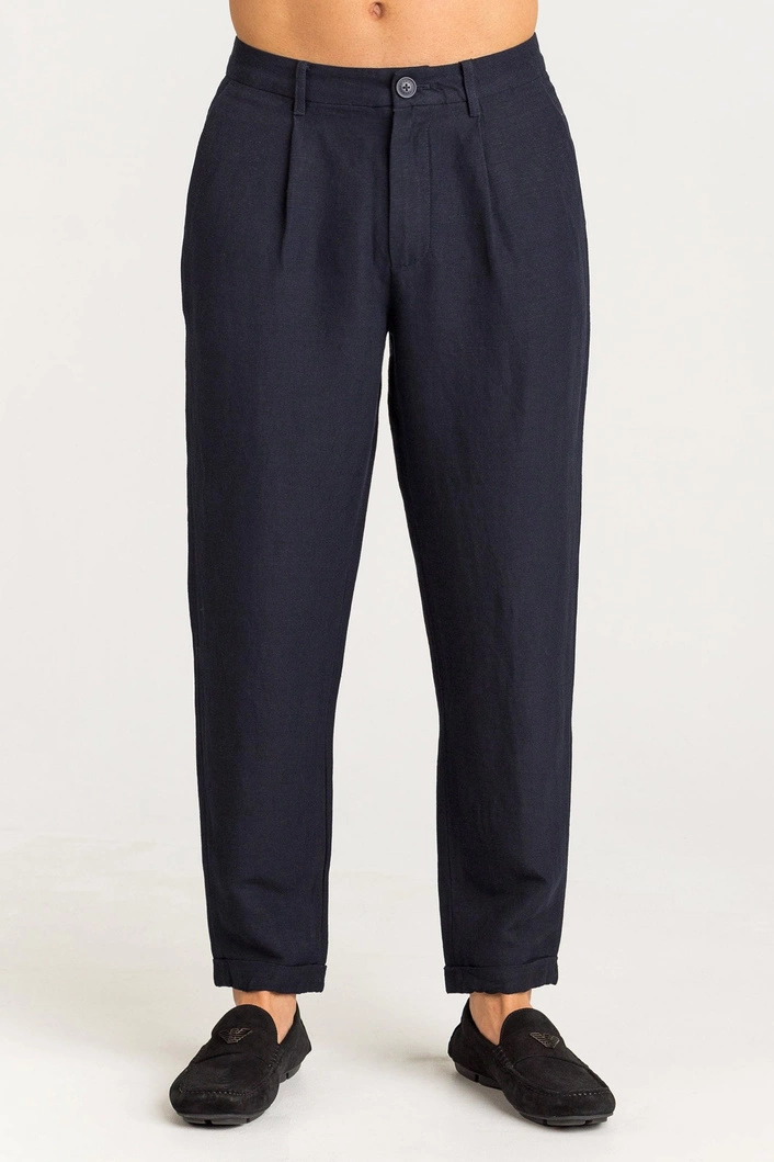 Spodnie w ciemnogranatowym kolorze o prostym, luźnym fasonie. Zapinane na kryty zamek i guzik, sygnowany logo marki. Z przodu dwie boczne kieszenie. Nogawki wykończone mankietem. Z tyłu dwie kieszenie bez patki. Nad lewą metalowa aplikacja logo marki. Wykonane z lnu z domieszką wiskozy. Zwiewne, wygodne i przyjemne w dotyku.