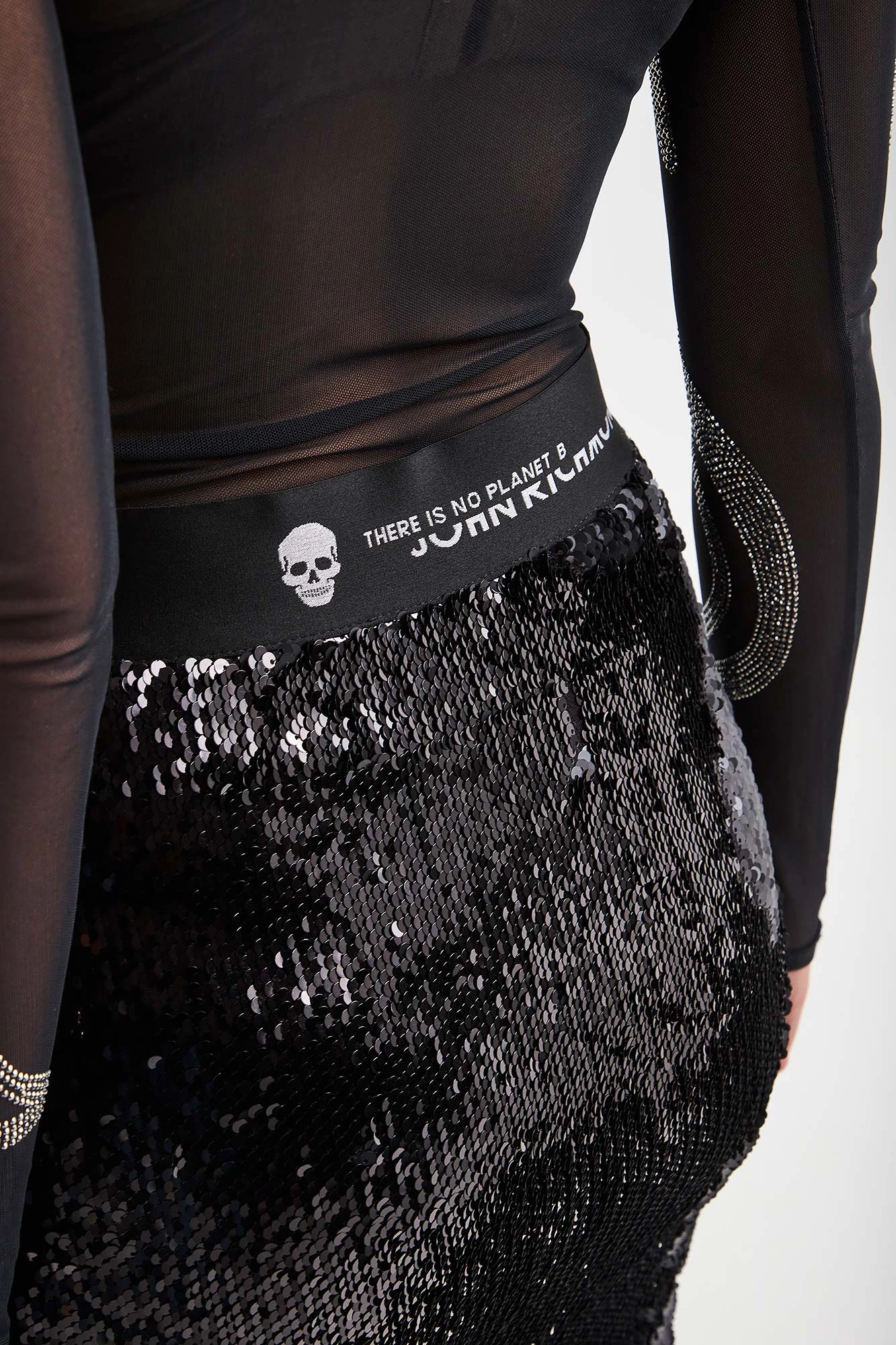 Spódnica cekinowa w kolorze czarnym. Prosty krój. W pasie sygnowana, elastyczna guma. Po boku zapinana na czarny, kryty zamek. Z przodu delikatna, półprzeźroczysta falbanka. Długości mini.