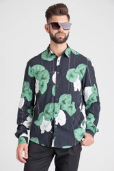 Czarna koszula w wielokolorowy wzór o prostym kroju. Kołnierzyk prosty typu kent. Zapinana na niewielkie czarne guziki, sygnowane logo marki. Rękawy wykończone ściętym mankietem, zapinanym na jeden guzik. Koszula wykonana z wysokiej jakości wiskozy. Zwiewna, przyjemna w dotyku i delikatna.