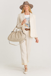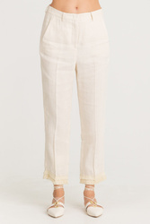 Spodnie o prostym kroju w kolorze kremowym. Nogawki luźne, z kantem. Zapinane na zamek i szlufkę. Z przodu dwie niezapinane kieszenie. Nogawki wykończone dwoma rzędami strzępień w tym samym kolorze. Z tyłu dwie kieszenie bez patki, zapinane na jeden guzik. Wykonane z wysokiej jakości lnu.