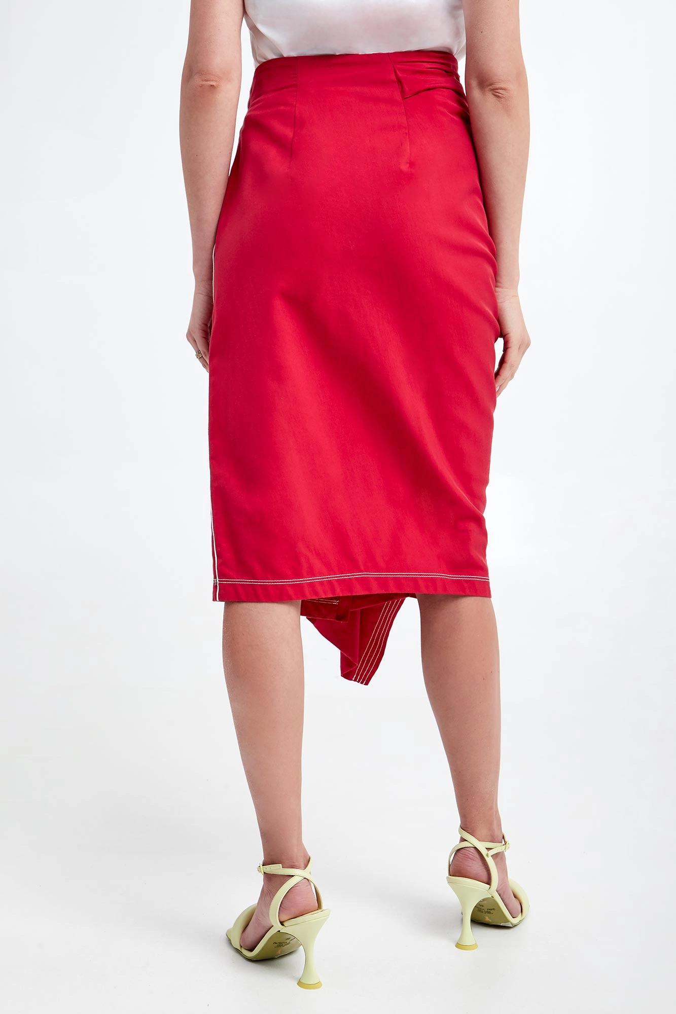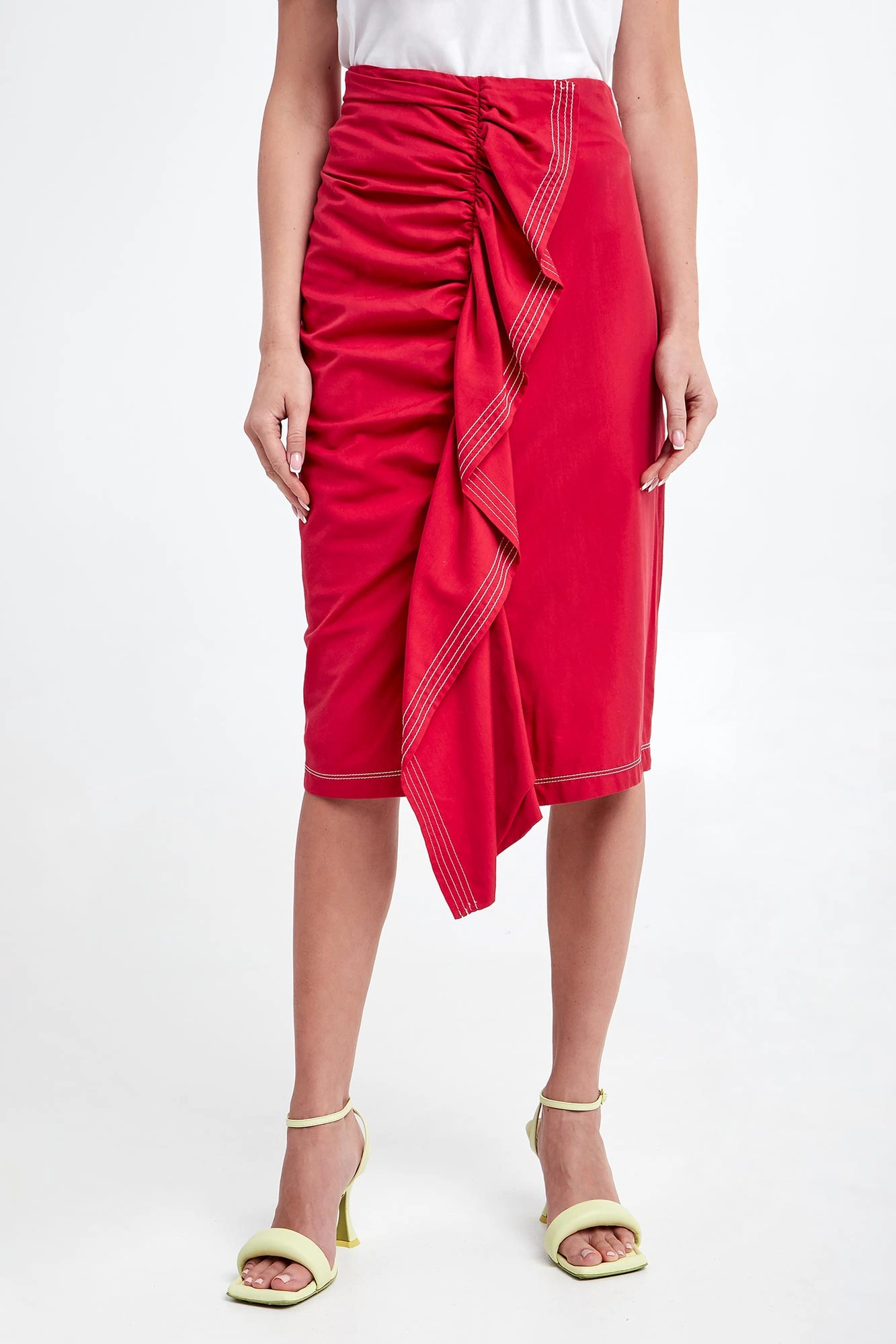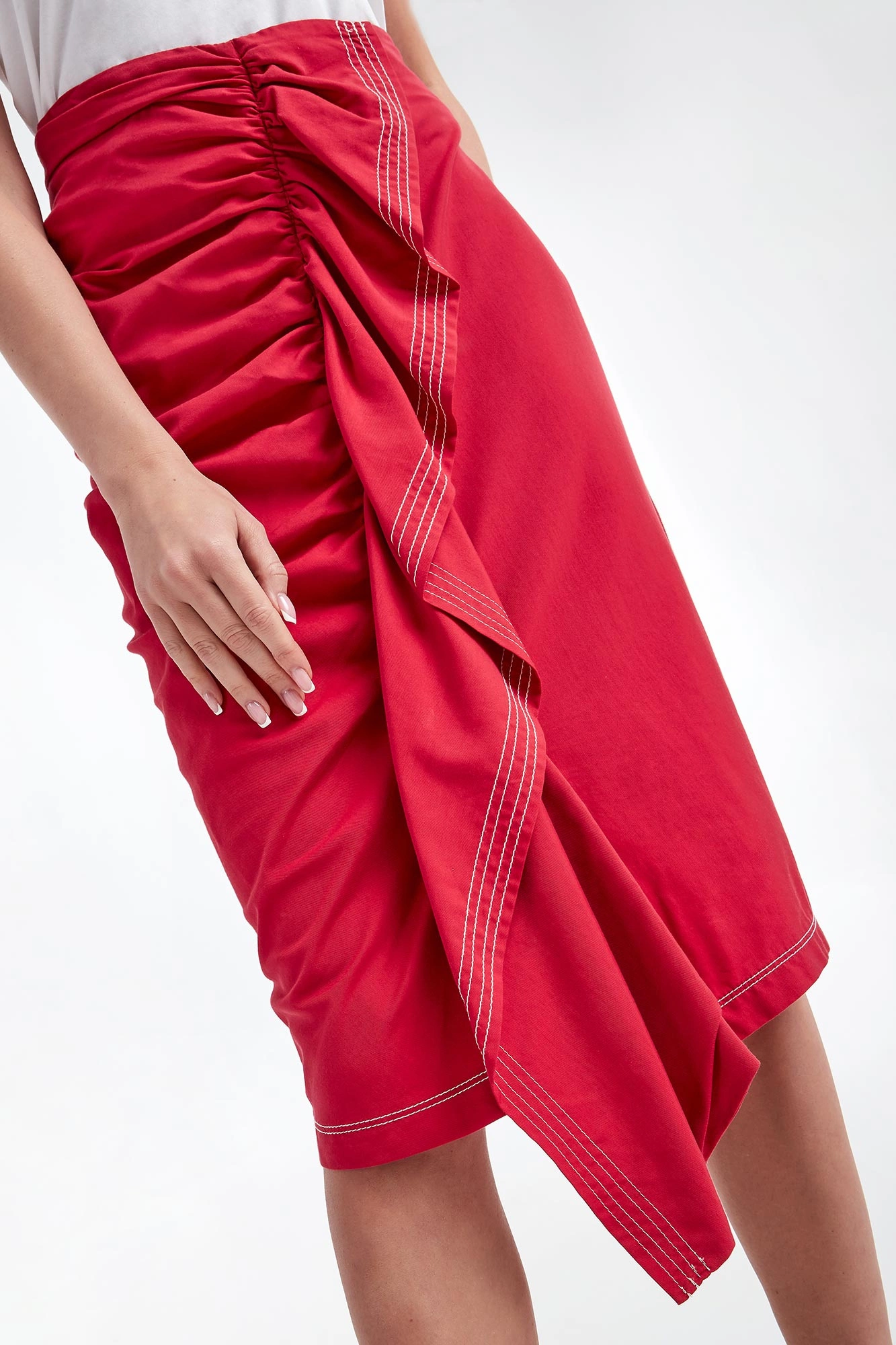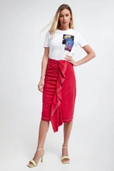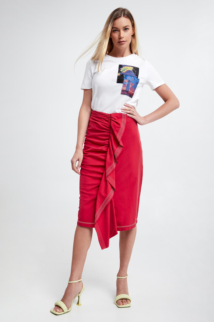Spódnica marki Sportmax Code w czerwonym kolorze. Wykonana z gładkiego, bawełnianego materiału. Wysoki stan. W pasie, od wewnątrz elastyczny ściągacz. Po boku drapowanie z falbaną na całej długości. Zapinana na zamek boczny oraz zatrzask. Kontrastowe szwy w białym kolorze. Fason typu slim, długość midi.