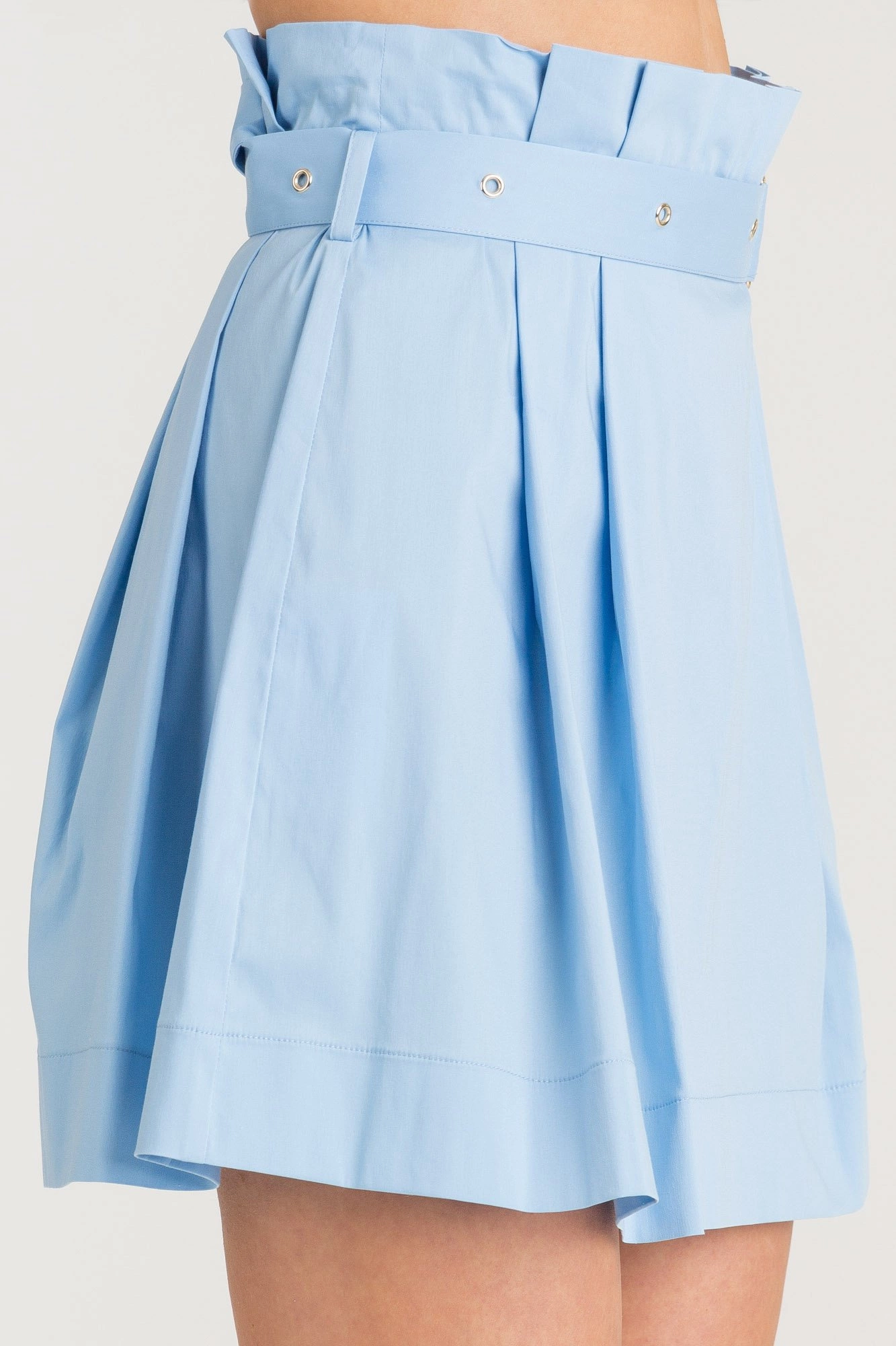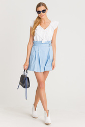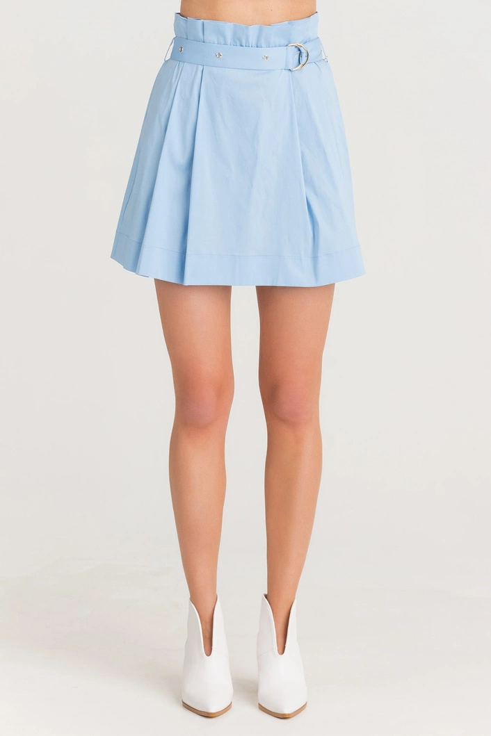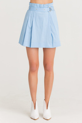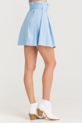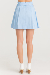 Błękitna spódnica z falbanami. Elastyczny pas, wykończony drobnymi falbanami. W komplecie pasek z tego samego materiału. Wykonana z wysokiej jakości bawełny. Wygodna, przyjemna w dotyku i lekka. Długość mini.